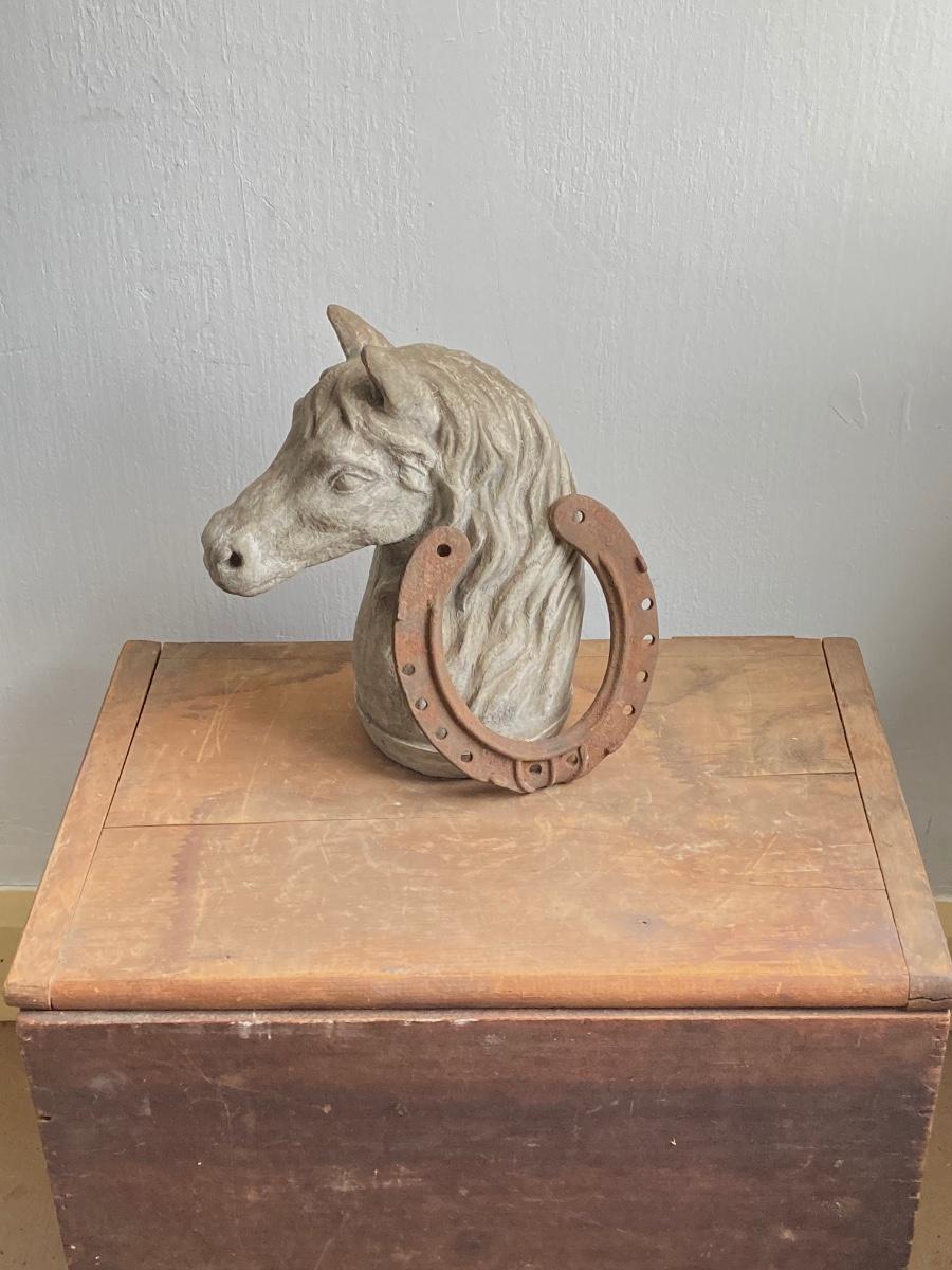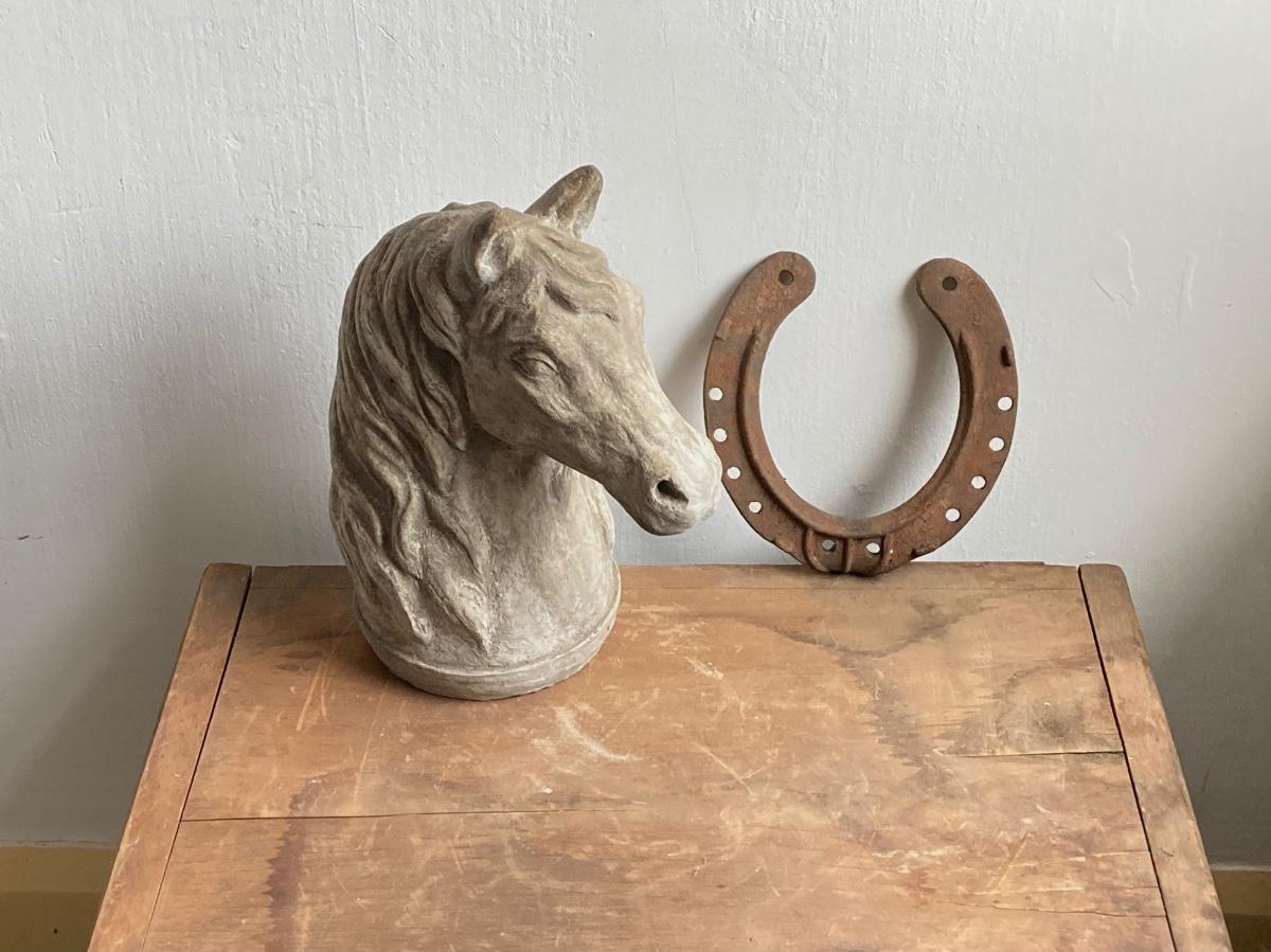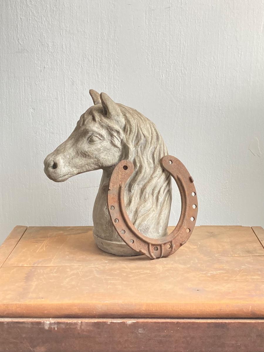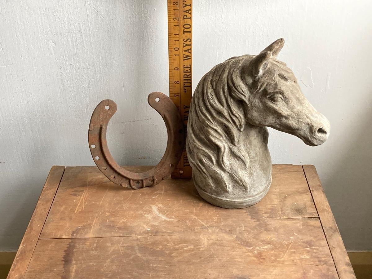 LOT 54: Vintage Concrete Horse Statue and Horse Shoe