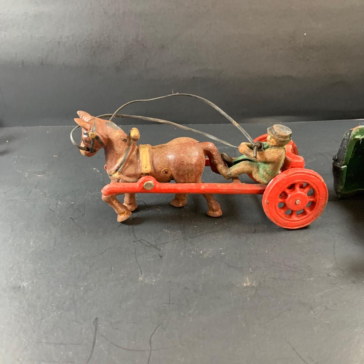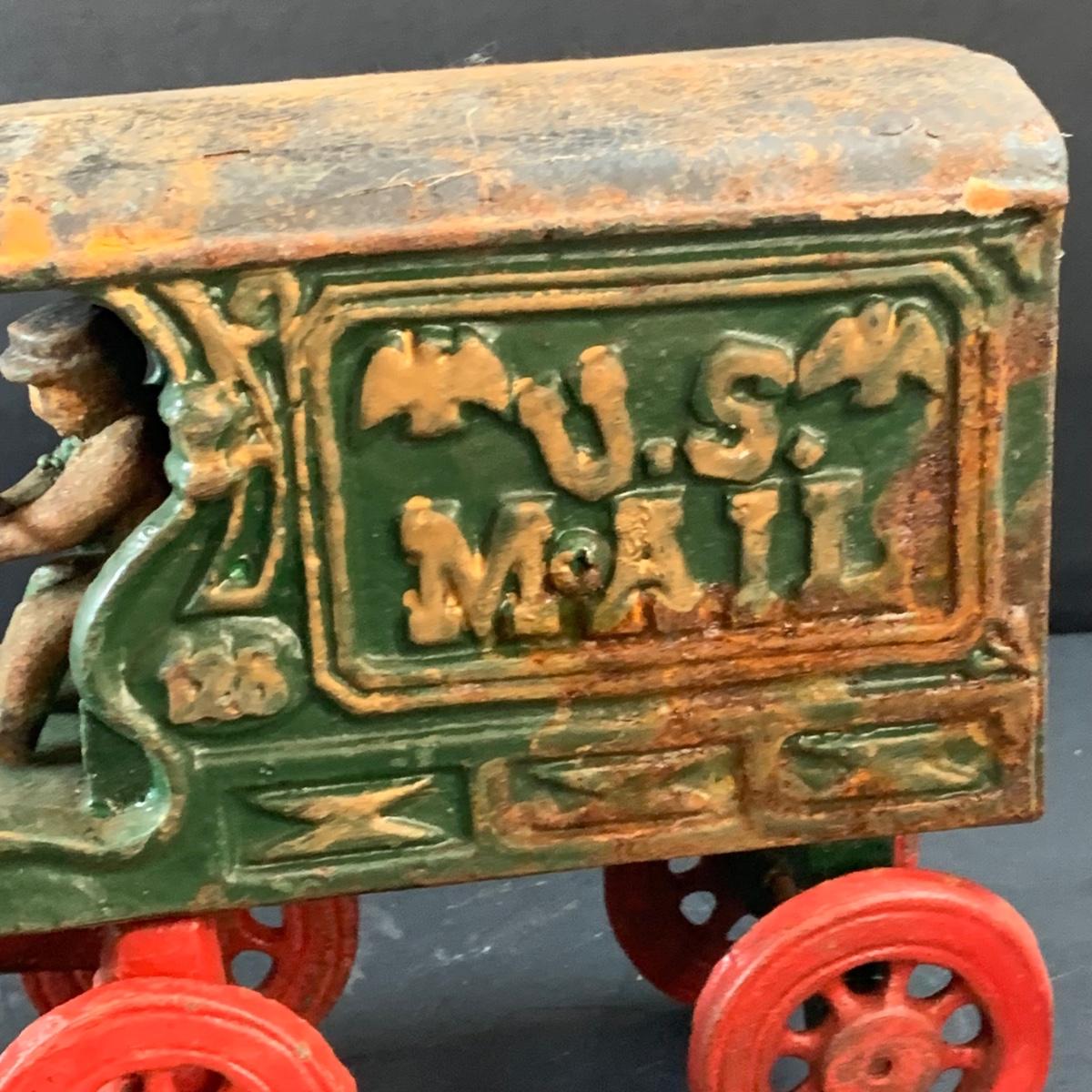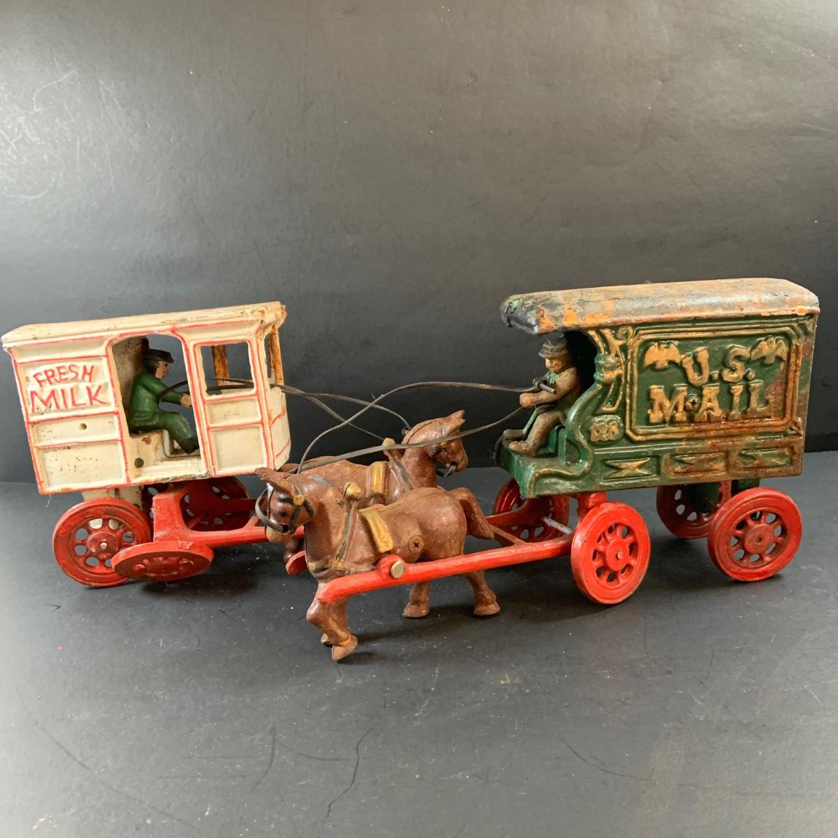 LOT 74: Vintage Cast Iron Horse Drawn Milk Carriage and US Mail Truck