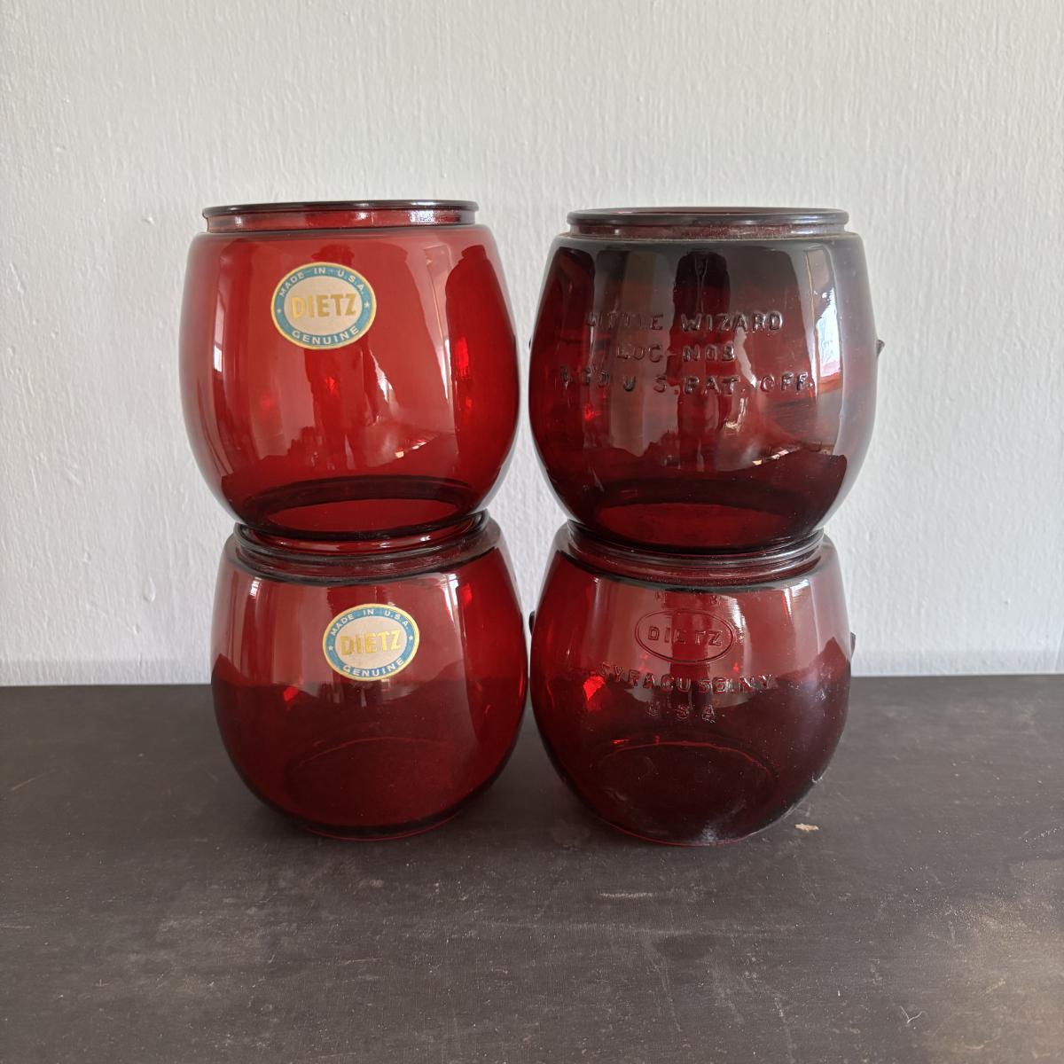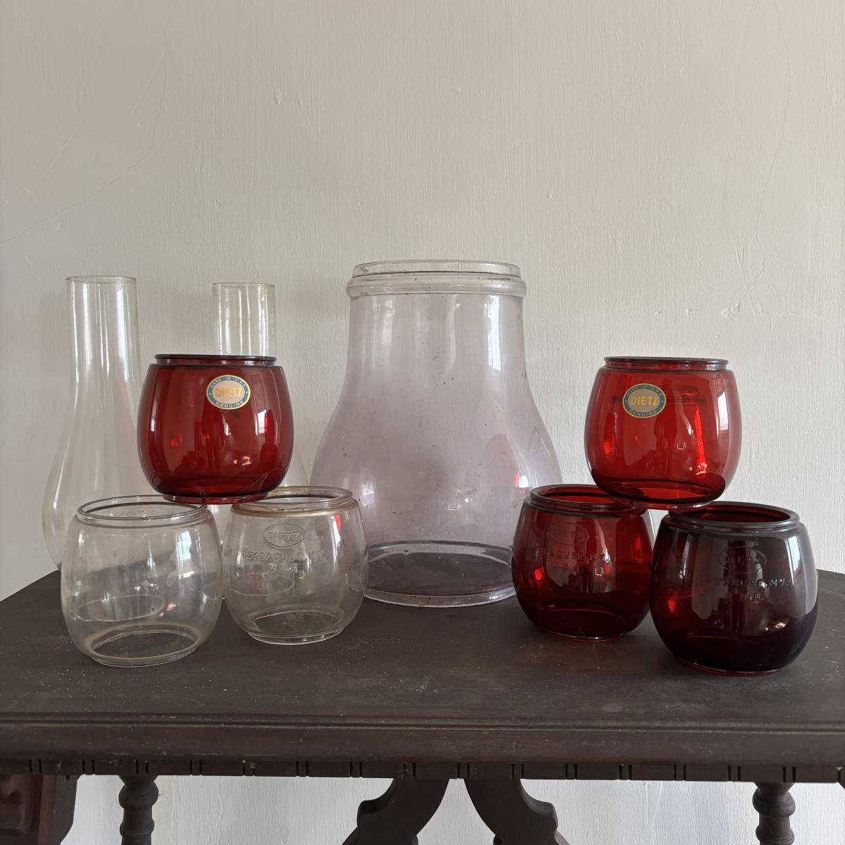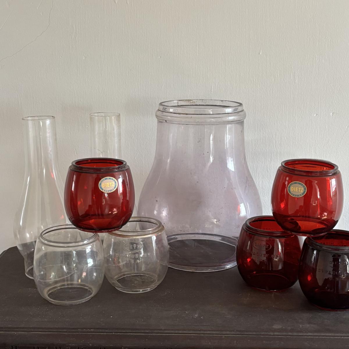 LOT 82: Vintage Oil Lanterns Globes: Unmarked Railroad, Clear & Red Dietz