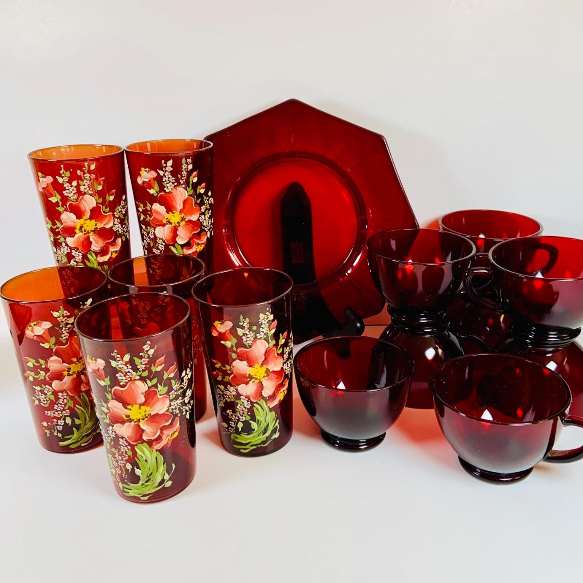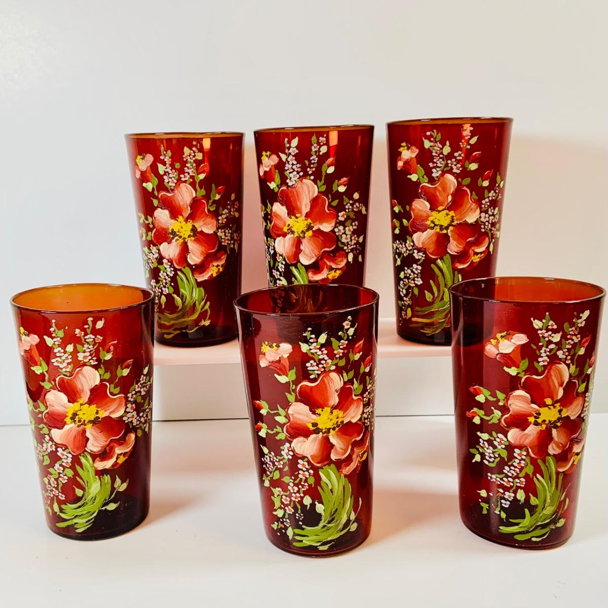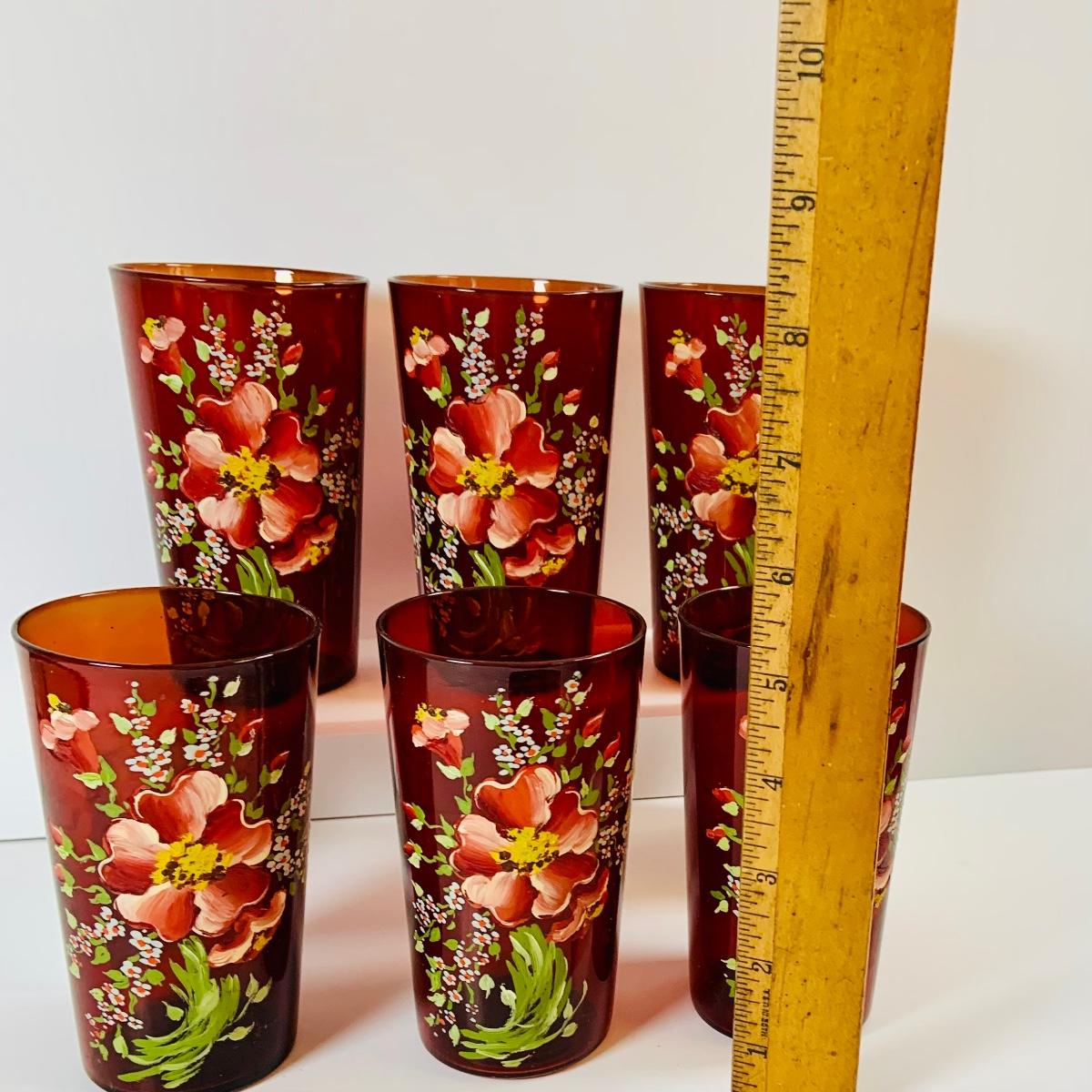 LOT 193: Beautiful Hand Painted Cranberry Glass Tumblers, Cranberry Glass Cups and Plate