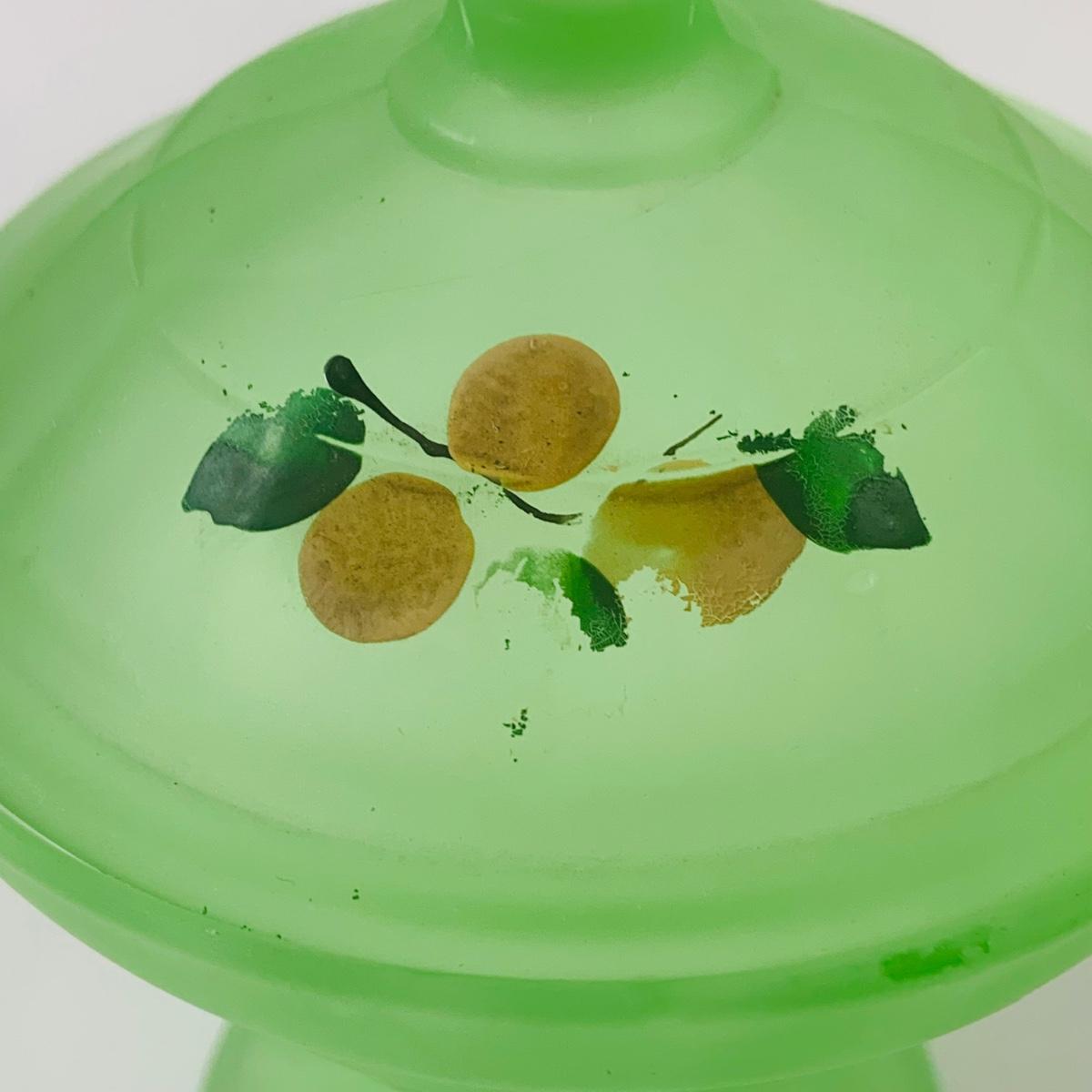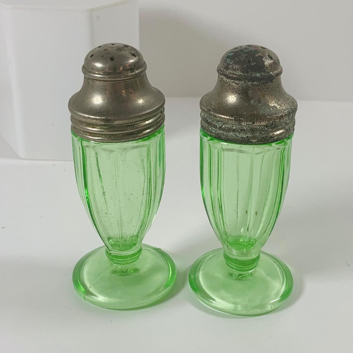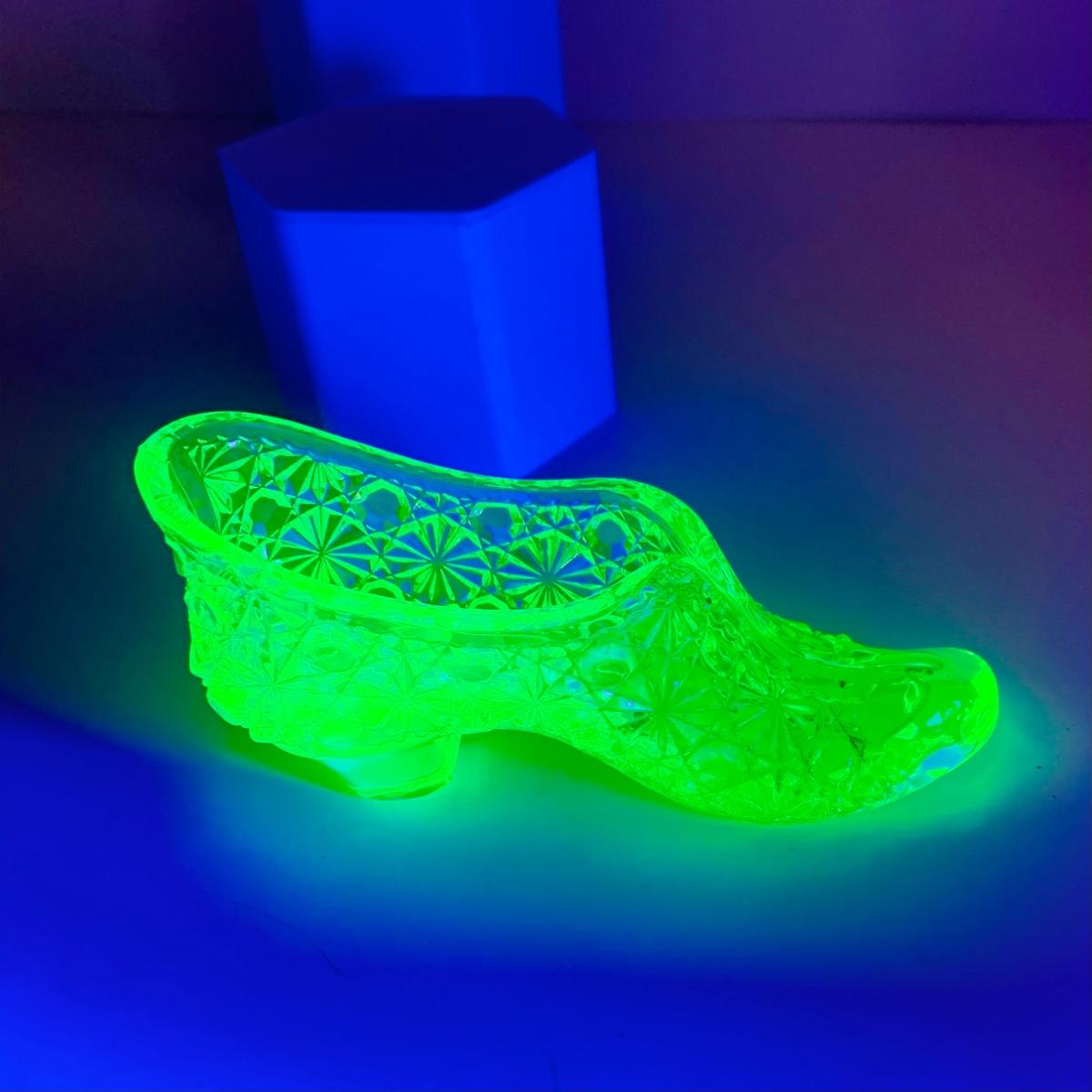 LOT 194: Uranimum Glass Salt and Pepper Shakers, Daisy and Button Vaseline Glass Slipper, Uranium Glass Covered Candy Dish with Painted Lid, Milk Glass Bowl and More