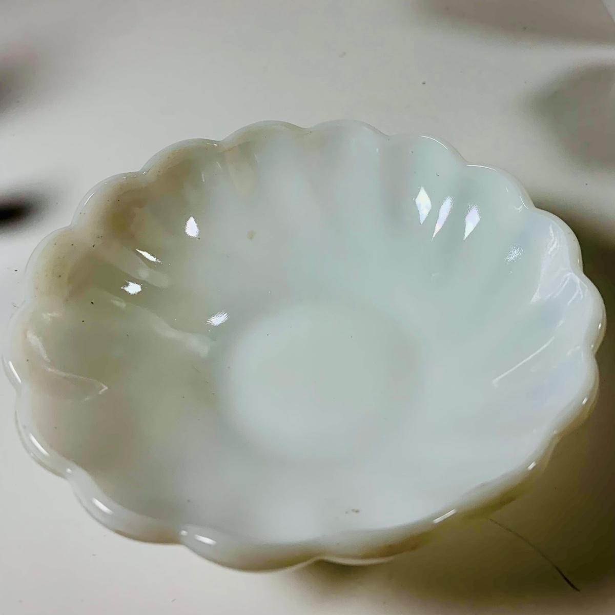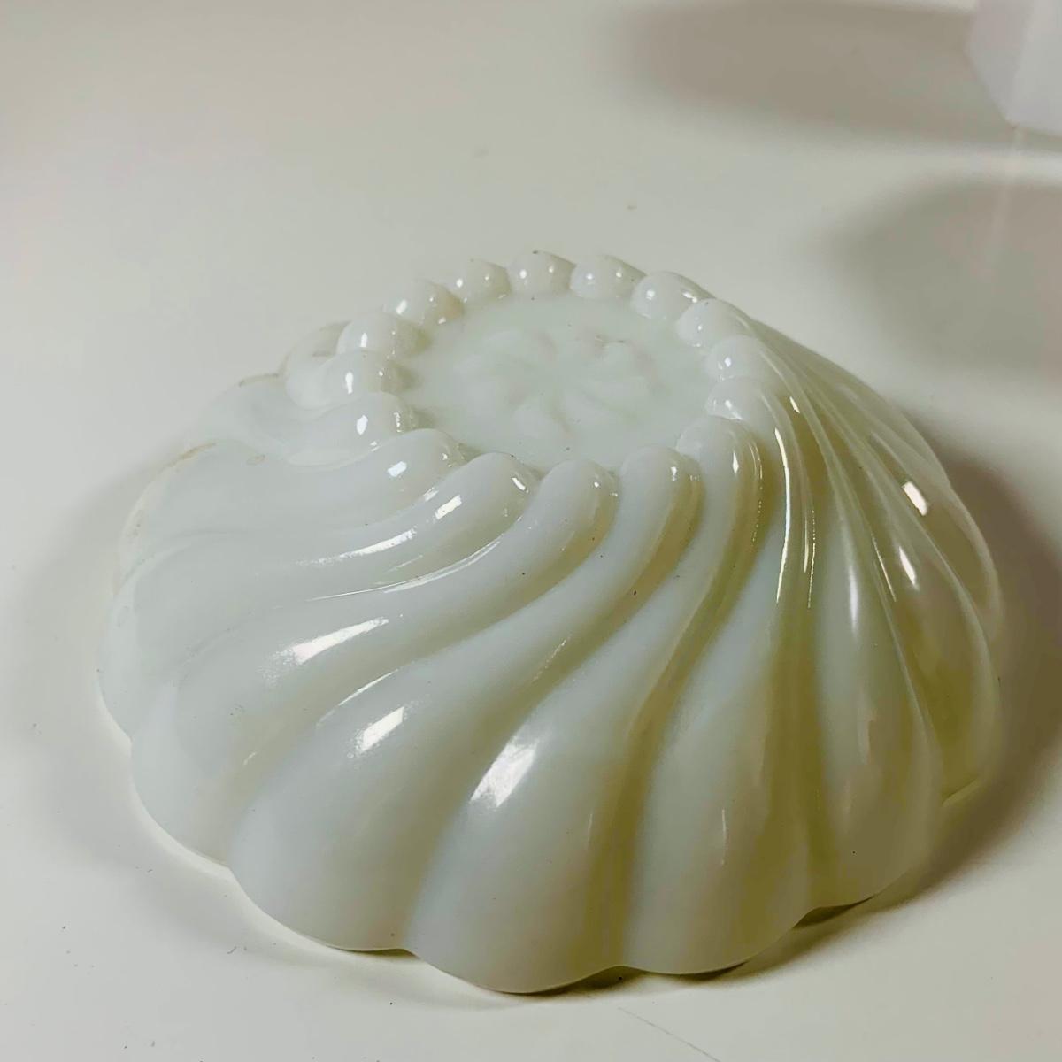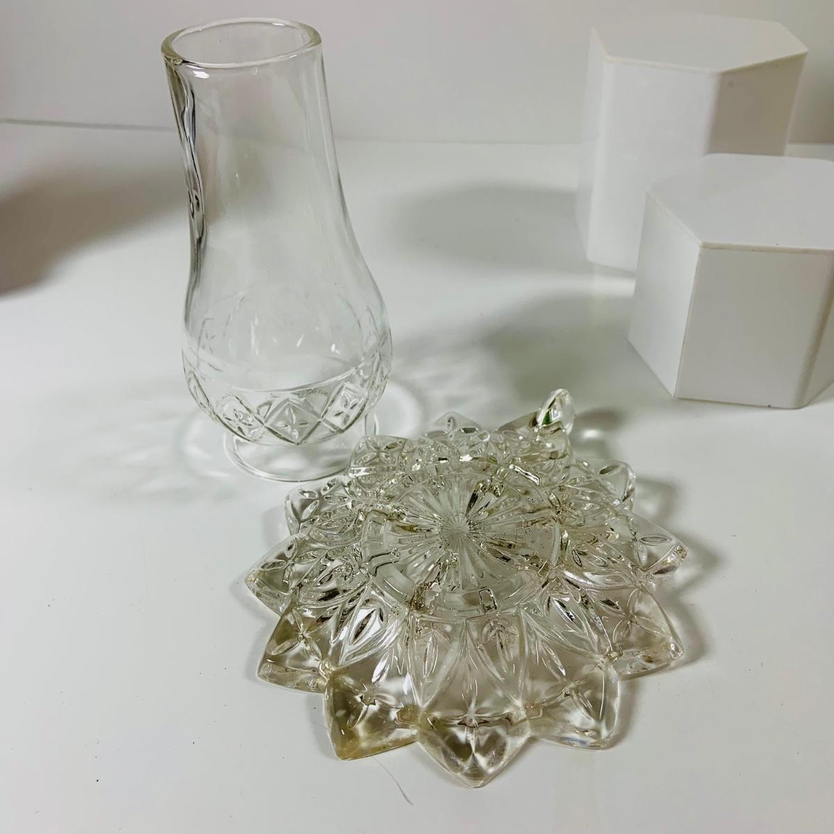 LOT 194: Uranimum Glass Salt and Pepper Shakers, Daisy and Button Vaseline Glass Slipper, Uranium Glass Covered Candy Dish with Painted Lid, Milk Glass Bowl and More