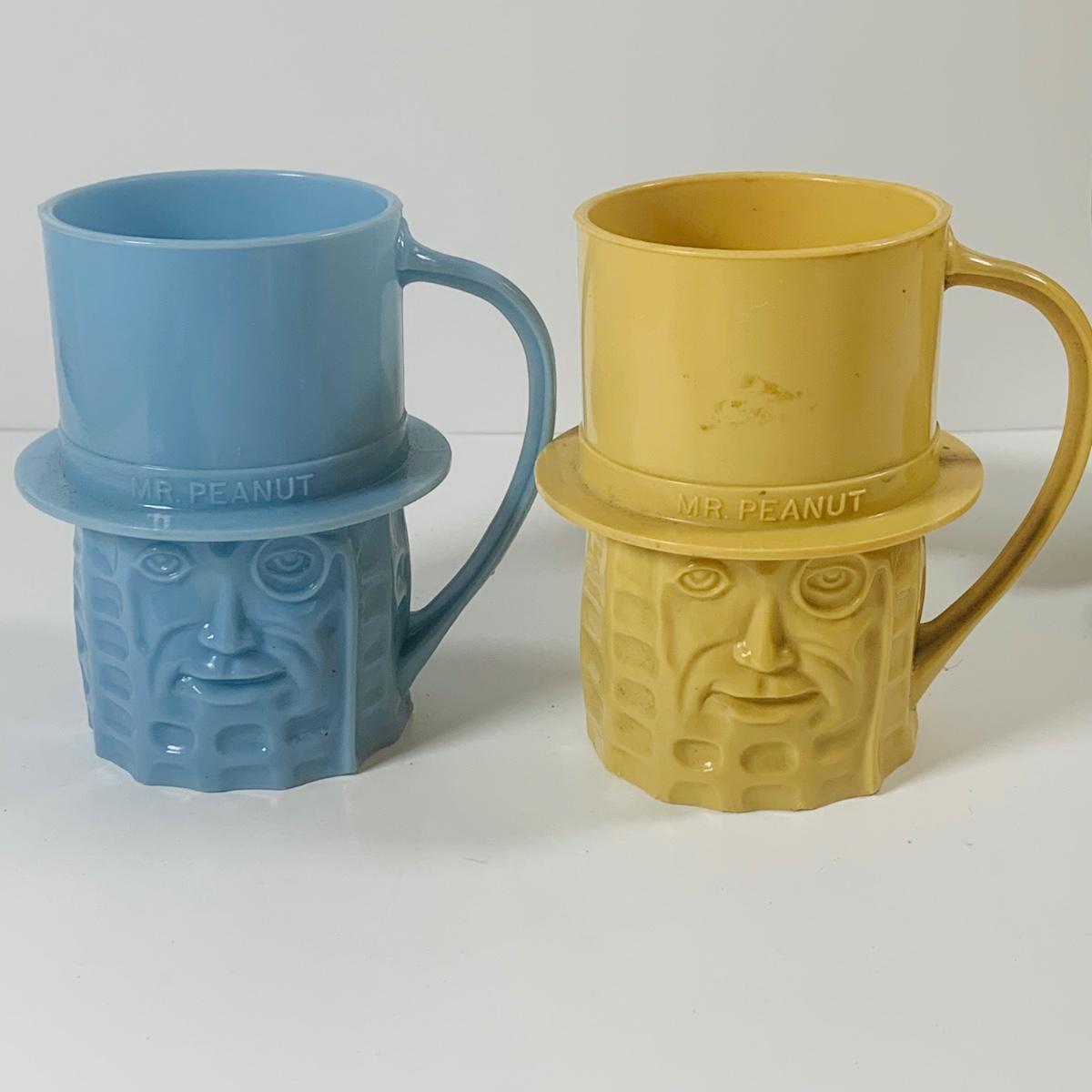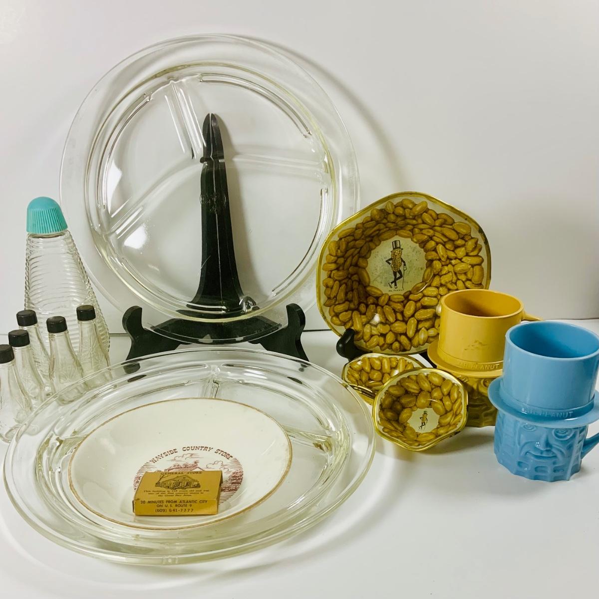 LOT 195: Vintage Planters Peanuts Plastic Cups and Nut Bowls, Clear Pyrex Divided Plates, and Bottles