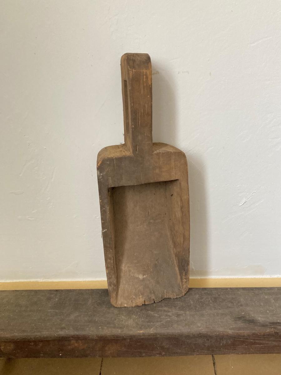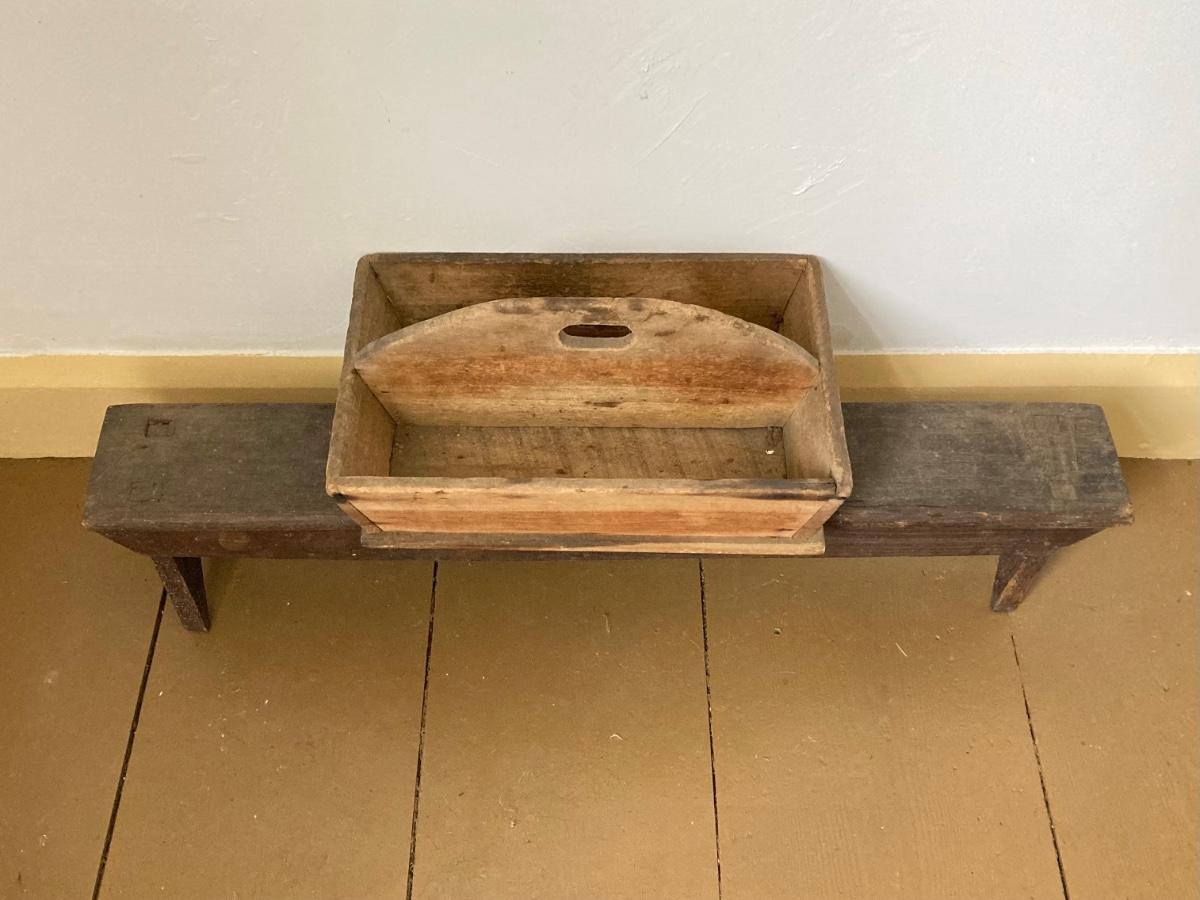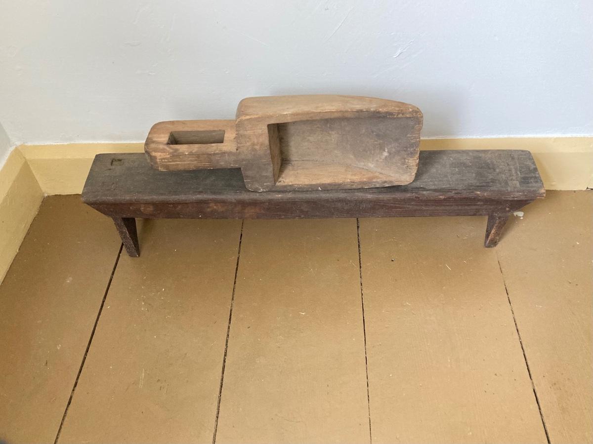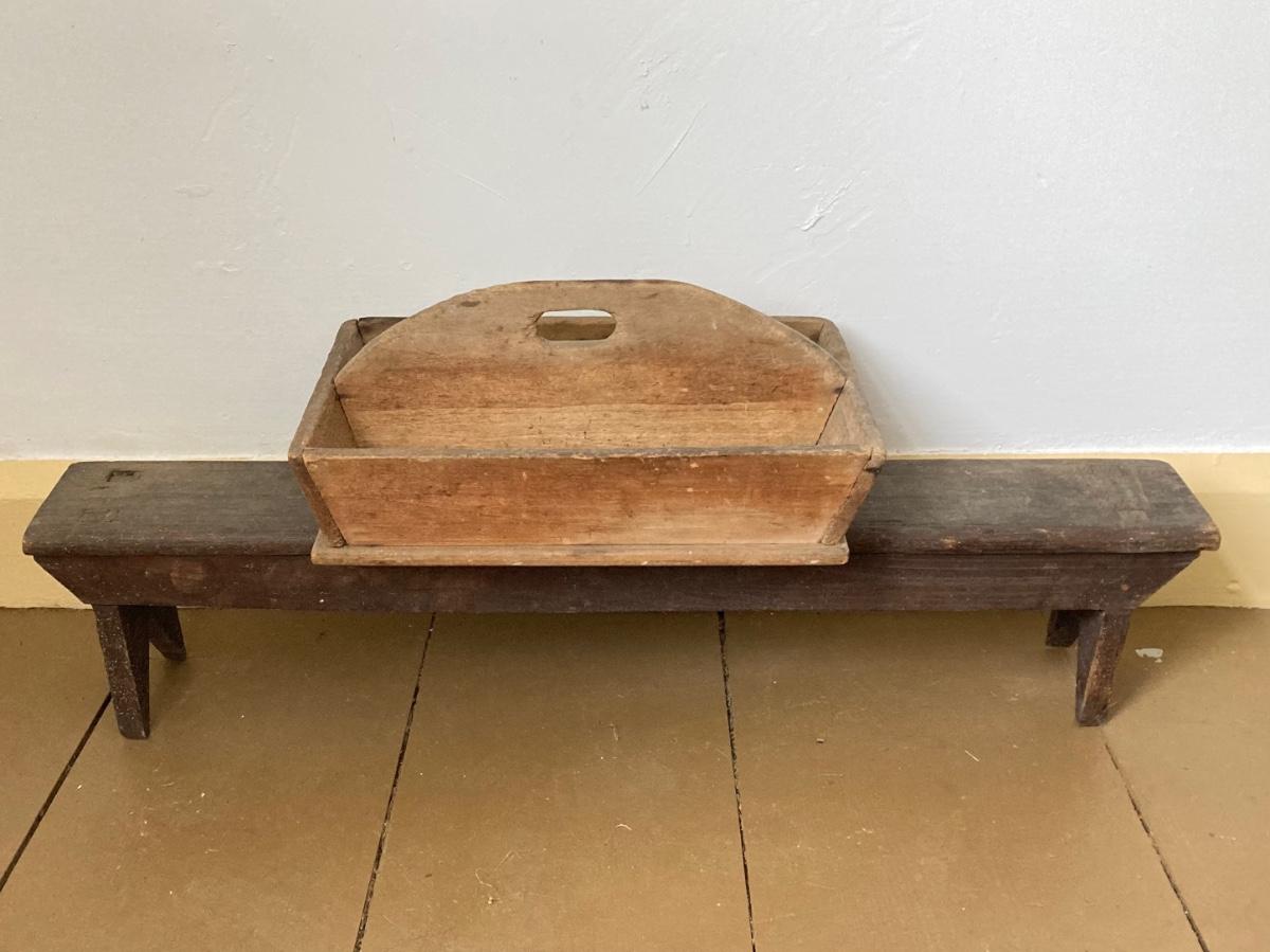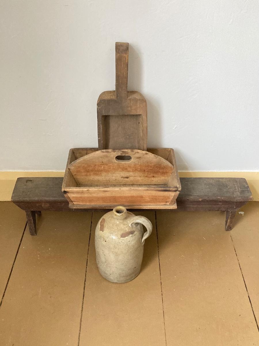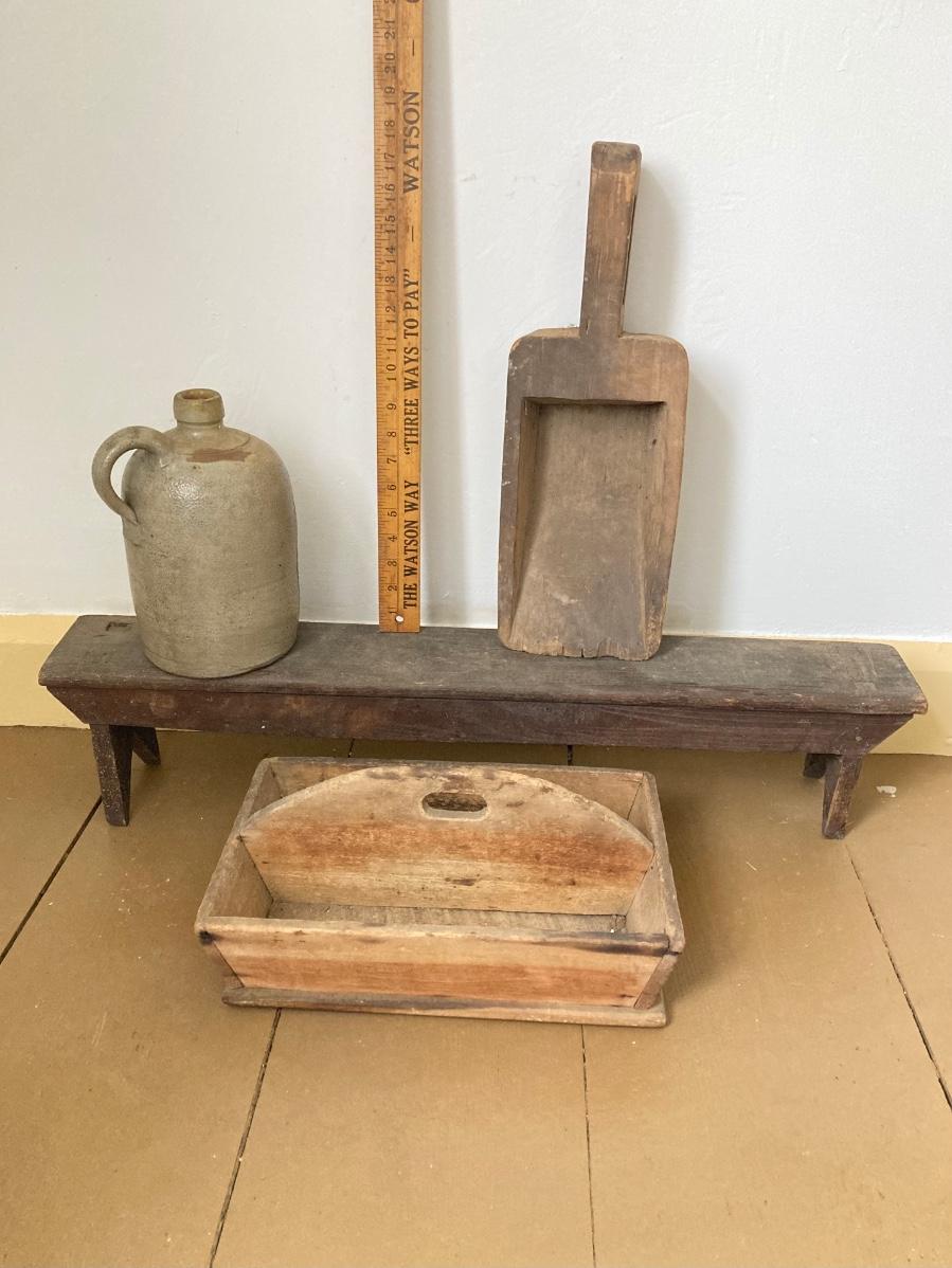 LOT 244: Primitive Collection - Large Wooden Scoop, Divided Box with Handle, Long Shelf and Pottery Jug
