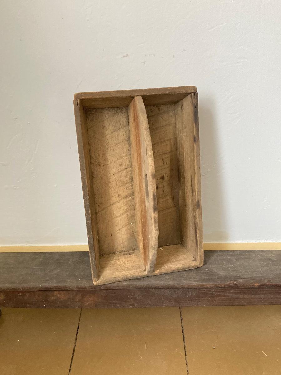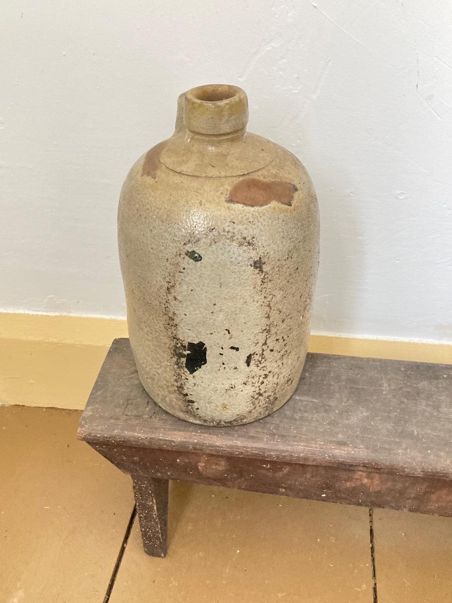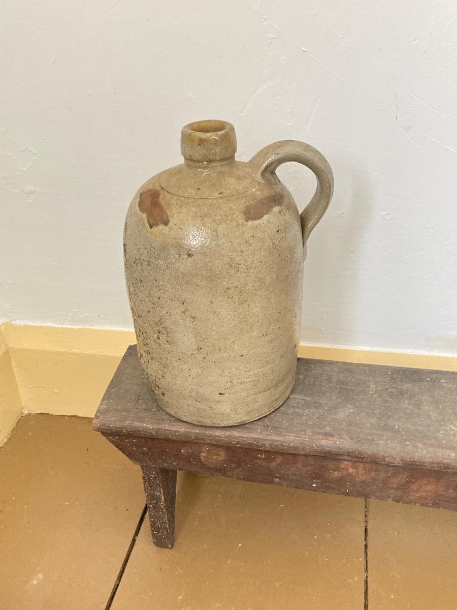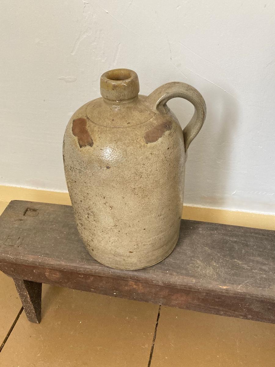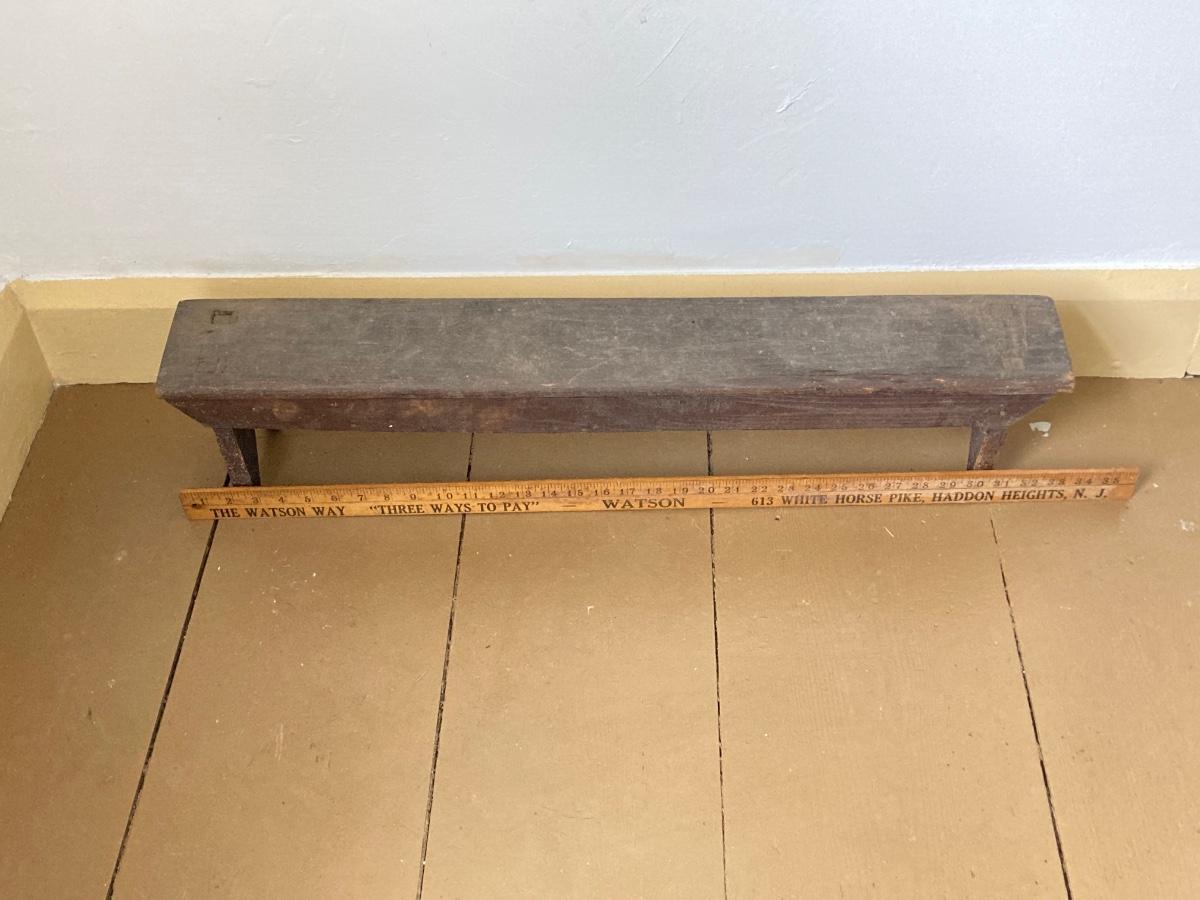 LOT 244: Primitive Collection - Large Wooden Scoop, Divided Box with Handle, Long Shelf and Pottery Jug