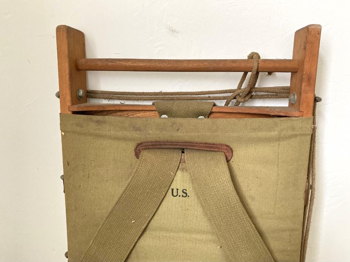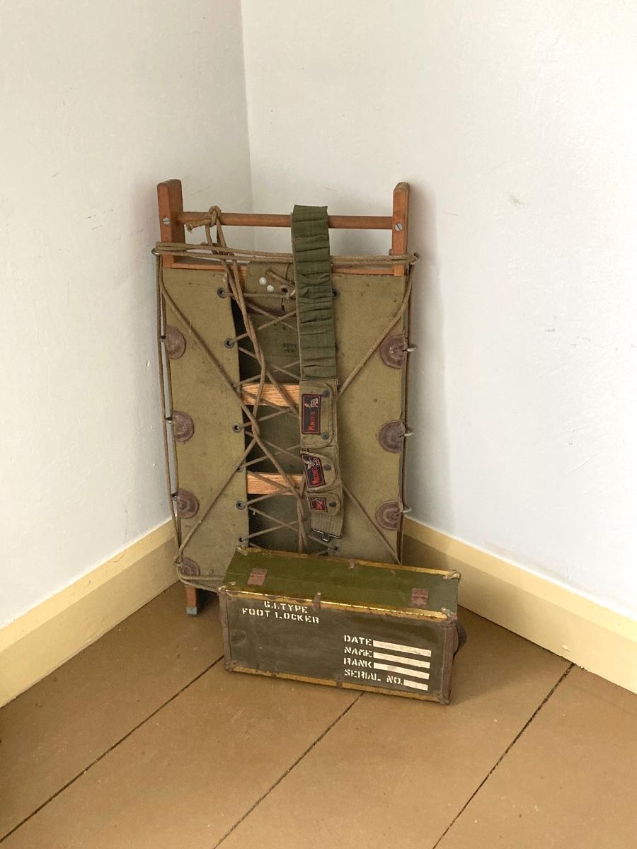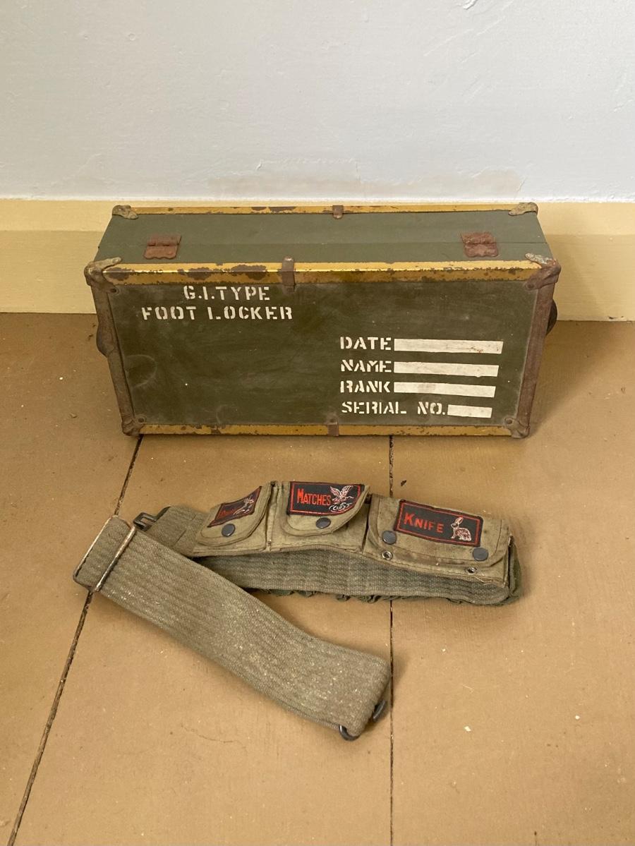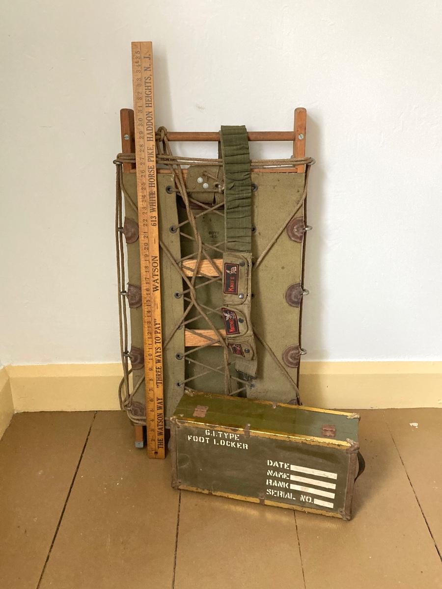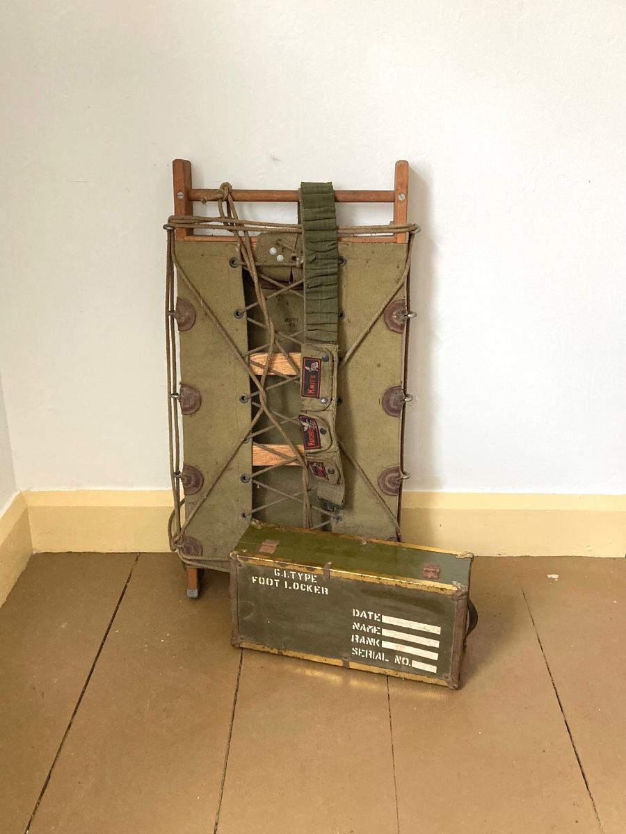 LOT 245: Vintage Military Collection - Pack Board Ladder, G.I. Type Small Foot Locker and Canvas Belt
