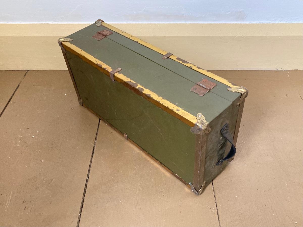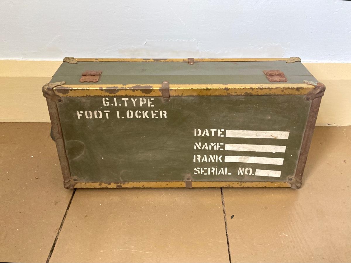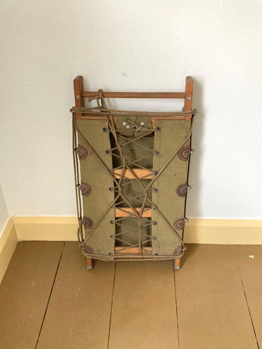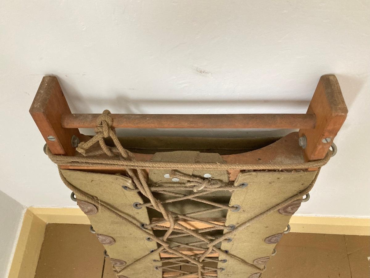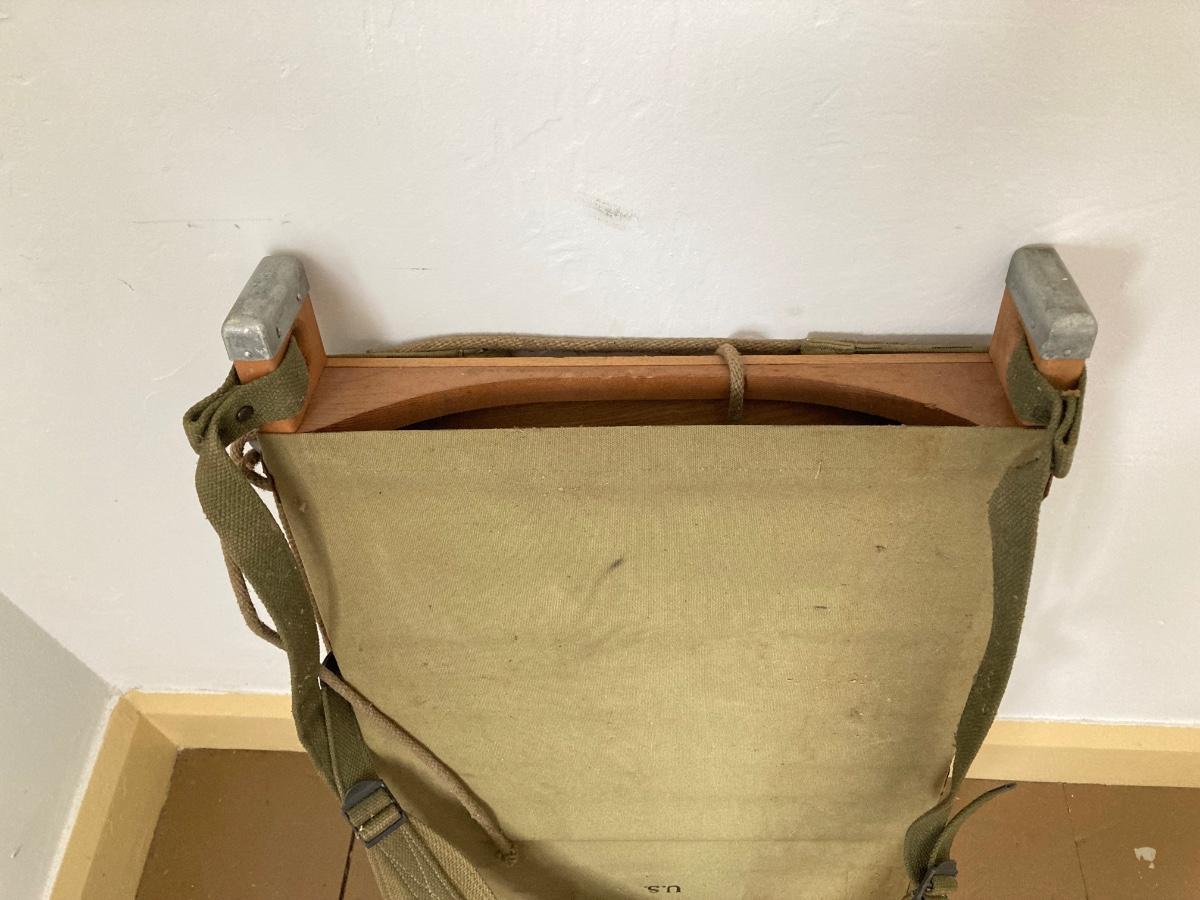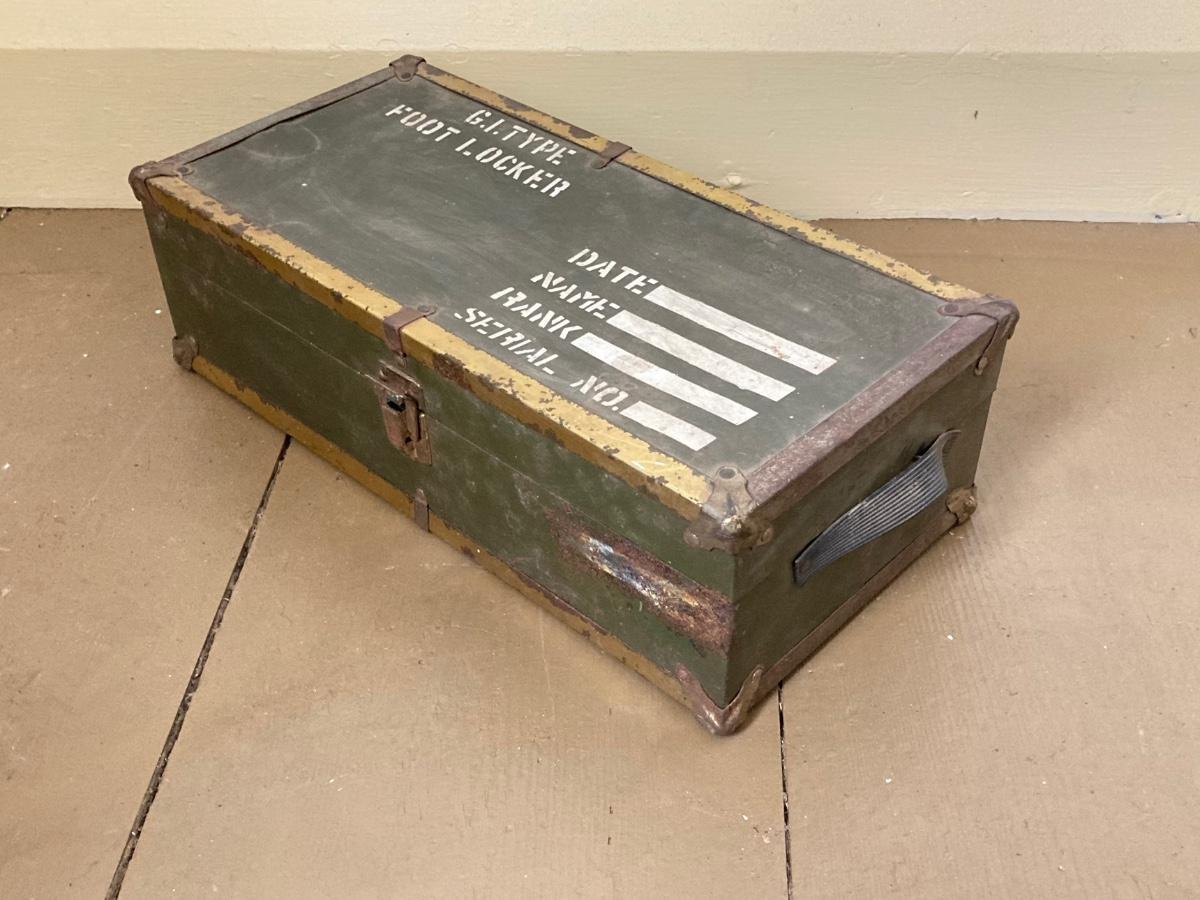LOT 245: Vintage Military Collection - Pack Board Ladder, G.I. Type Small Foot Locker and Canvas Belt