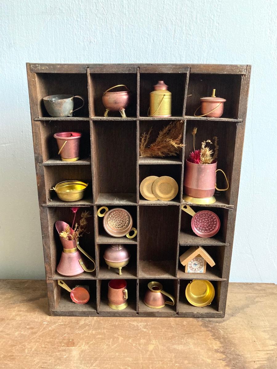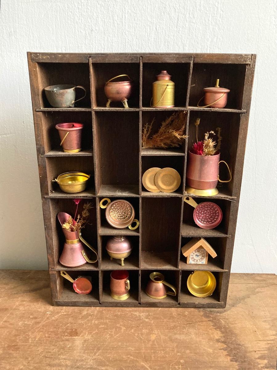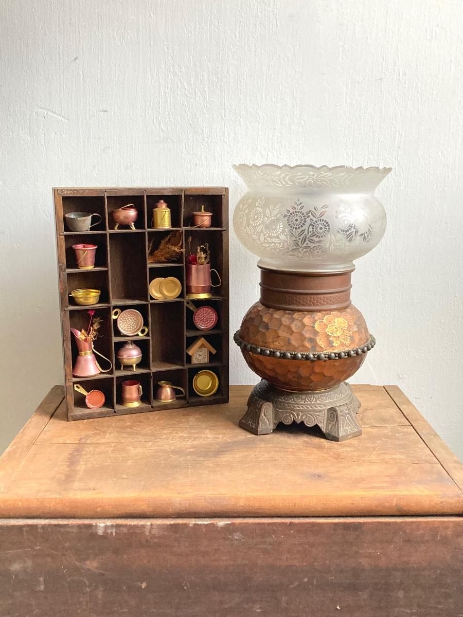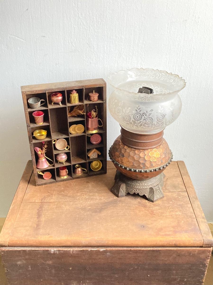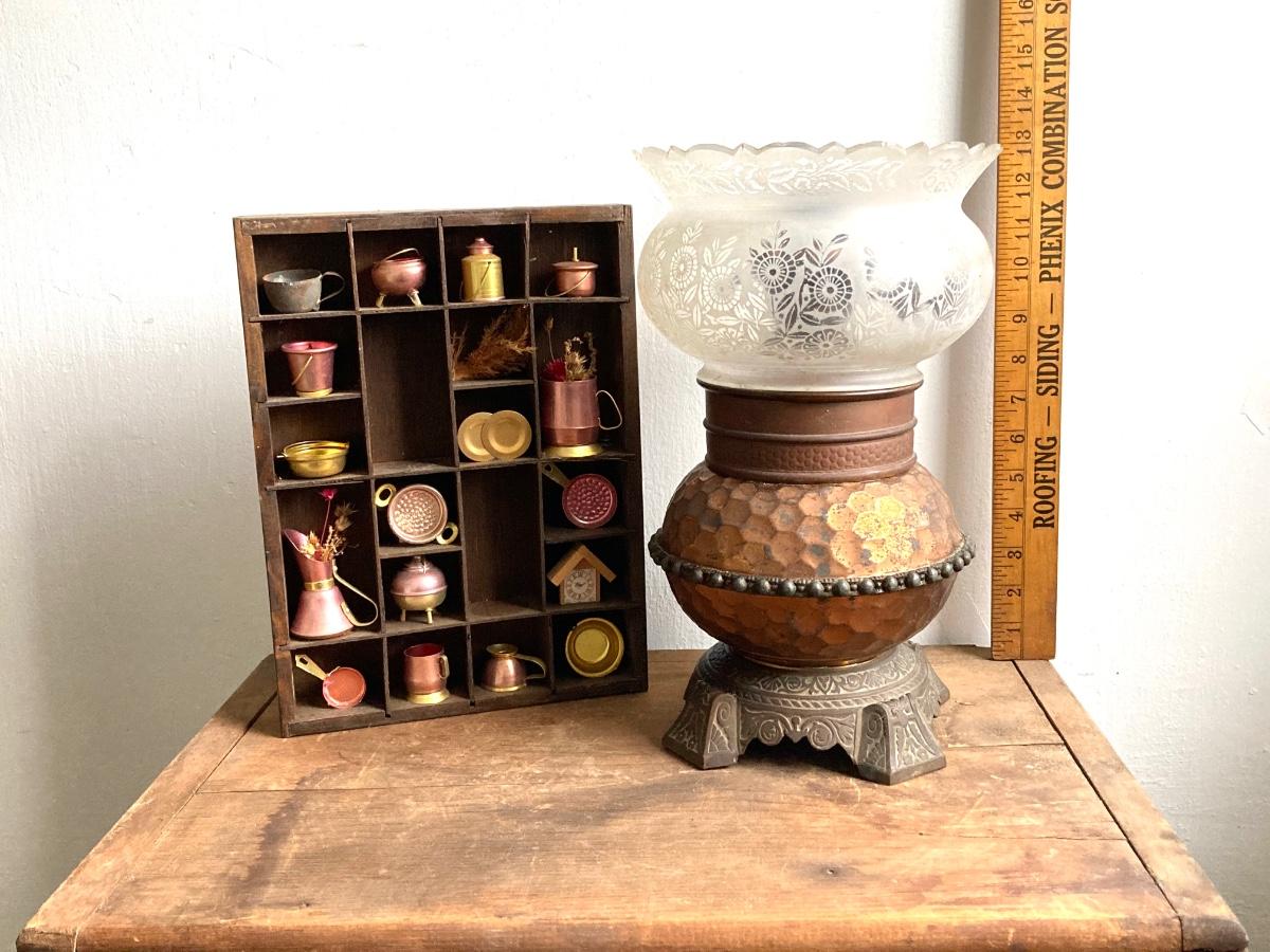 LOT 257: Antique Copper Base / Glass Shade Duplex Lantern and Collection of Miniatures with Wall Display