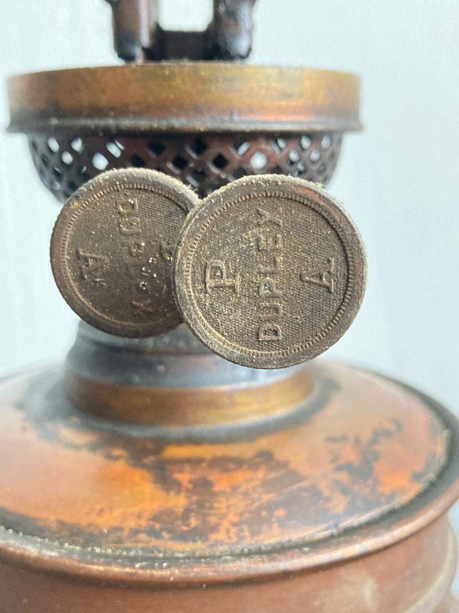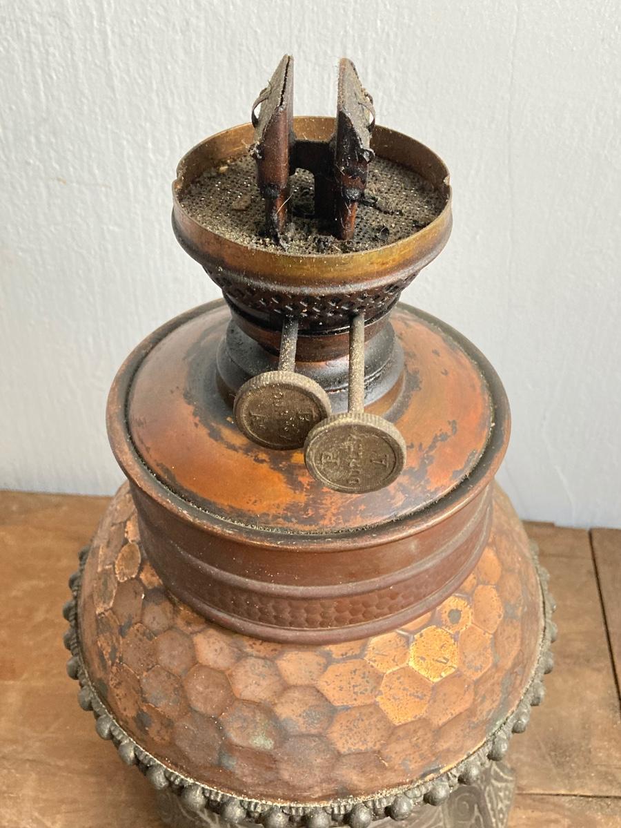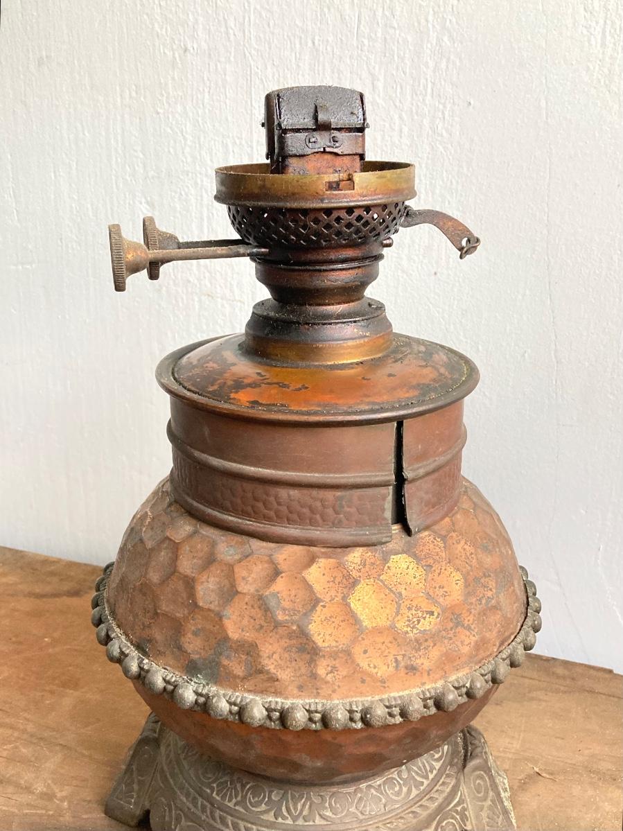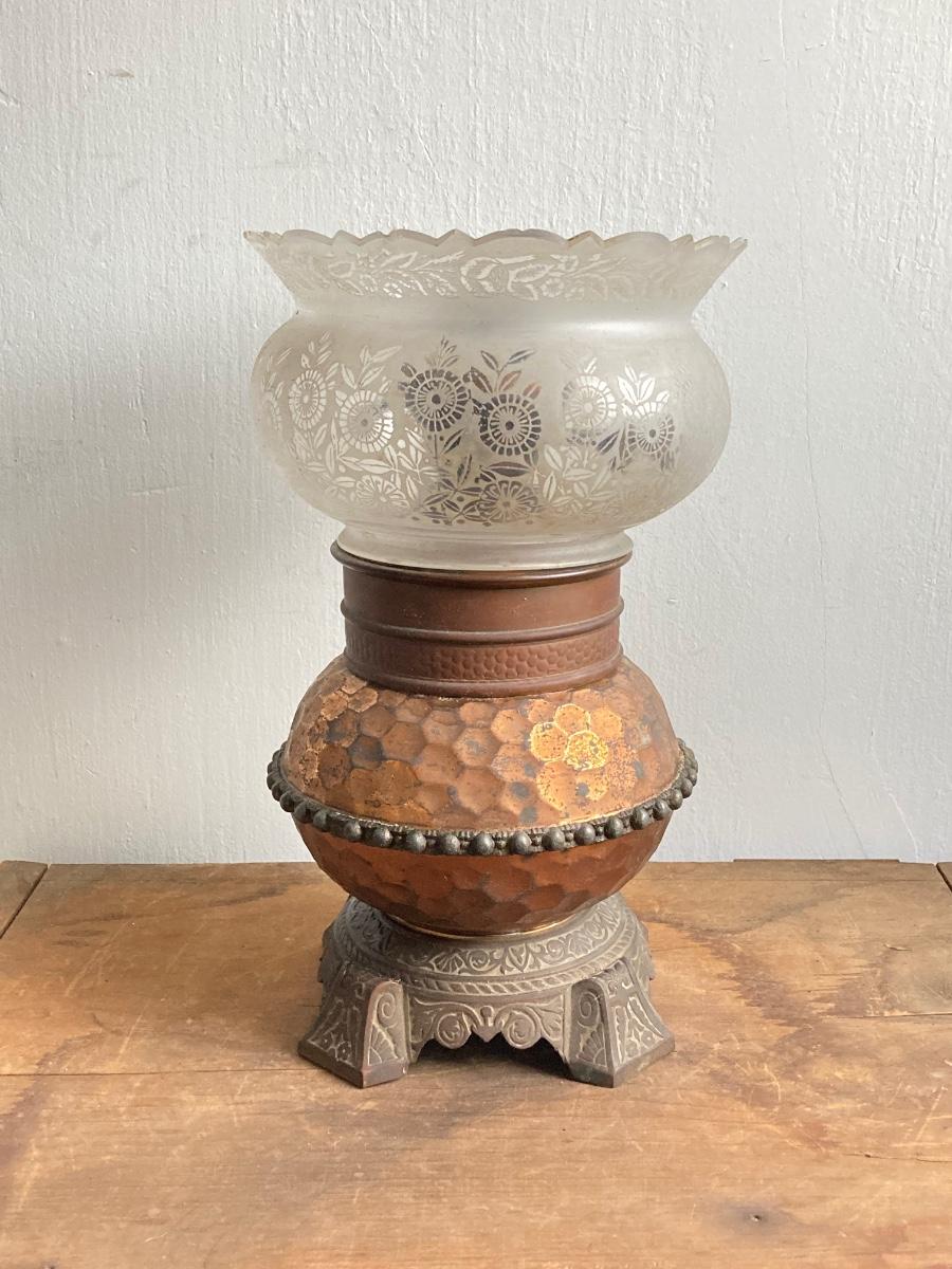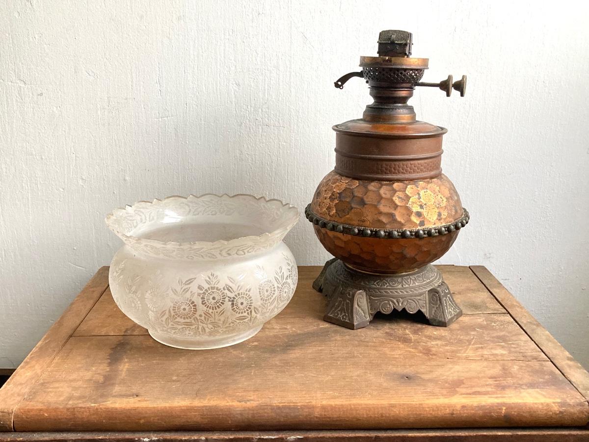 LOT 257: Antique Copper Base / Glass Shade Duplex Lantern and Collection of Miniatures with Wall Display