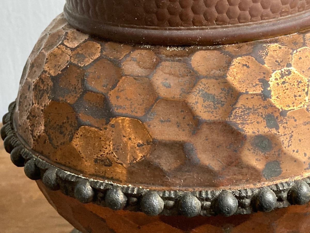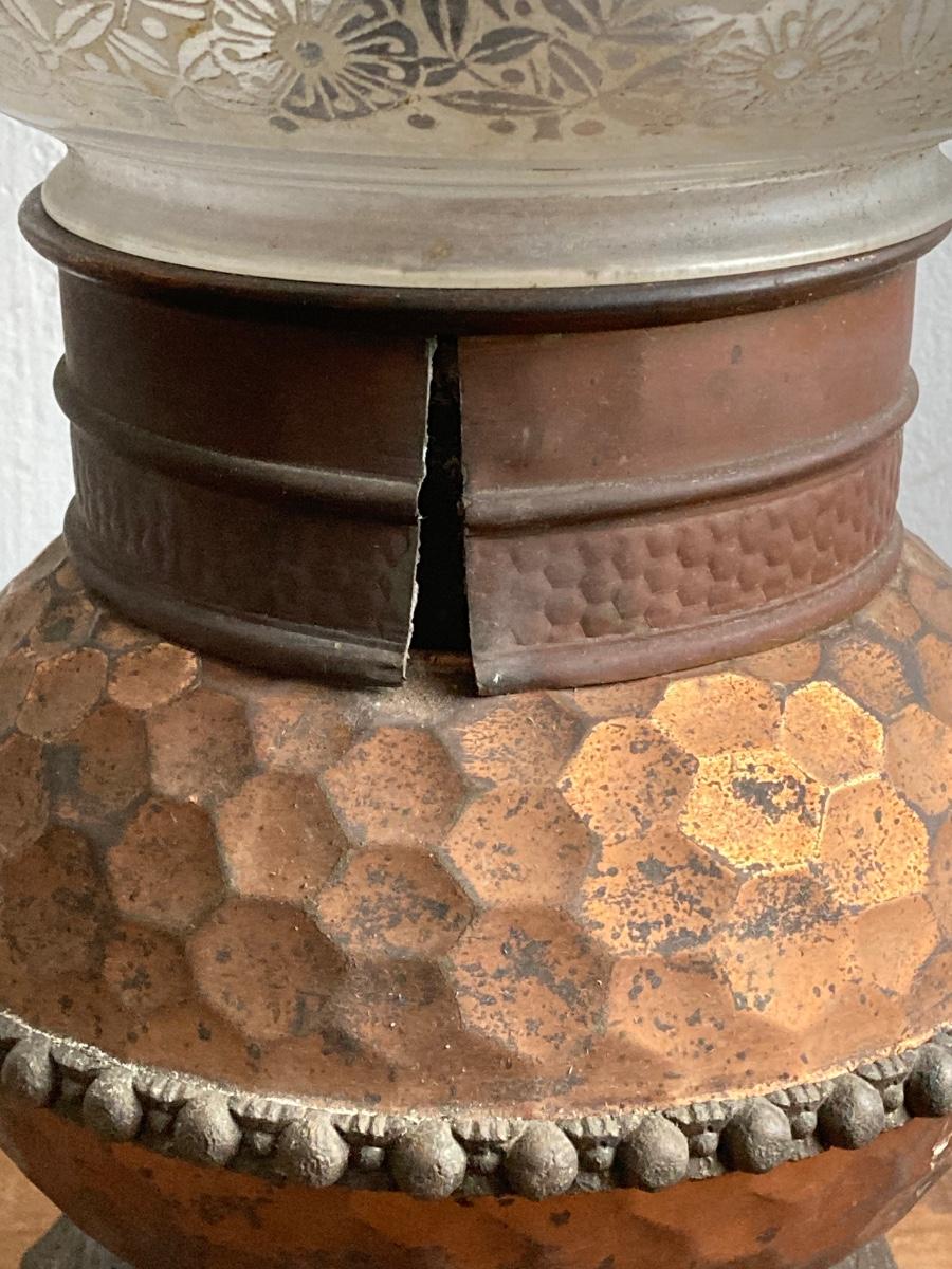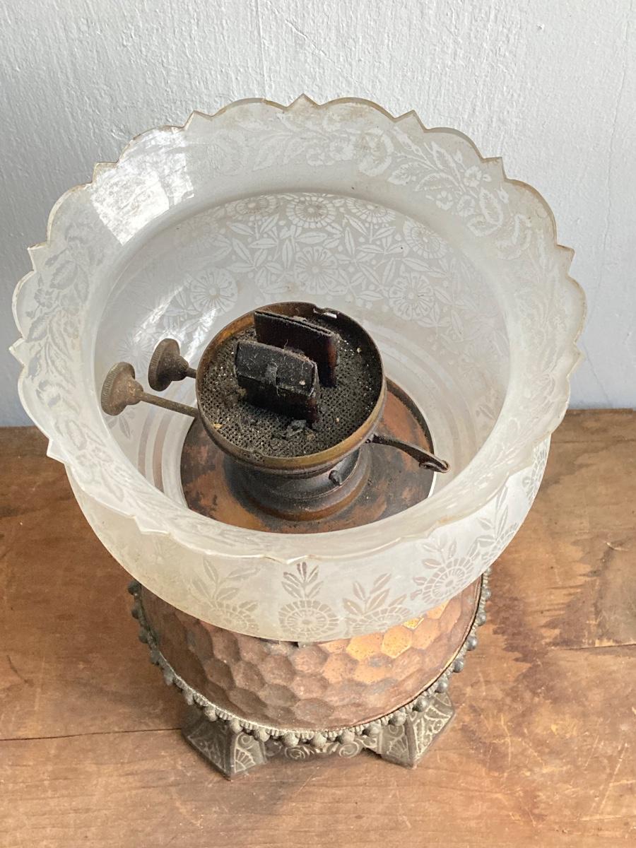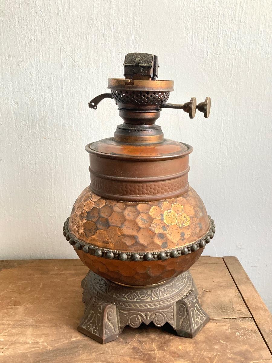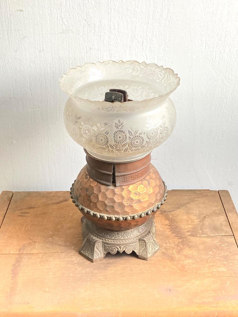 LOT 257: Antique Copper Base / Glass Shade Duplex Lantern and Collection of Miniatures with Wall Display