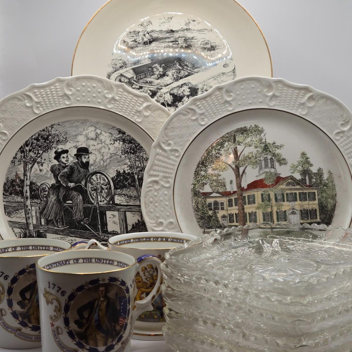LOT 271: Vintage N.J. Historic Locations Plates, 6 Inch Square Crystal Plates, Bi-Centenary of The United States Cups, & Silver Jubilee Of Queen Elizabeth 2 Handled Cup