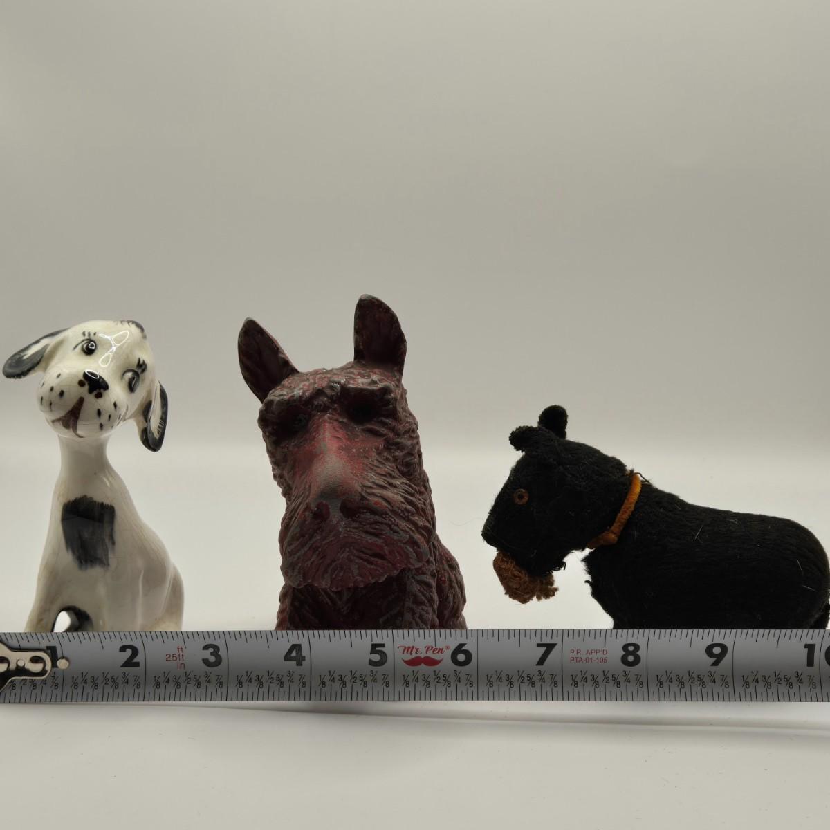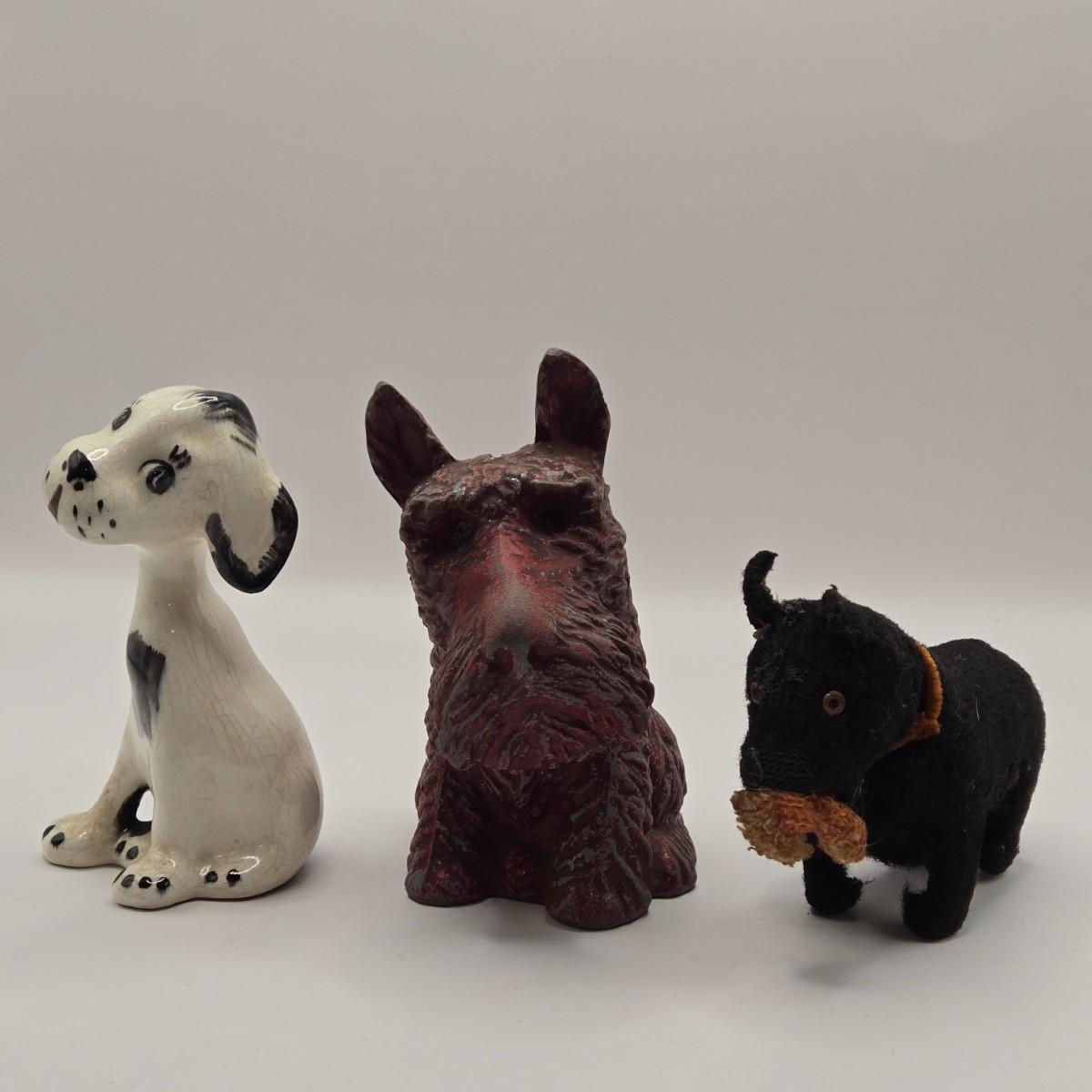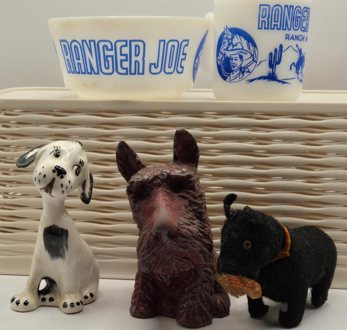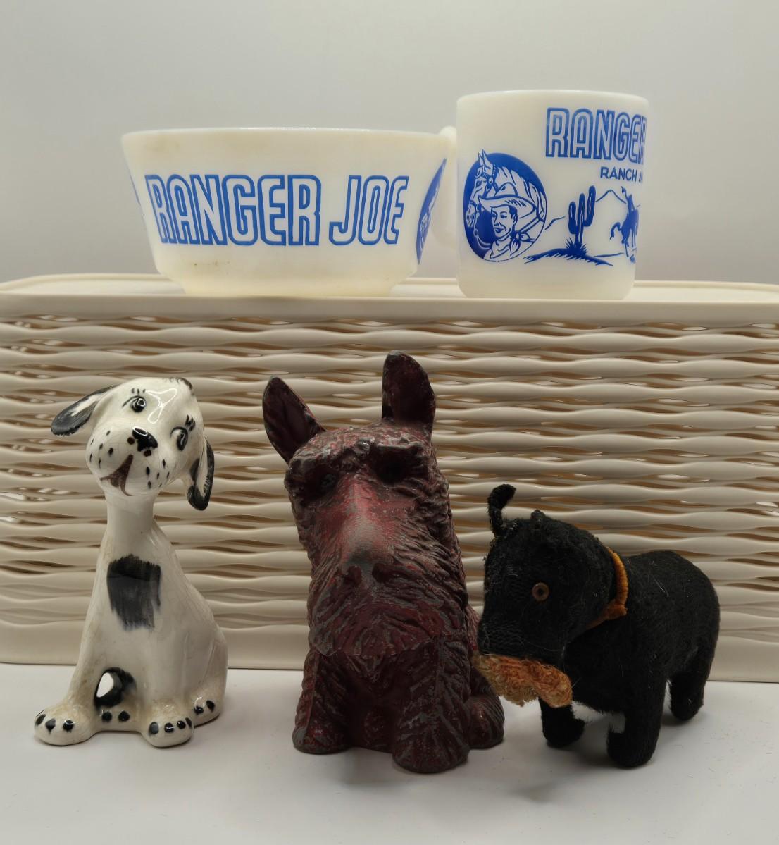 LOT 275: 1950s Ranger Joe Bowl and Mug, Dalmatian Dog Figure, Vintage Cast Iron Scottie Dog Coin Bank, Mohair with Straw Stuffing Scottish Terrier Toy