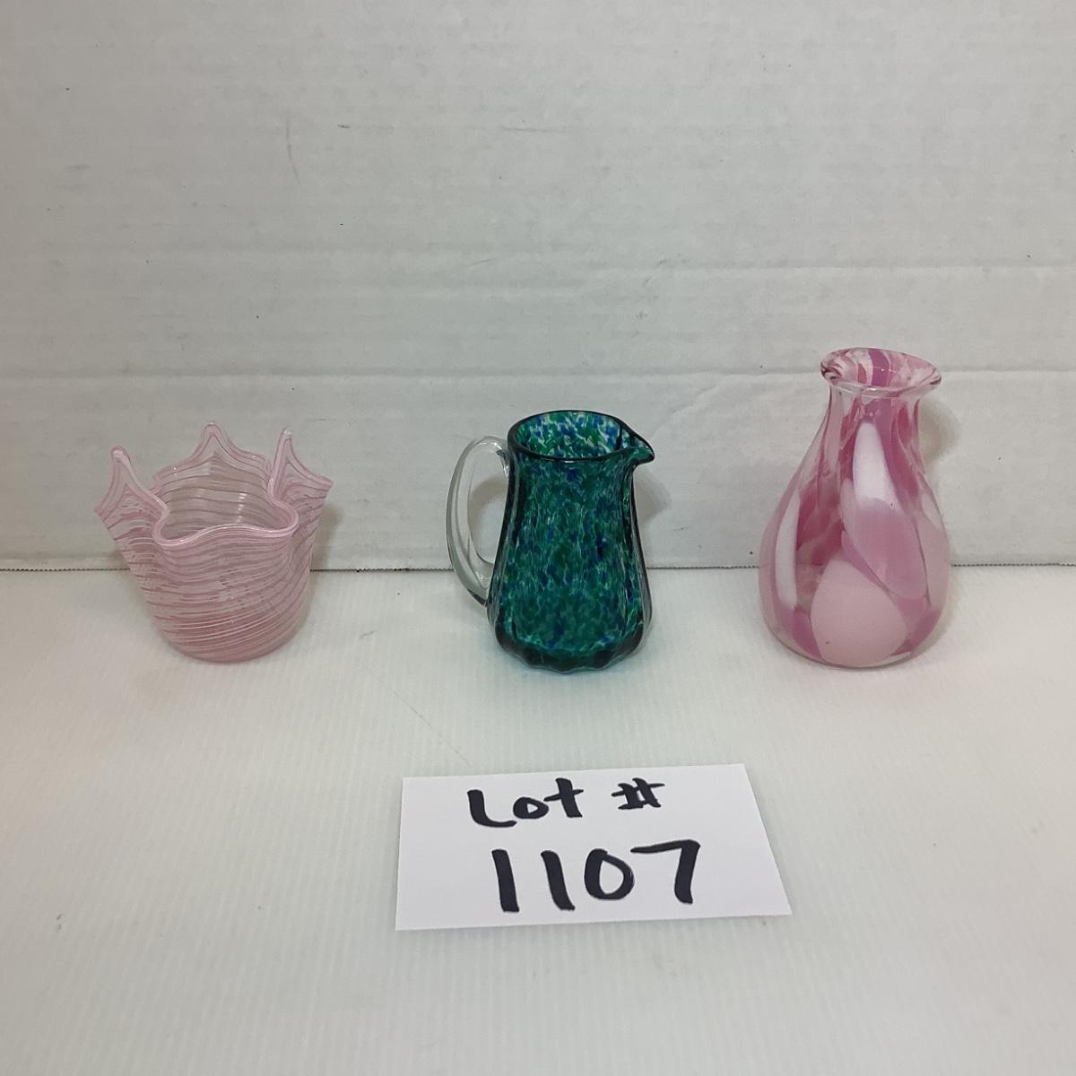 Pink Art Glass Vases / Hand Blown Blue& Green Pitcher