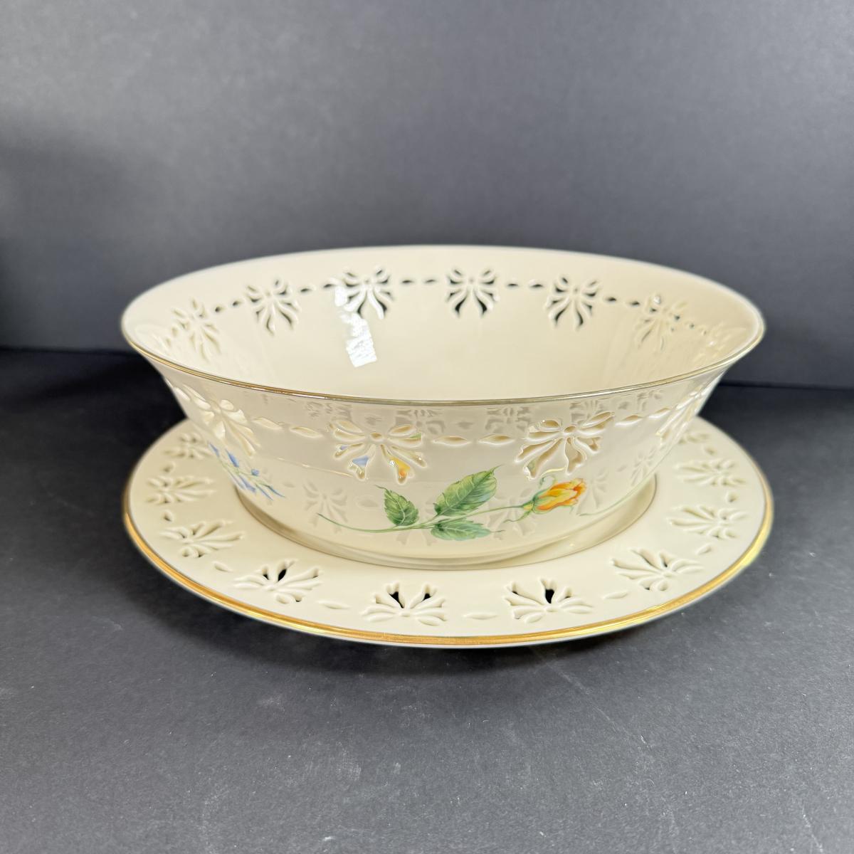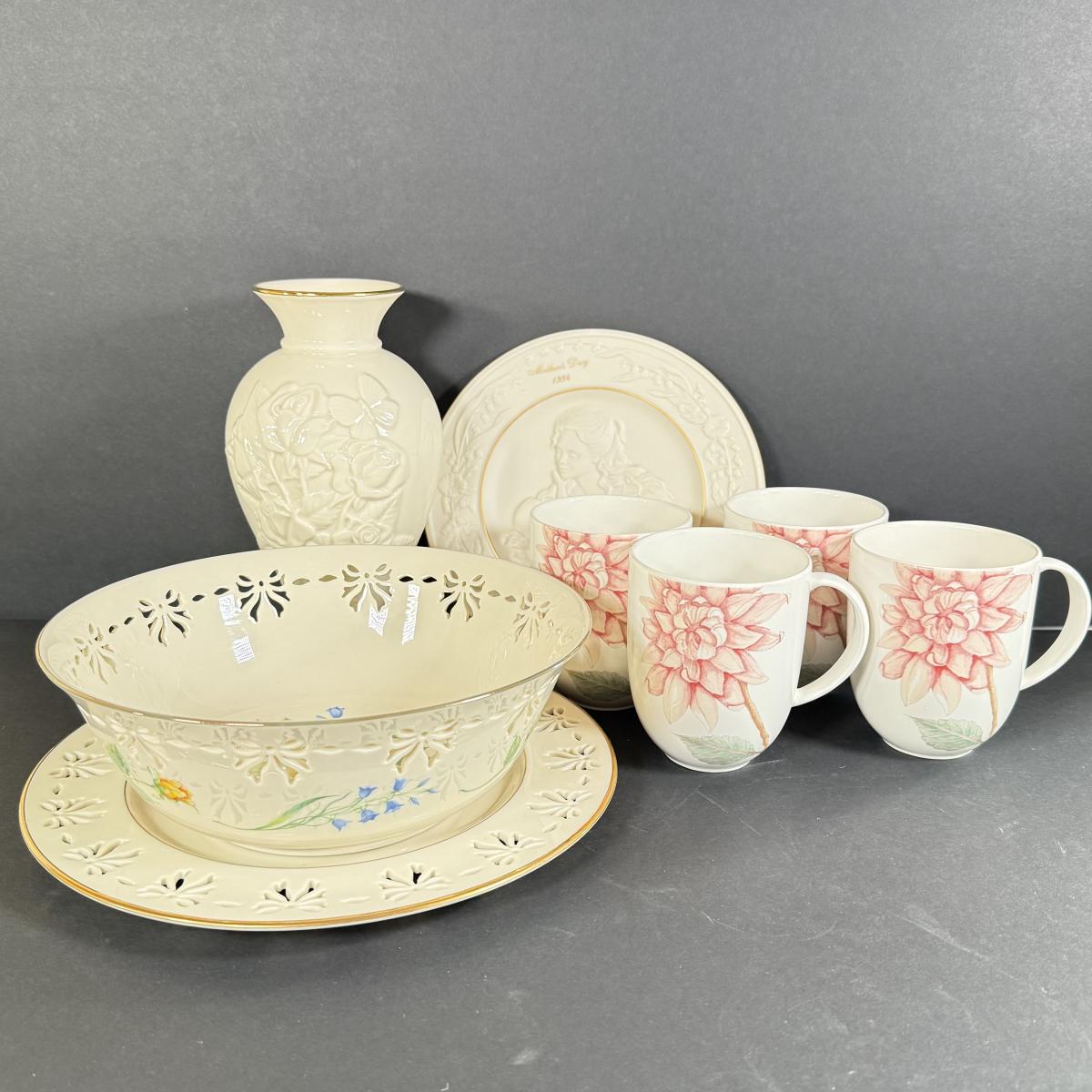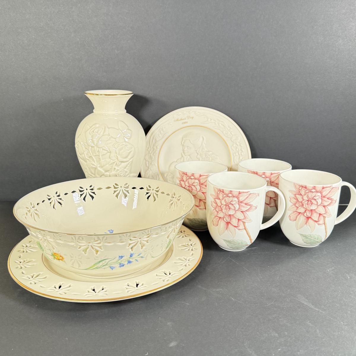 LOT 8D: Lenox Collection: 1997 Mother's Day Plate, Limited Edition 5000 "Victorian Beauty" Pierced Plate w/ Matching Bowl, Classic Rose Medley Vase & Peony Lane Blush Mugs