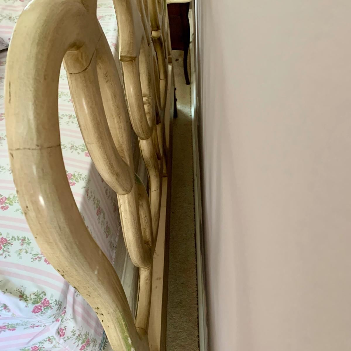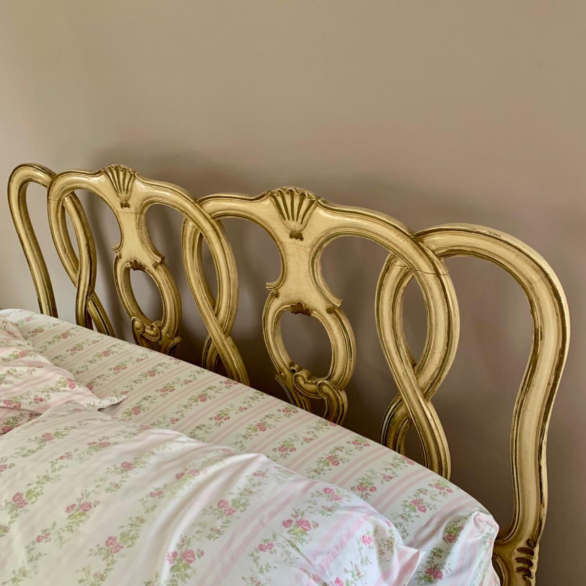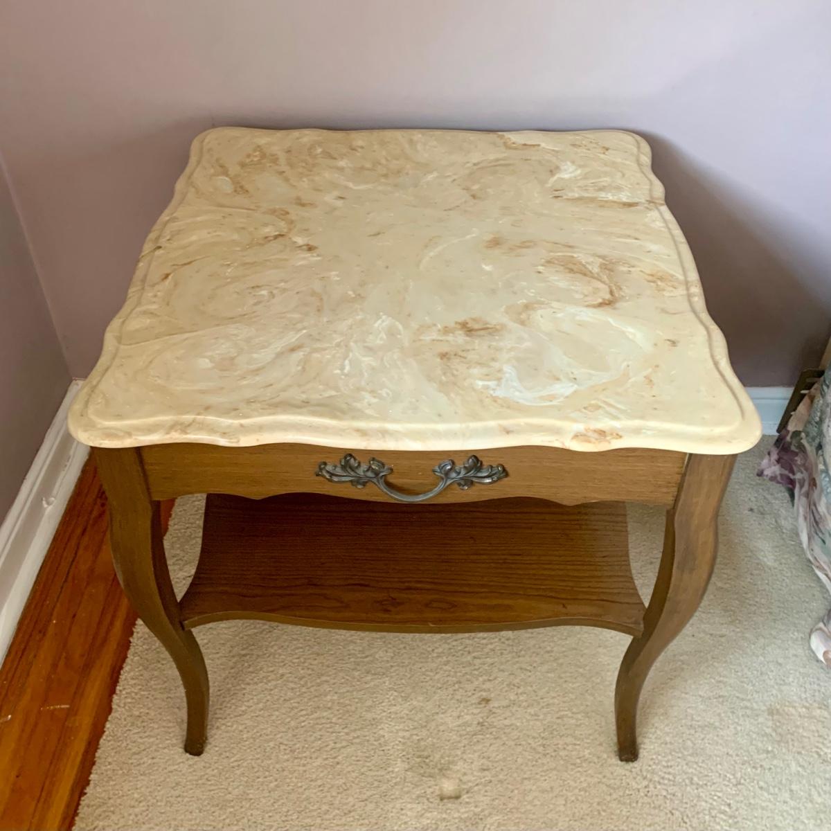 LOT 100 X: French Provincial Style Headboard & Faux Marble Top Bedside Table