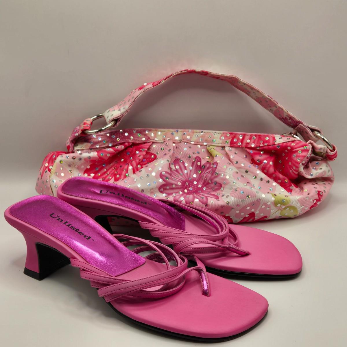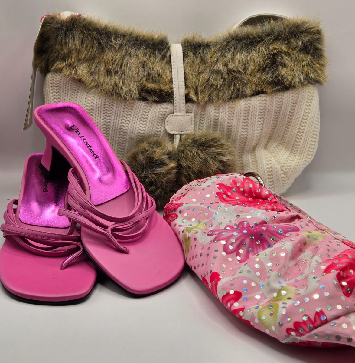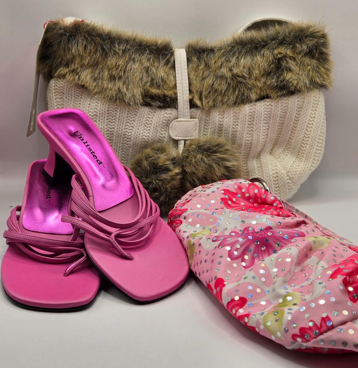 LOT 141L: Gently Worn Unlisted Dress Sandals Size 7.5, Sequined Handbag, & Bath & Body Works Handbag
