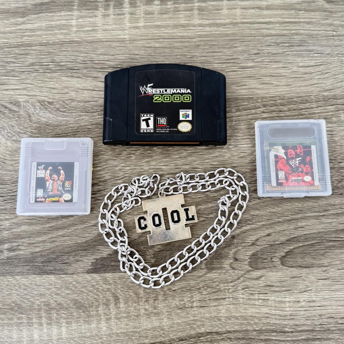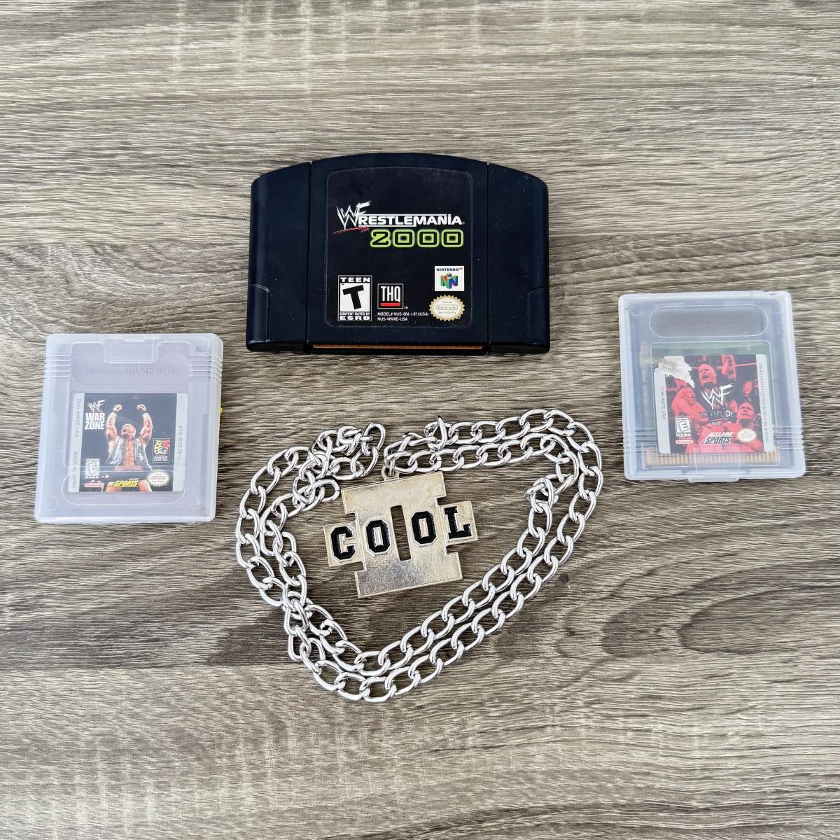 LOT 197A: 2000 WWF II Cool Bling Chain & Collection of Wrestling Video Games: Game Boy WWF War Zone, Game Boy Color WWF Attitude & Nintendo N64 WWF Wrestlemania 2000