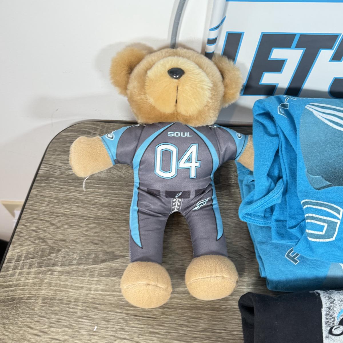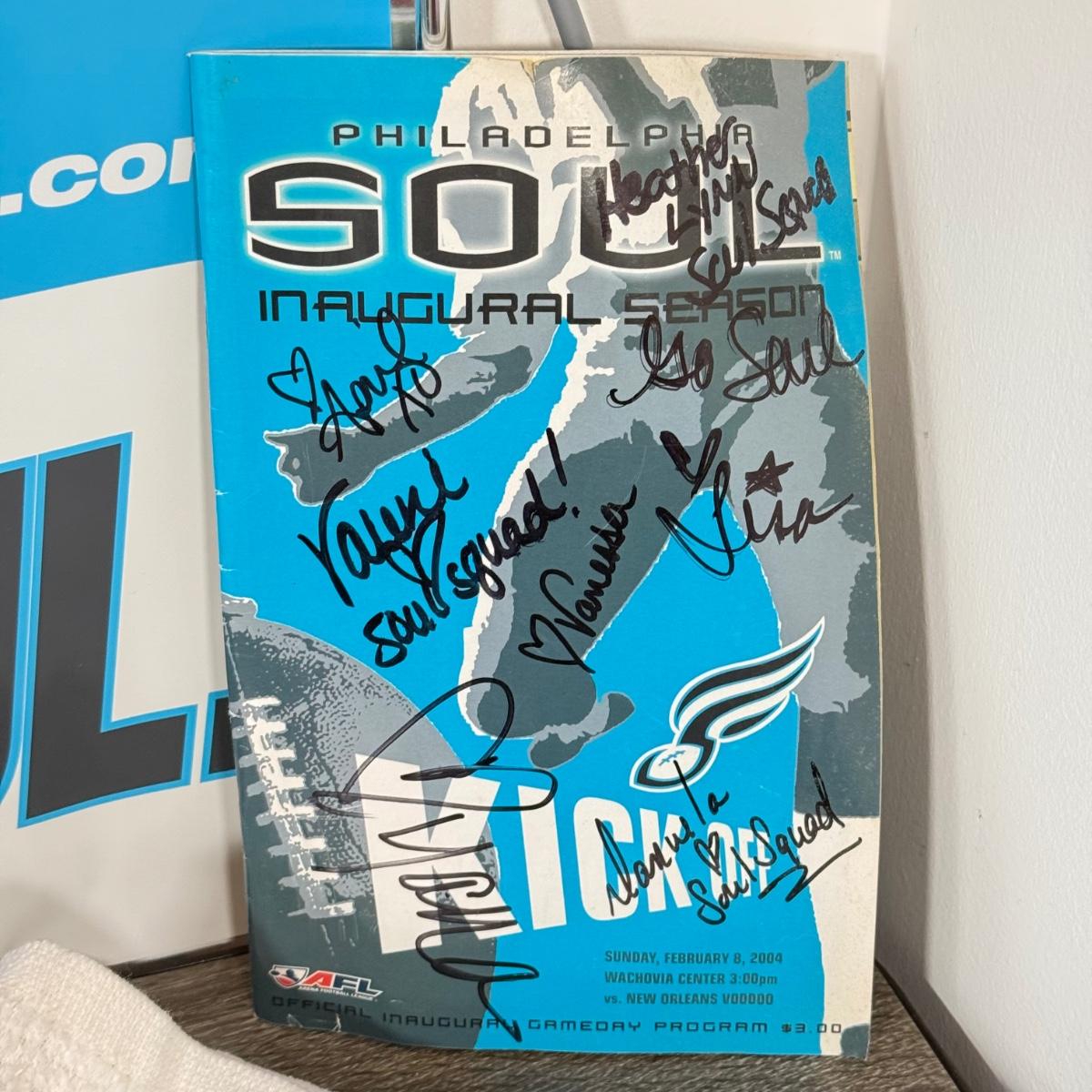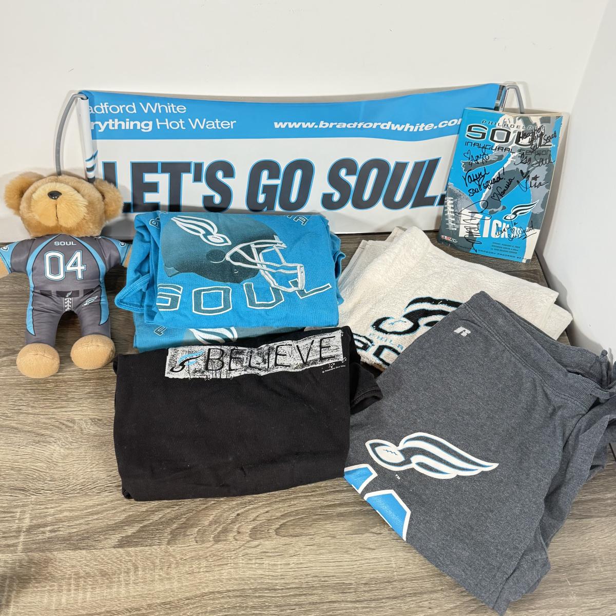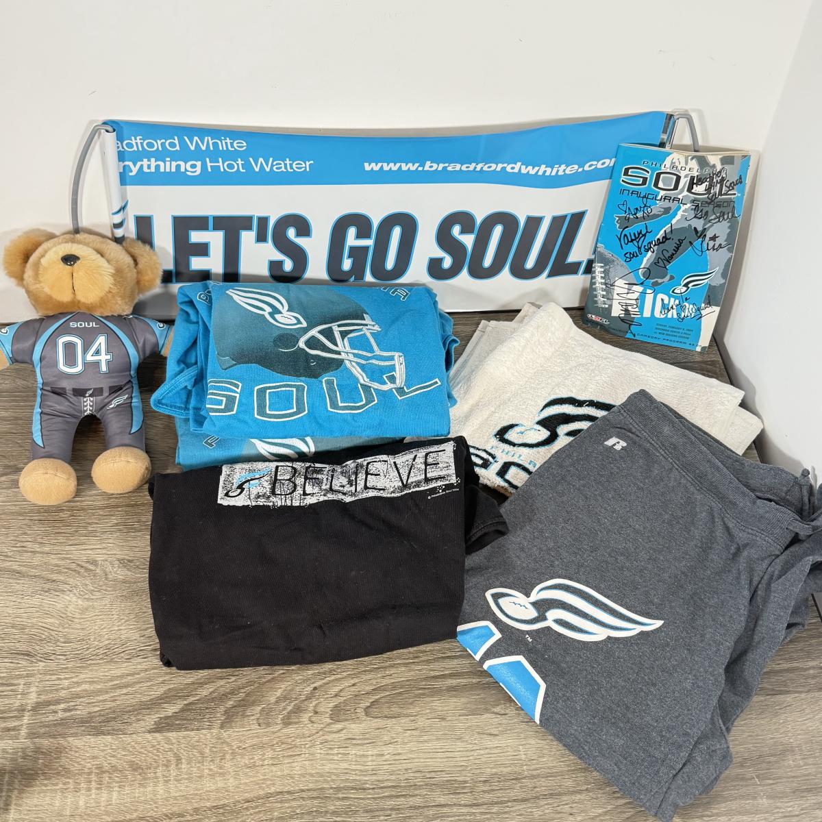 LOT 219B: Philadelphia Soul Football Collection: T-Shirts, Signed Program, Banner & Teddy Bear