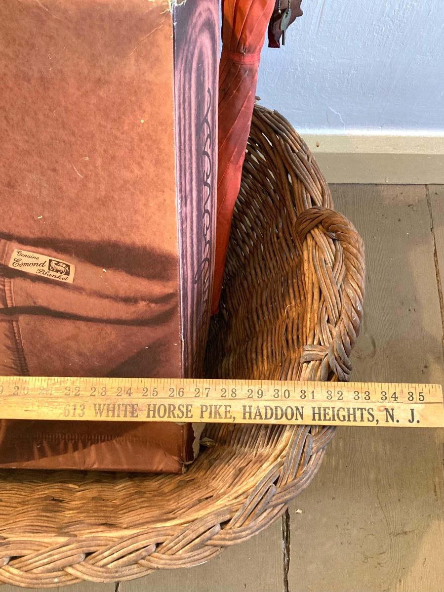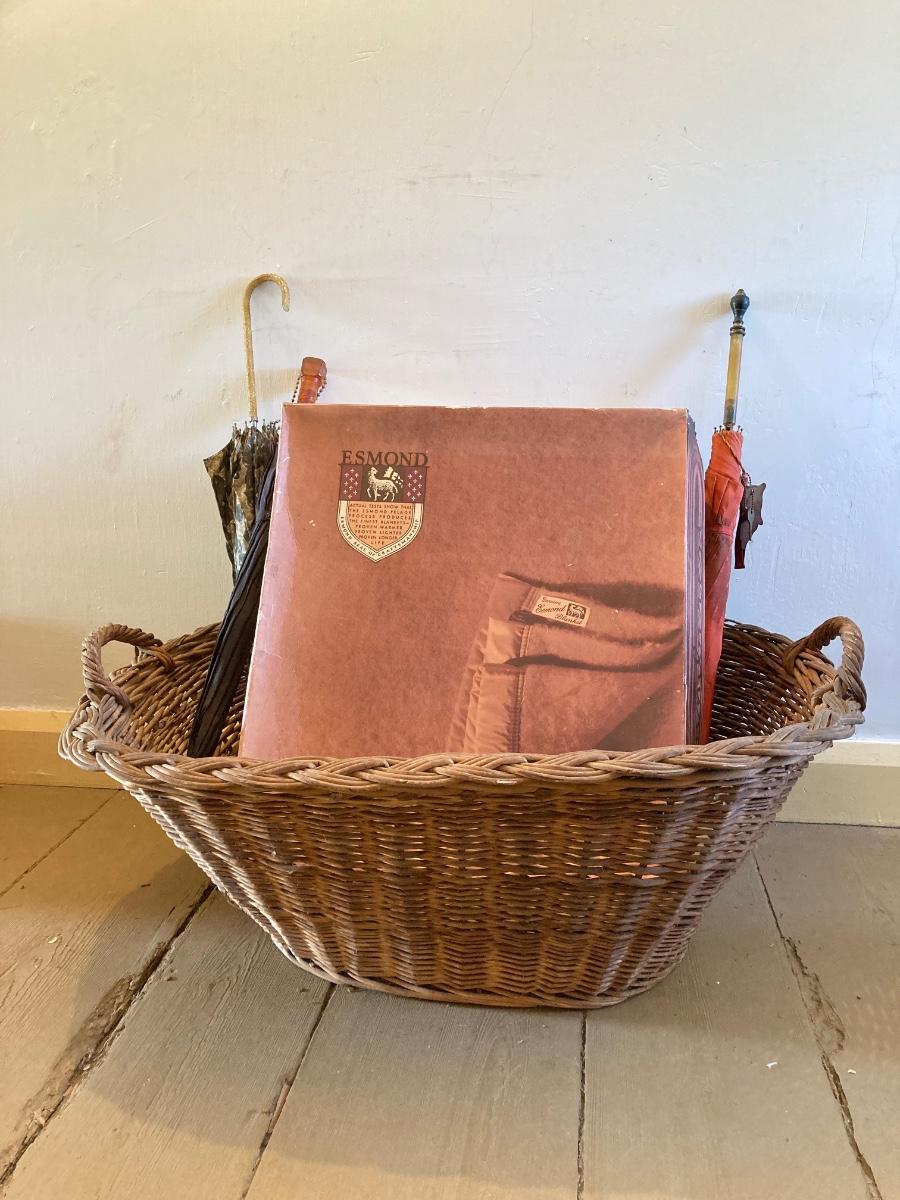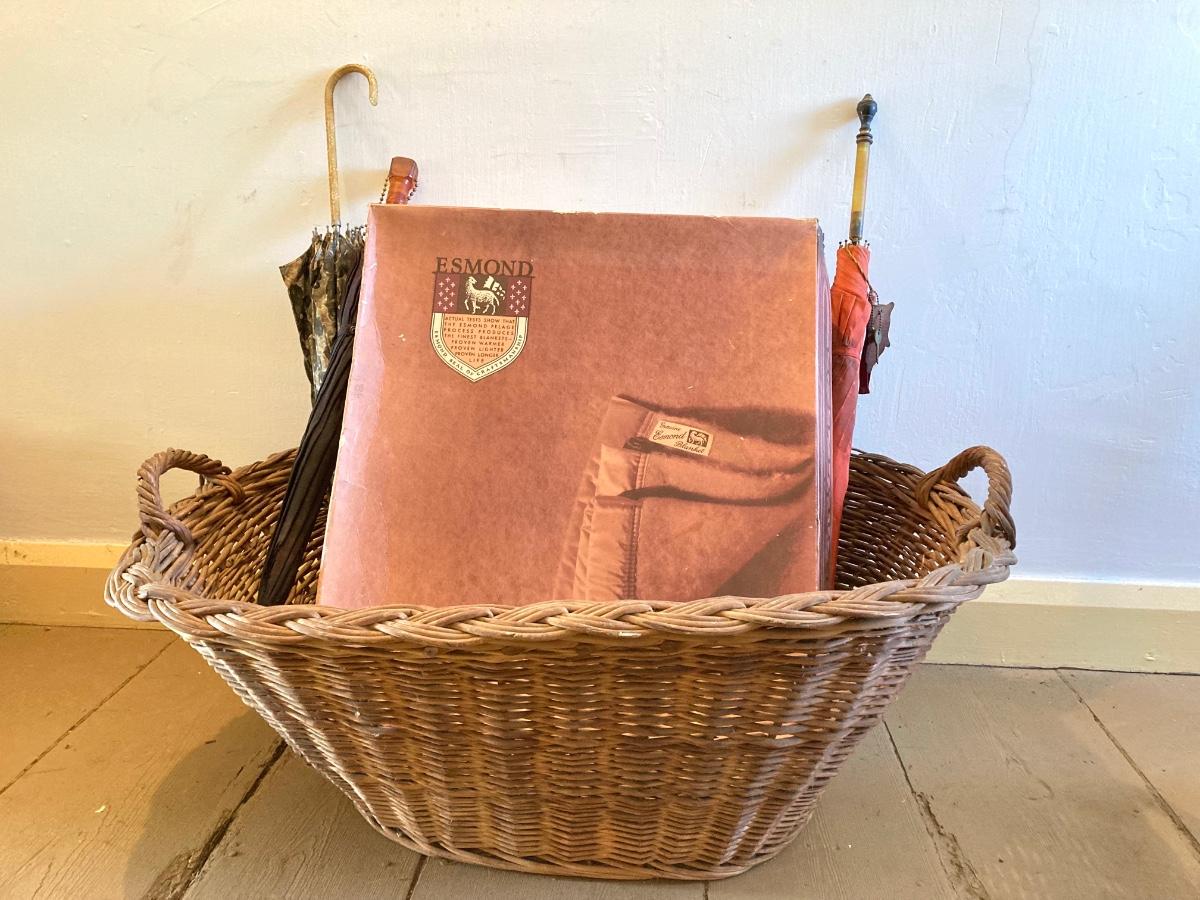 LOT 322: Esmond Slumberest Blanket in Original Box, Beacon Winsor Blanket in Original Box, Large Wicker Basket and Three Vintage Umbrellas