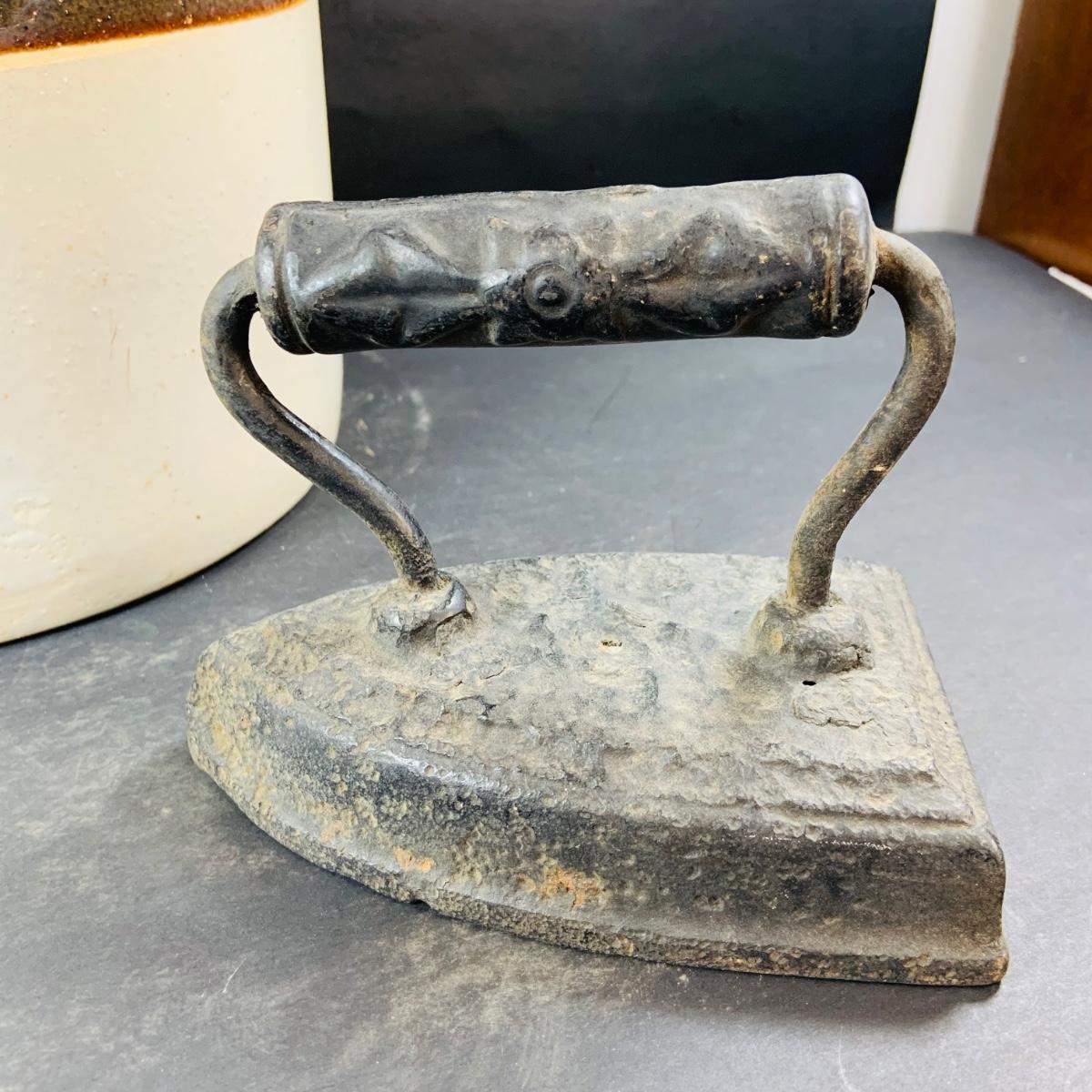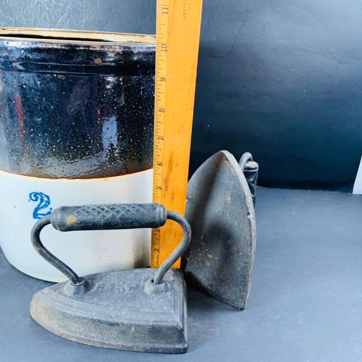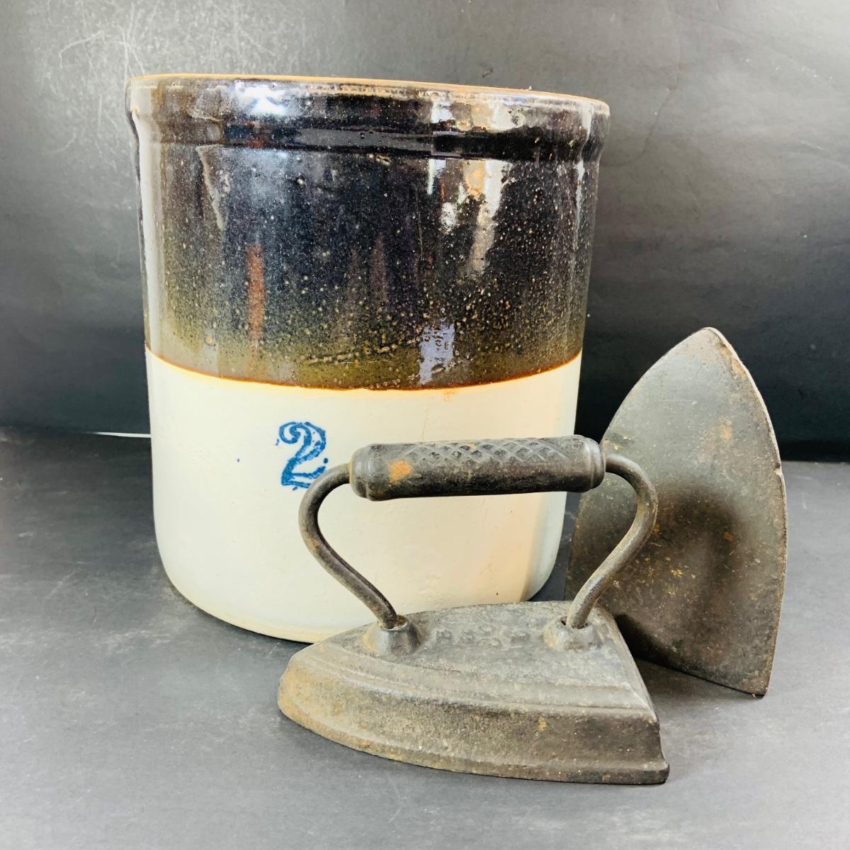LOT 335: Vintage #2 Stoneware Crock and 2 Cast Irons