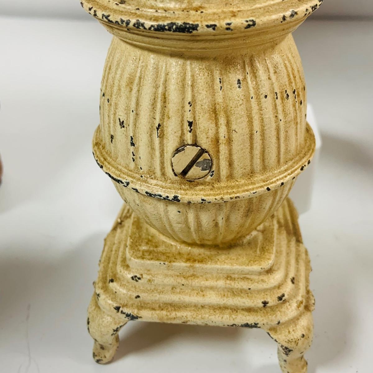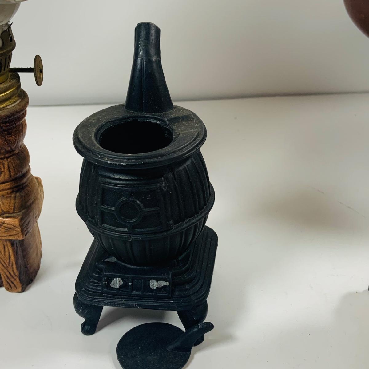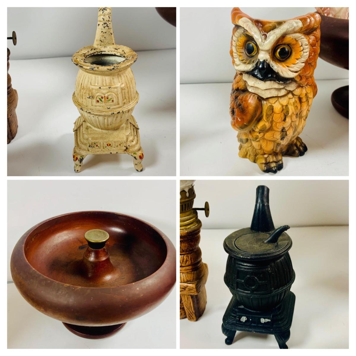 LOT441: Americana Collection Including 2 Cast Iron Miniature Cast Iron Pot Belly Stoves, a Ceramic Spinning Wheel Oil Lamp, Ceramic Owl, Wood Nut Bowl, Napkins and Coasters