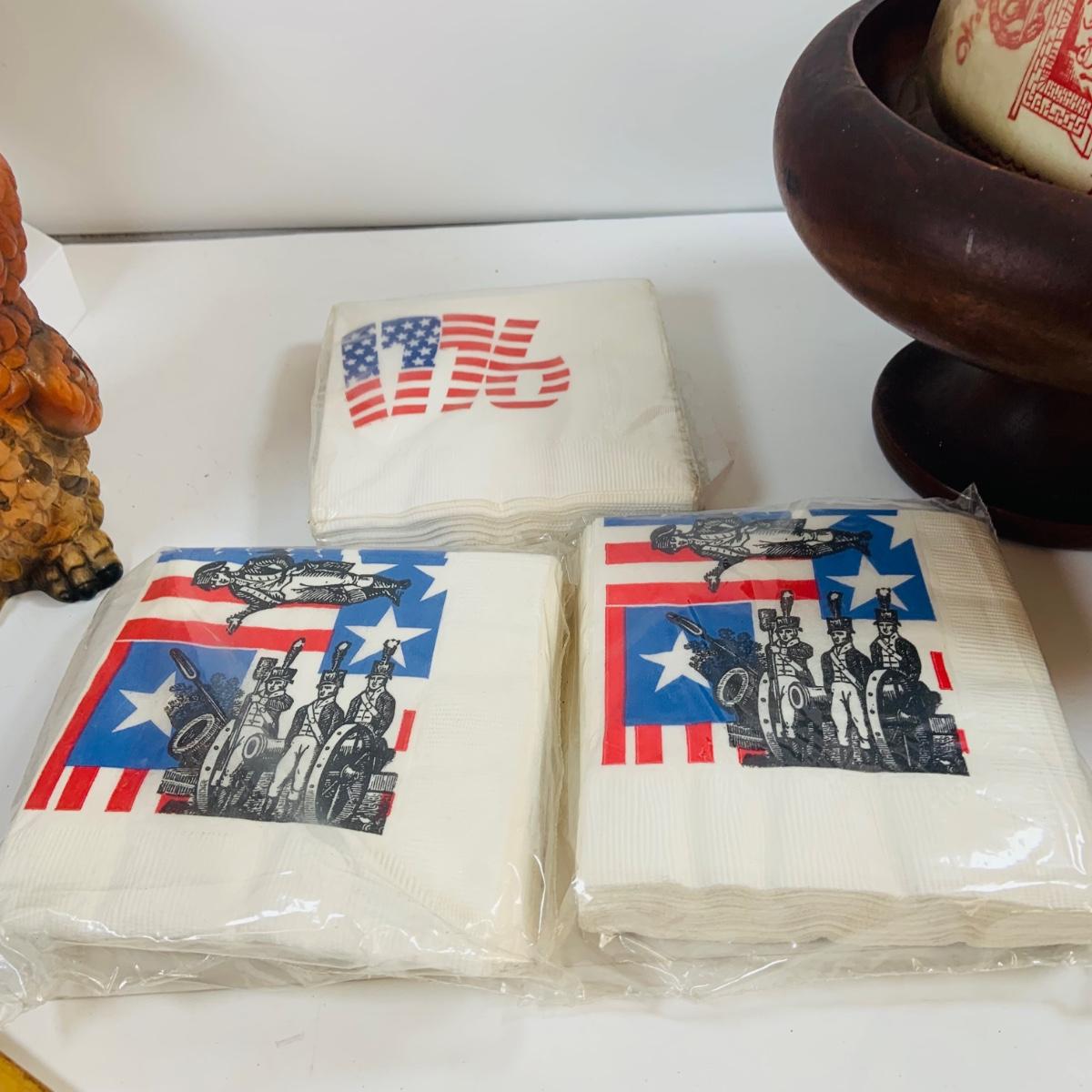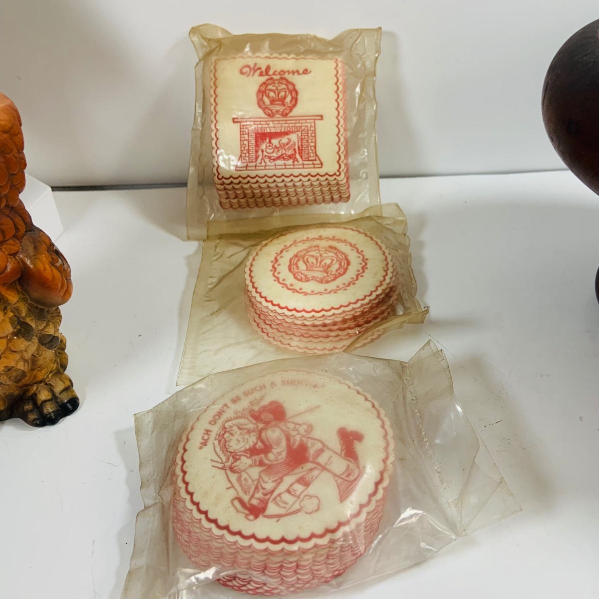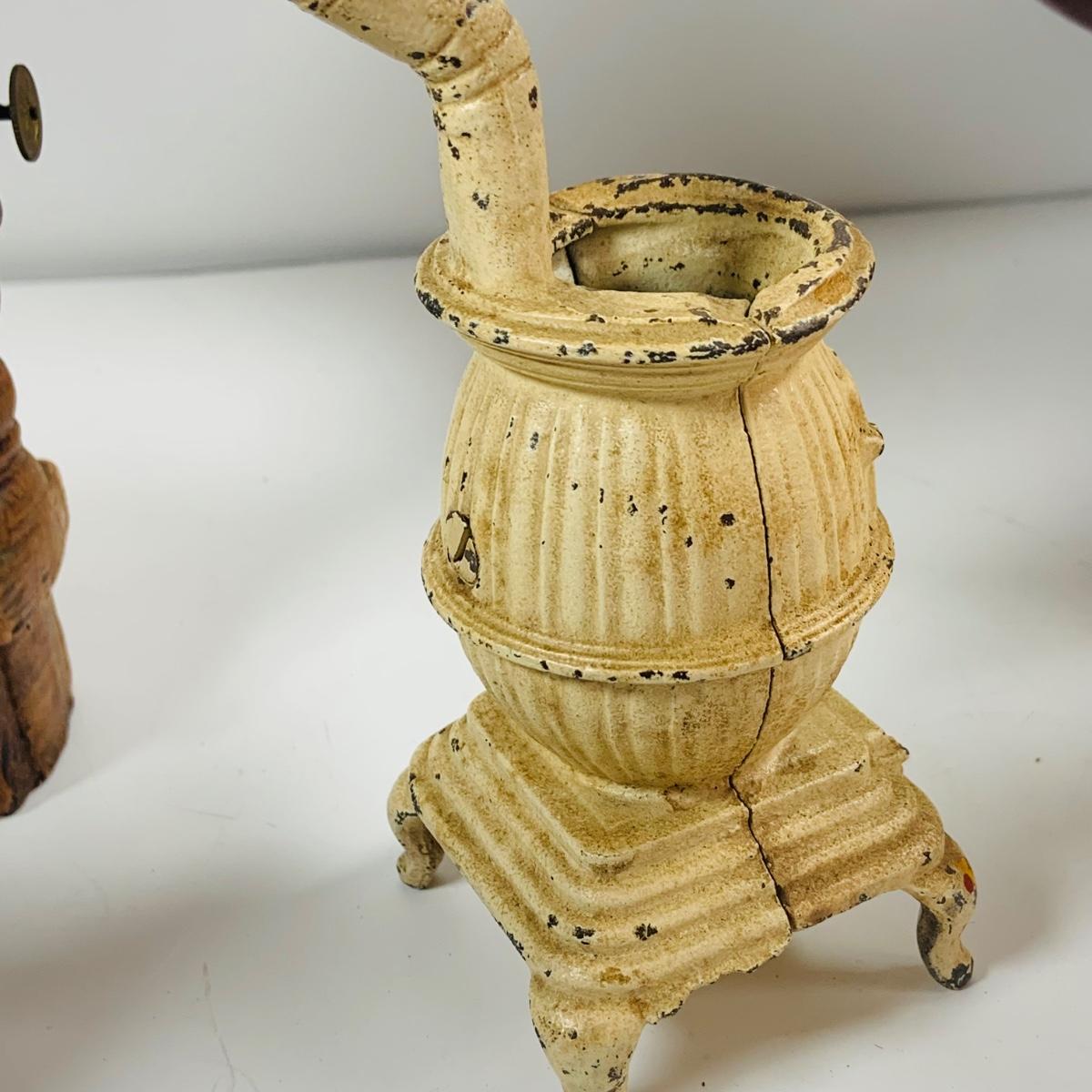 LOT441: Americana Collection Including 2 Cast Iron Miniature Cast Iron Pot Belly Stoves, a Ceramic Spinning Wheel Oil Lamp, Ceramic Owl, Wood Nut Bowl, Napkins and Coasters