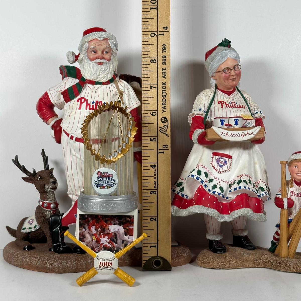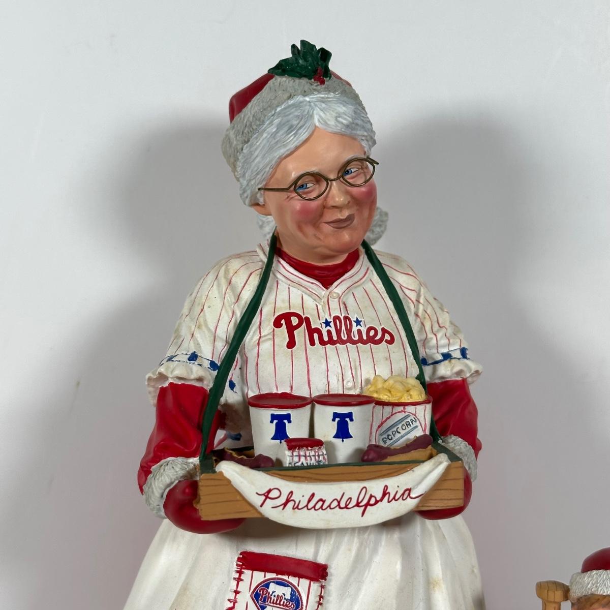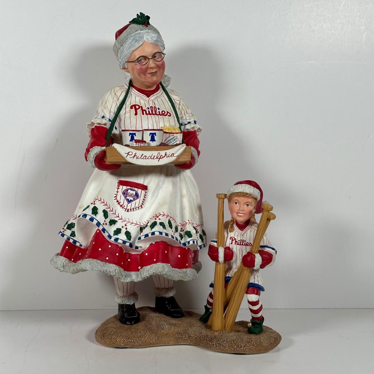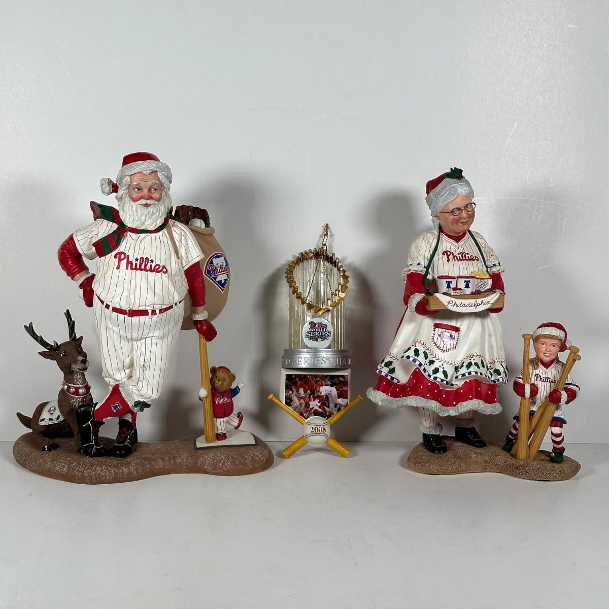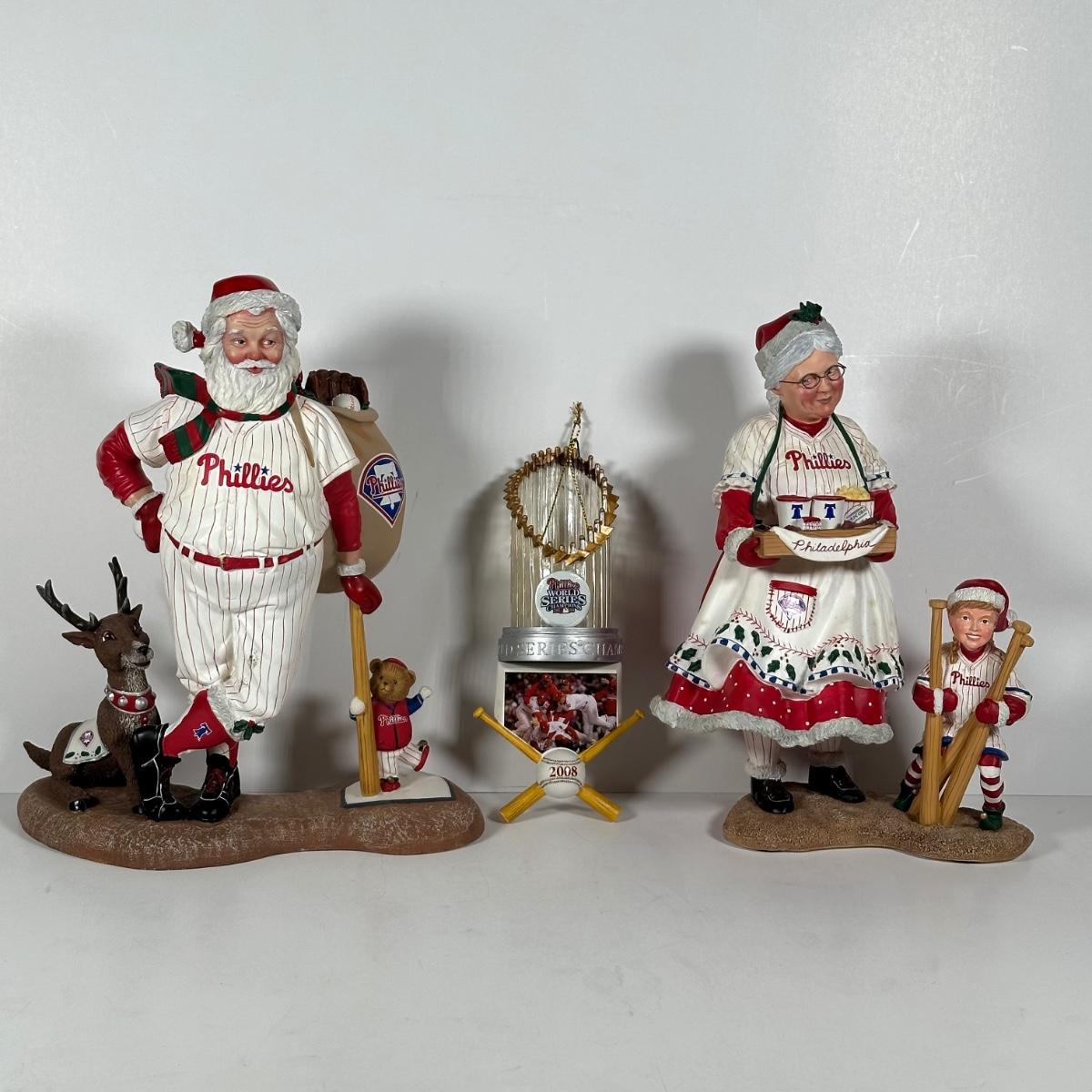 LOT 21D: The Danbury Mint Philadelphia Phillies Santa & Mrs Claus Figurines & Ornament