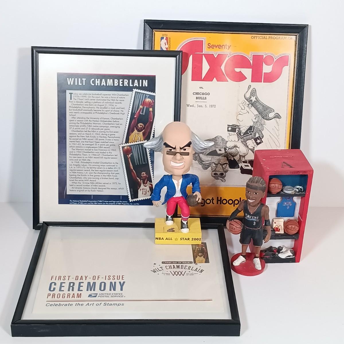LOT 78B: Vintage 1972 Seventy Sixers Program, Allen Iverson Bank, Wilt Chamberlain Stamp & More