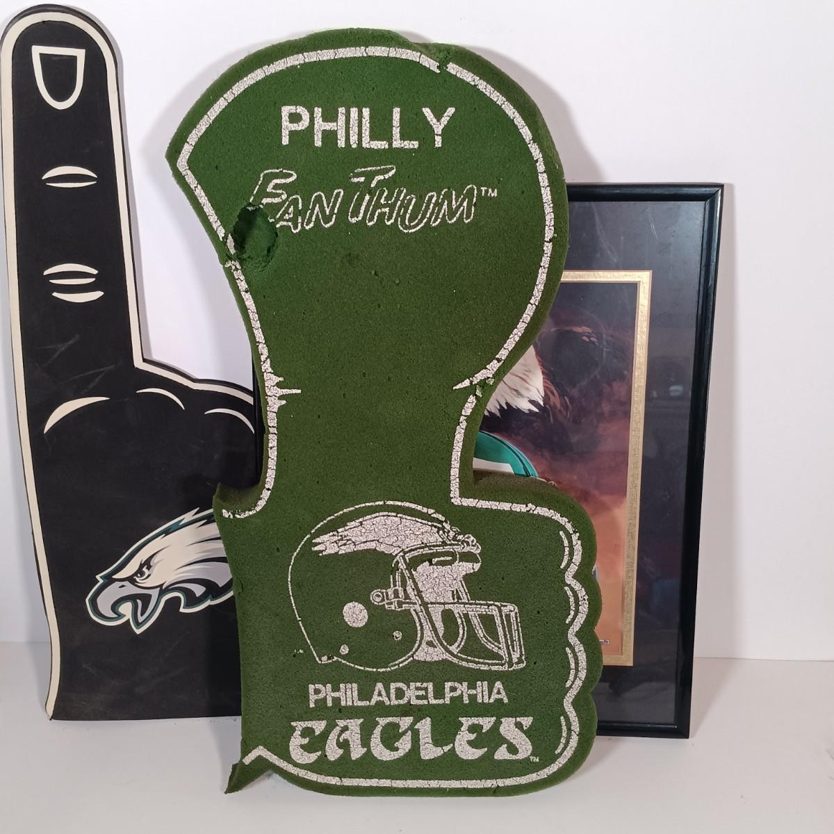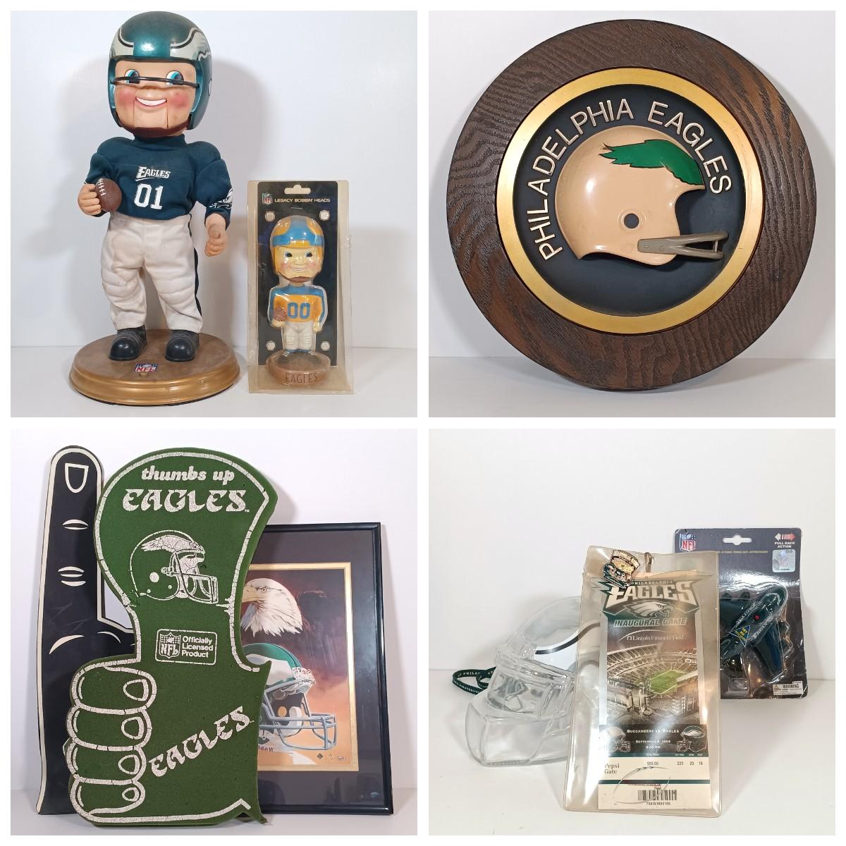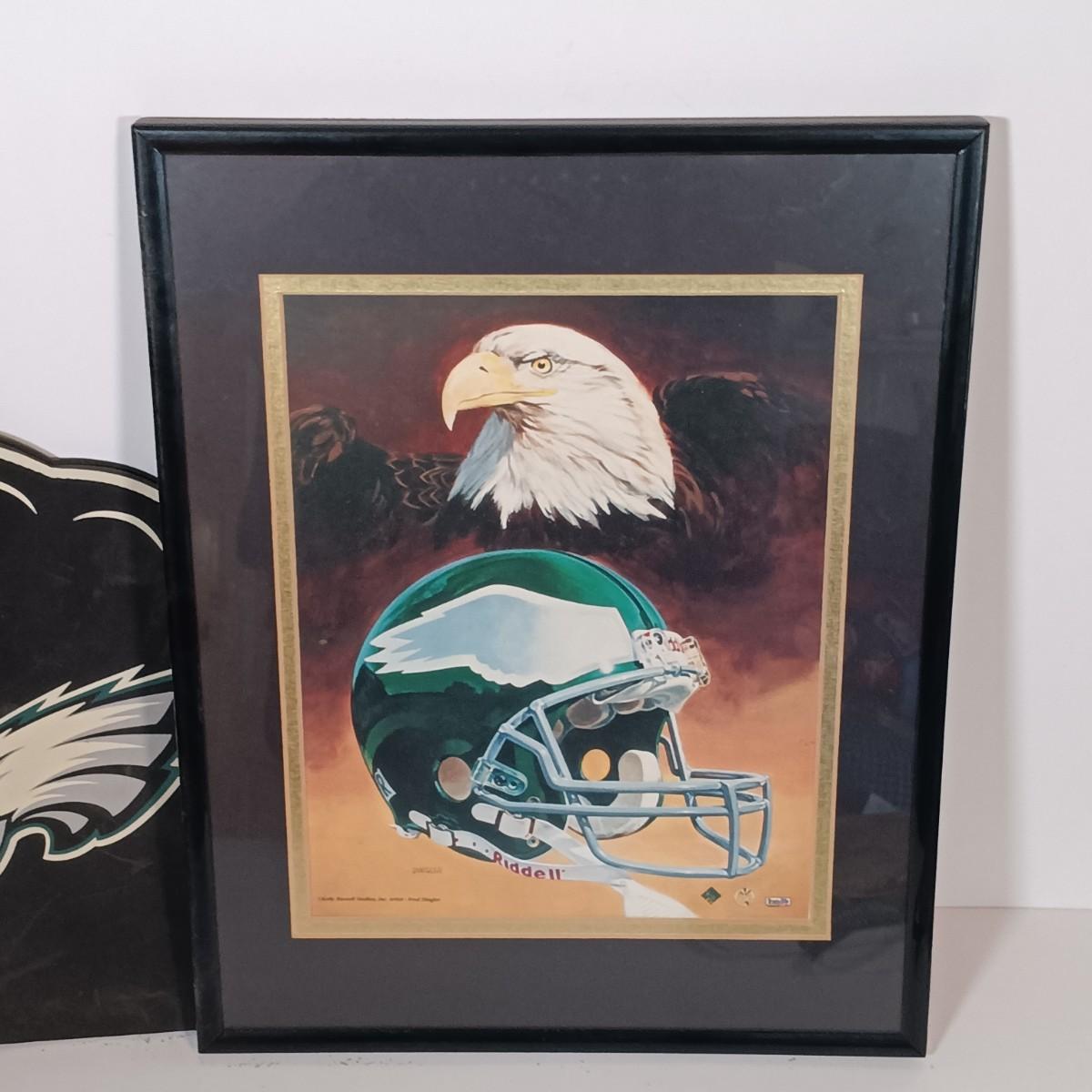 LOT 79B: Vintage Philadelphia Eagles Wall Plaque, Fred Dingler Signed Print, Gemmy Rockin' Randall Doll & More