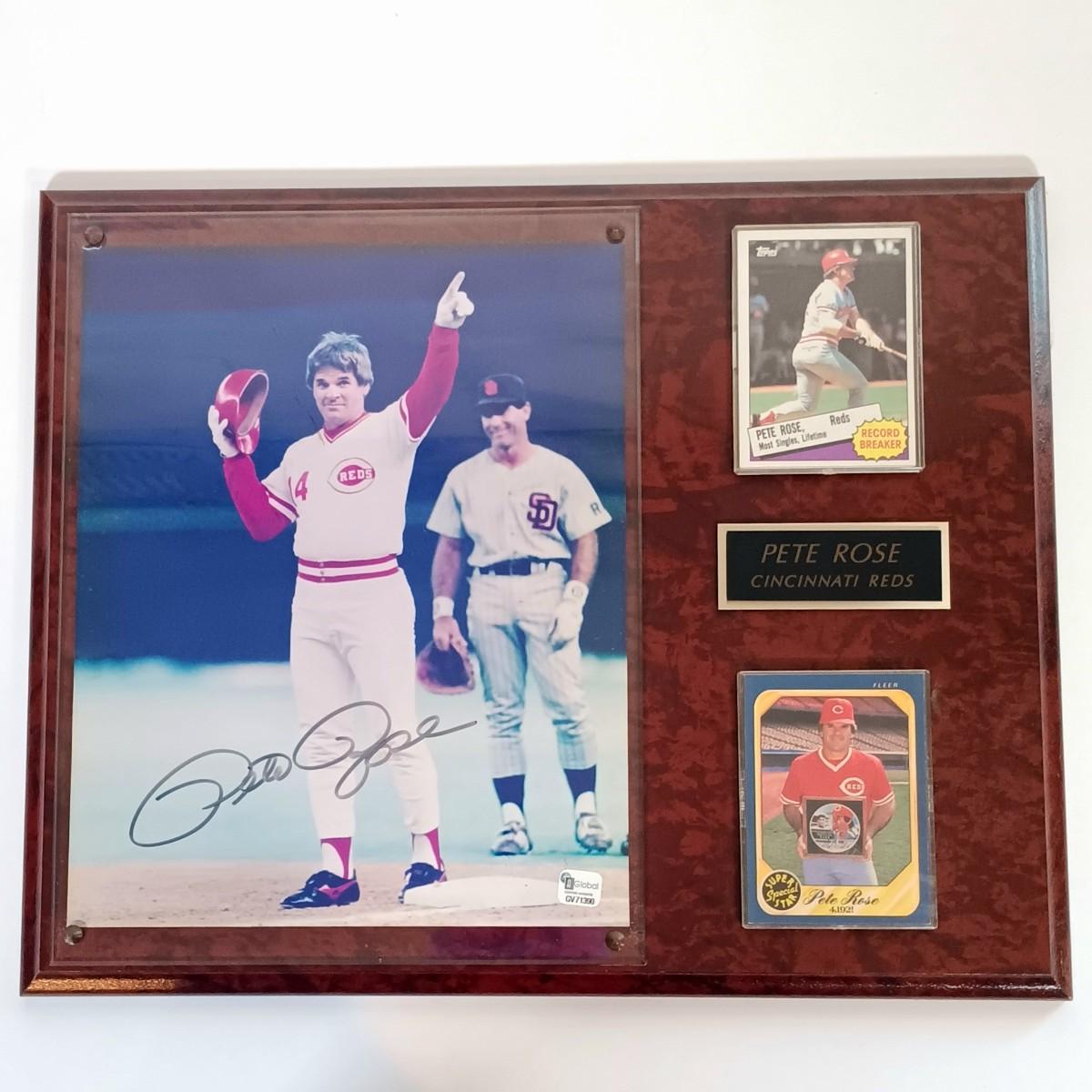 LOT 153B: Cincinnati Reds Pete Rose Plaque - Autographed Photo and Two Cards