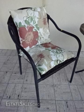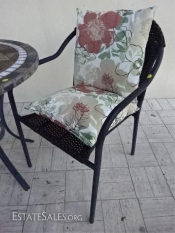 LOT 110D: 3 PC PATIO TABLE AND CHAIRS, METAL AND STONE TILE TABLE, 2 METAL FRAME ARMCHAIRS WITH TROPICAL FLORAL PRINT CUSHIONS, VERY GOOD CONDITION WITH MINOR WEAR, SKU379.06