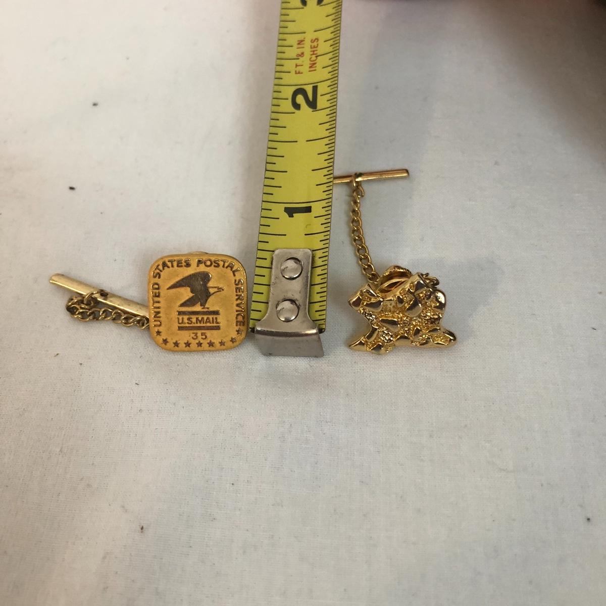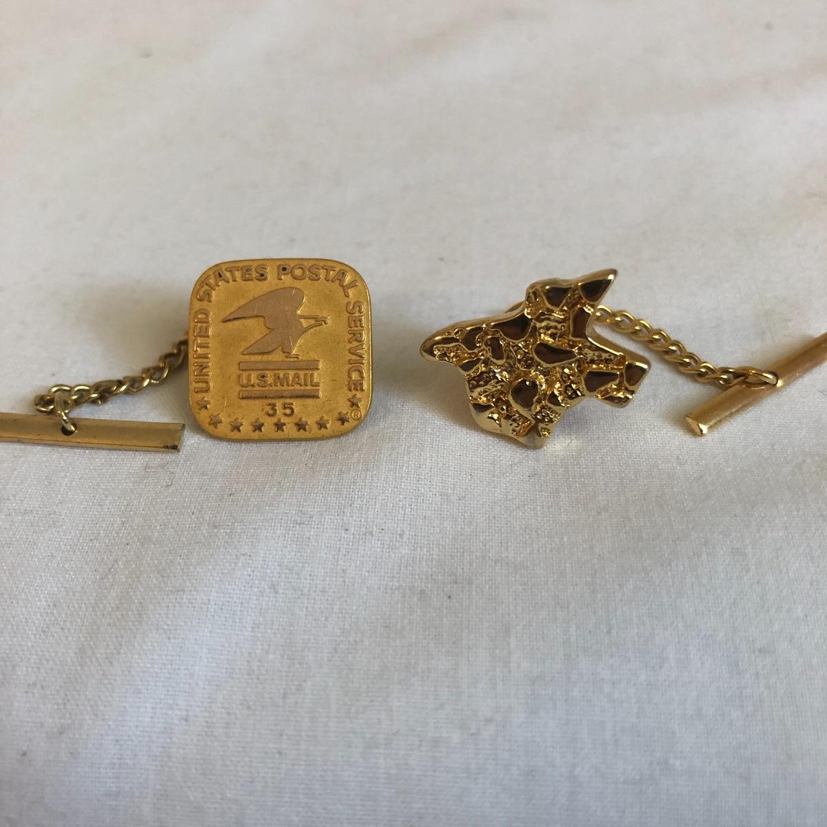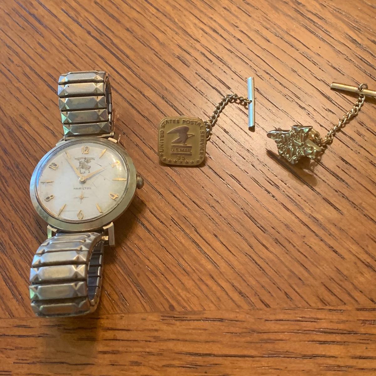 This vintage Hamilton watch is a 35 year recognition for Champion Paper and Fiber company. The watch is marked 14k and the band is a 10k mix. In addition we have included two special tie pins in this lot that includes a 14K gold nuggets of Texas and a United Postal Service commemorative pin.