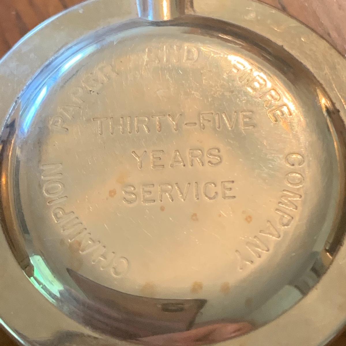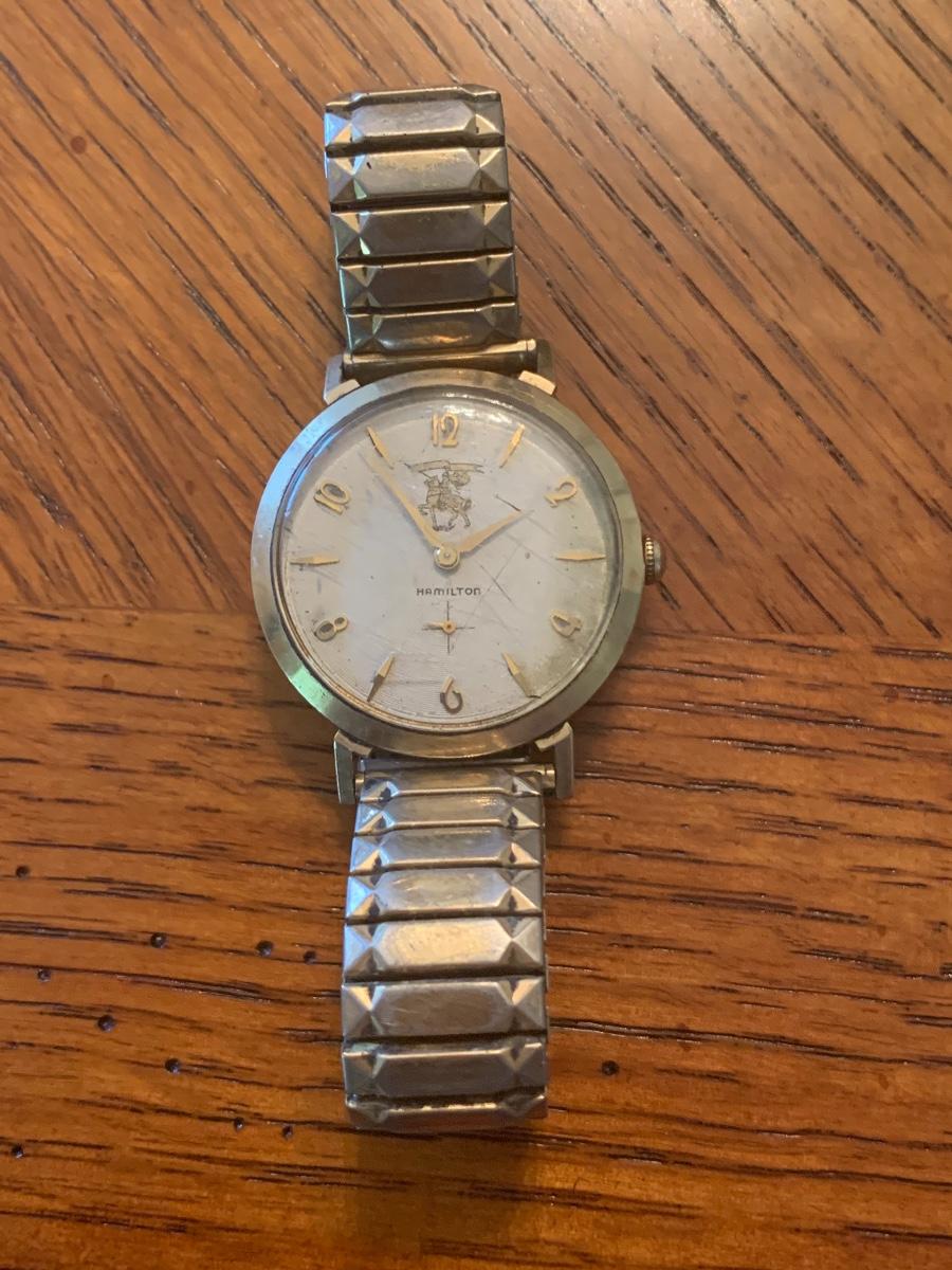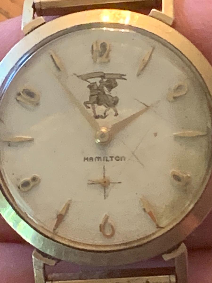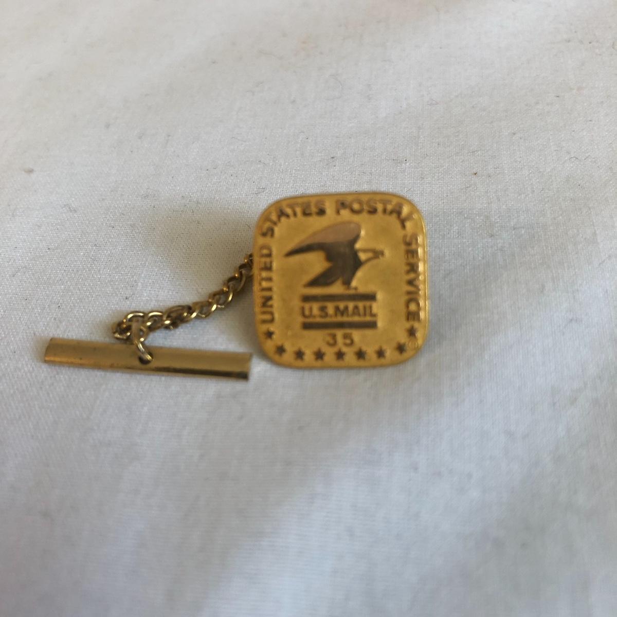 This vintage Hamilton watch is a 35 year recognition for Champion Paper and Fiber company. The watch is marked 14k and the band is a 10k mix. In addition we have included two special tie pins in this lot that includes a 14K gold nuggets of Texas and a United Postal Service commemorative pin.