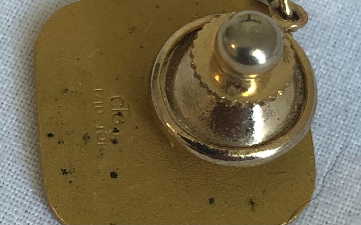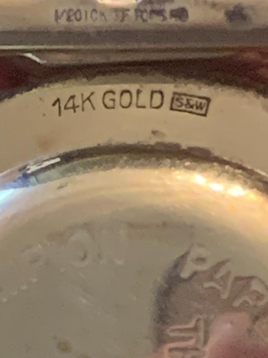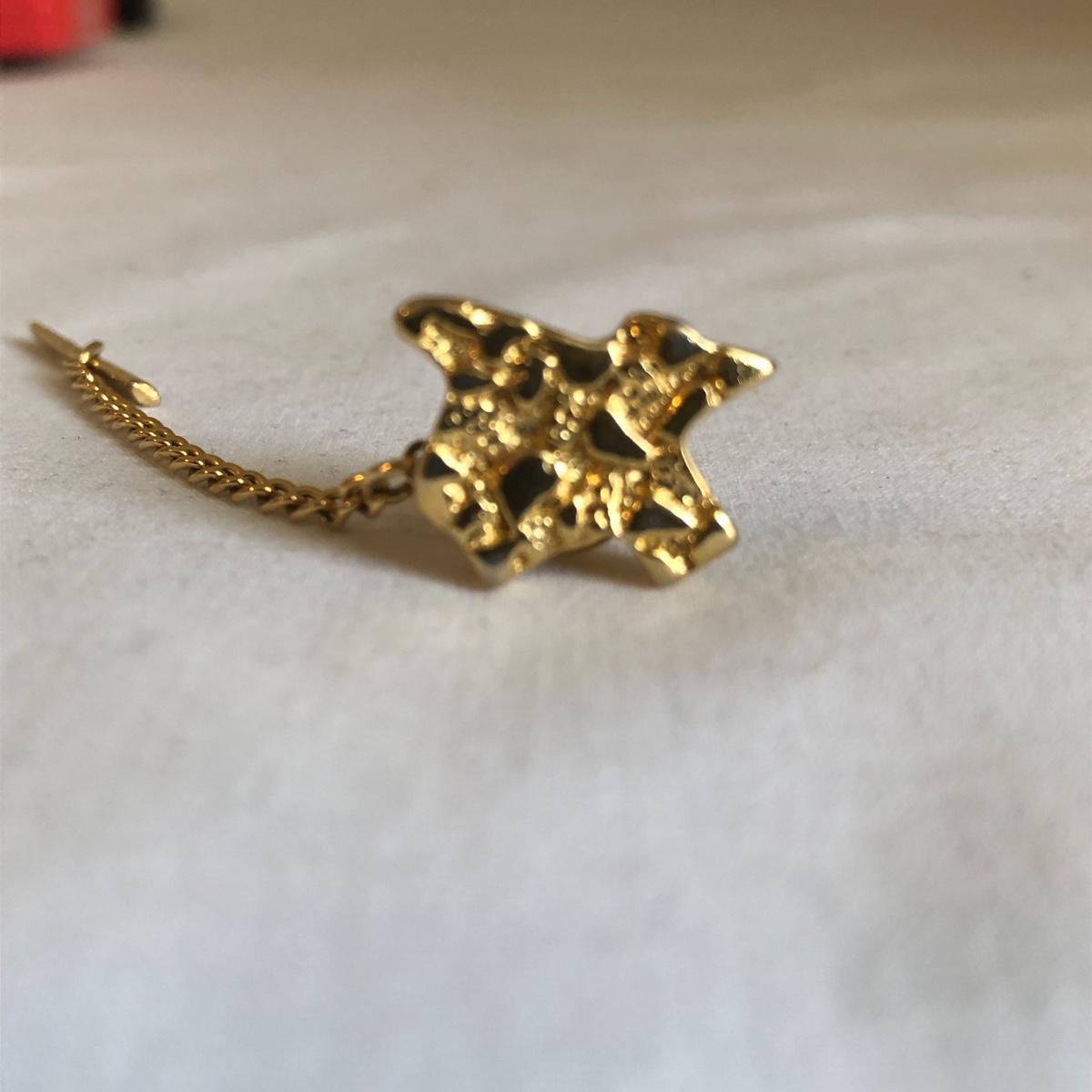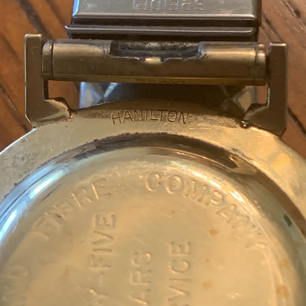 This vintage Hamilton watch is a 35 year recognition for Champion Paper and Fiber company. The watch is marked 14k and the band is a 10k mix. In addition we have included two special tie pins in this lot that includes a 14K gold nuggets of Texas and a United Postal Service commemorative pin.