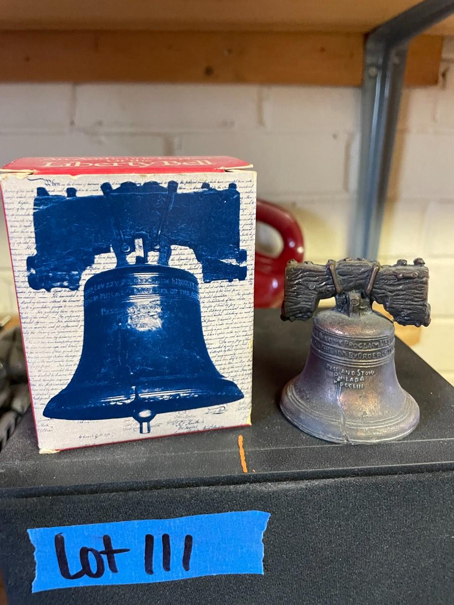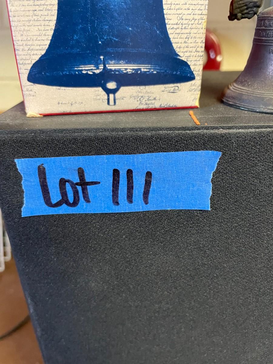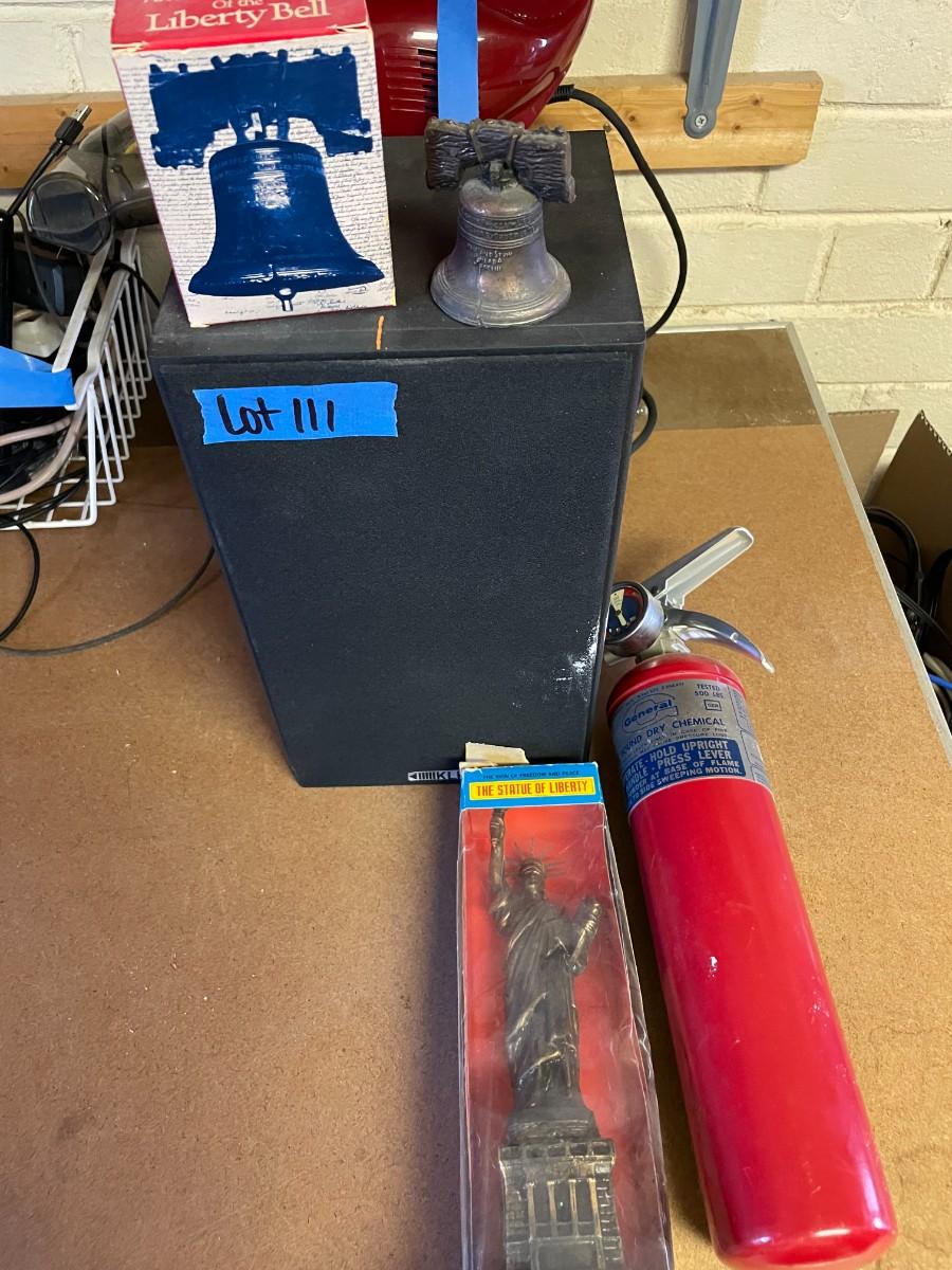 lot 111- (2) liberty bells, fire extinguisher, speaker, statue of liberty