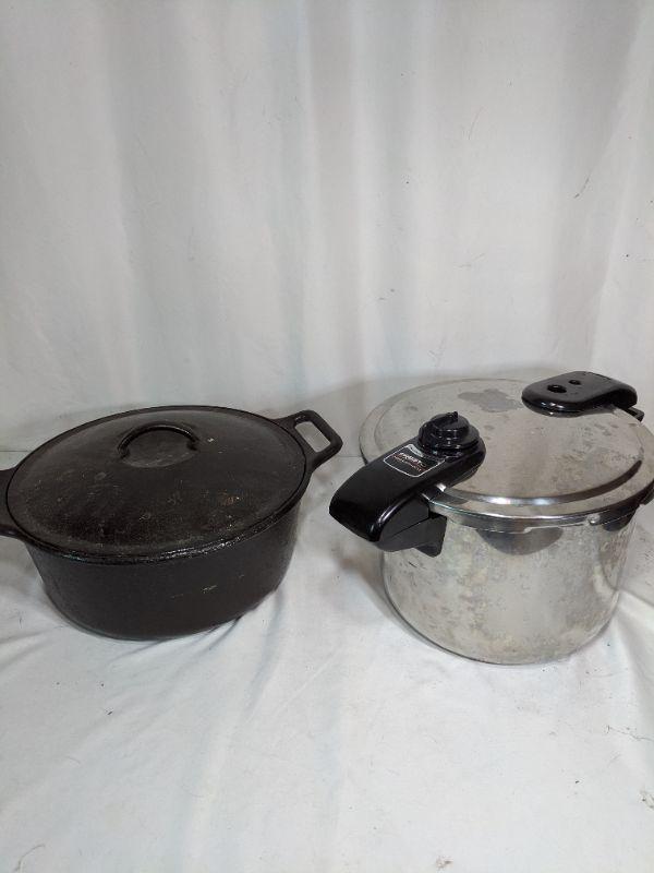 The first item it a Presto professional pressure cooker. It is in fair condition but has not been tested to see if it is funtional. The second item is a Lodge Cast Iron Dutch Oven P12D3. The Lodge has large scratches on the bottom, it’s been well loved, see images. It can hold up to 7 quarts for all your roasting needs! Local pick up only.