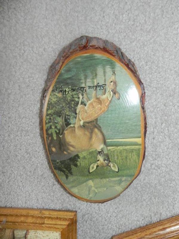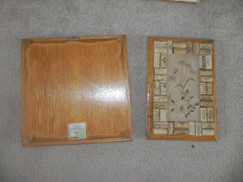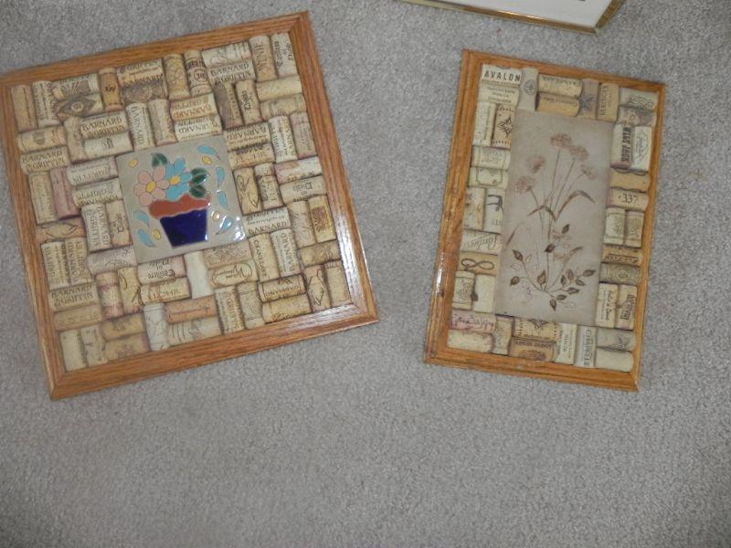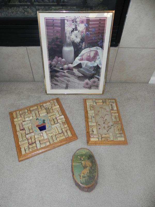 FRAMED KITCHEN SCENE, PICTURE OF DEER ON SLAB OF TREE, 2 PIECES OF DECORATIVE TILE SURROUNDED BY CORKS