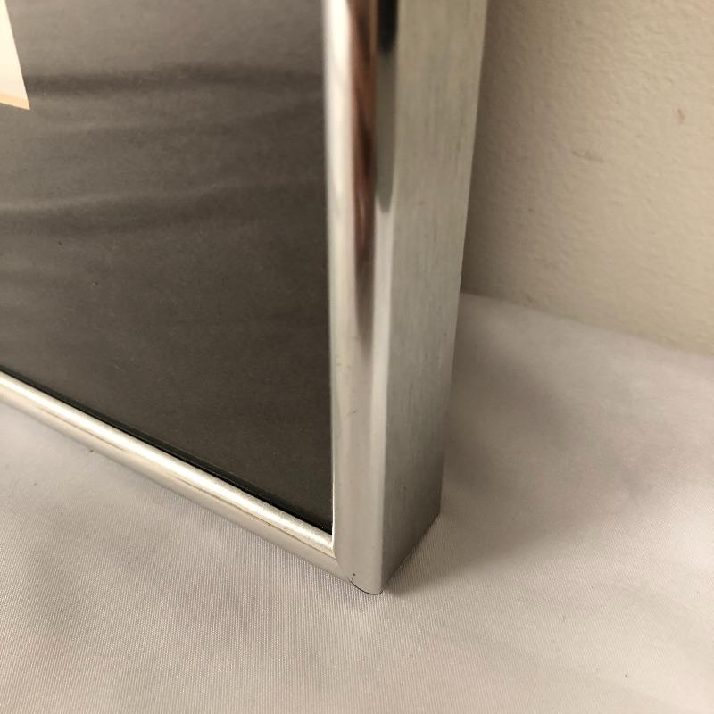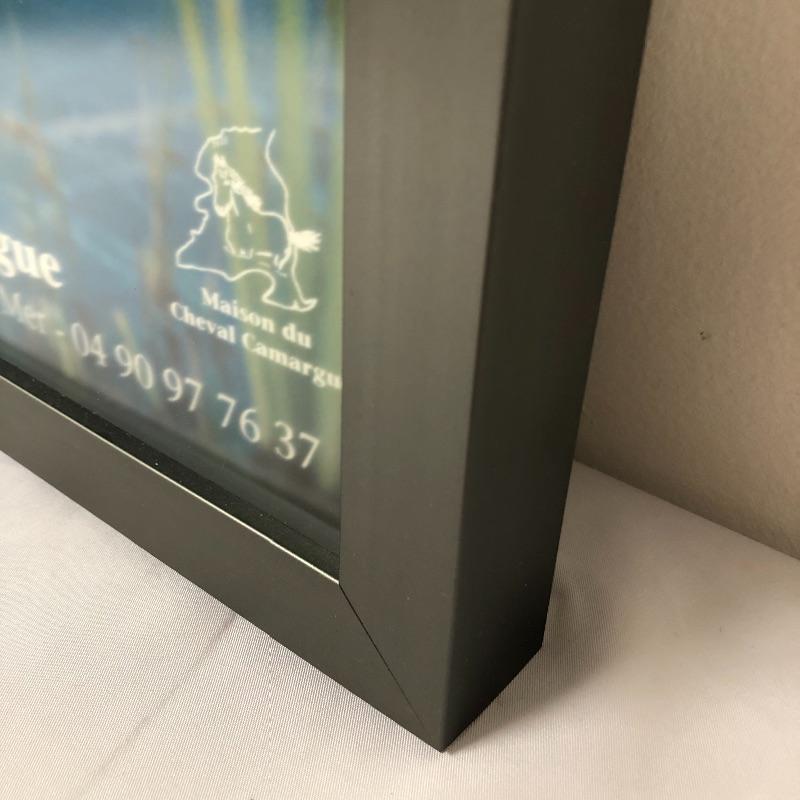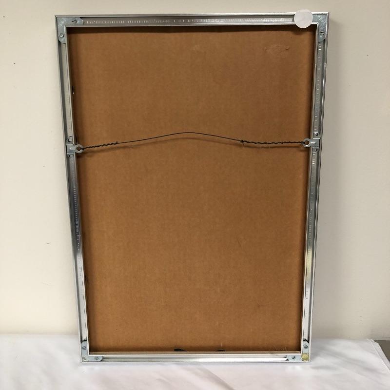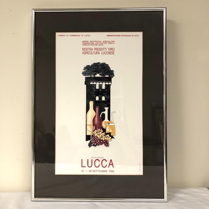 The larger poster depicting a horse measures 17” x 25,” and is framed in metal behind glass, and the back is in great condition. The smaller poster that reads “Lucca” measures 14.5” x 21,” and is framed in metal and matted, and the back is in great condition. Both are in French language.