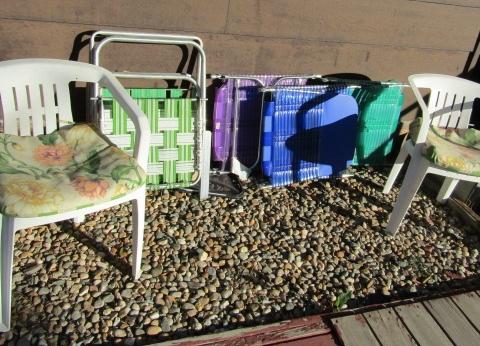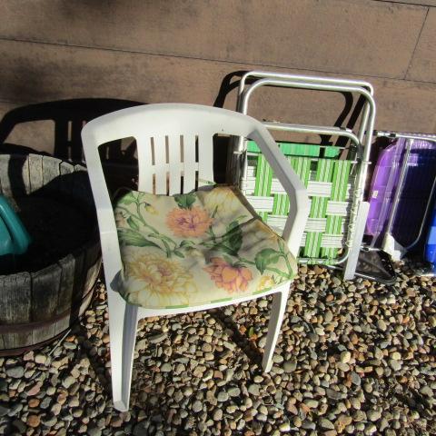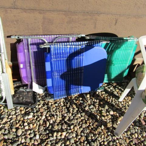 3 LOUNGE CHAIRS, 2 LAWN CHAIRS AND 2 PLASTIC PATIO CHAIRS