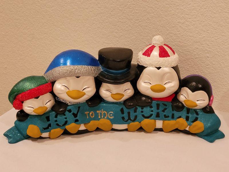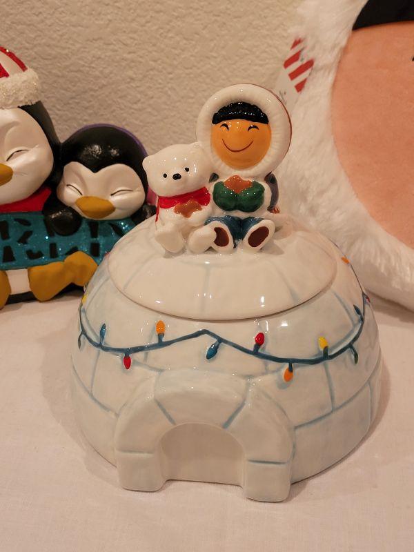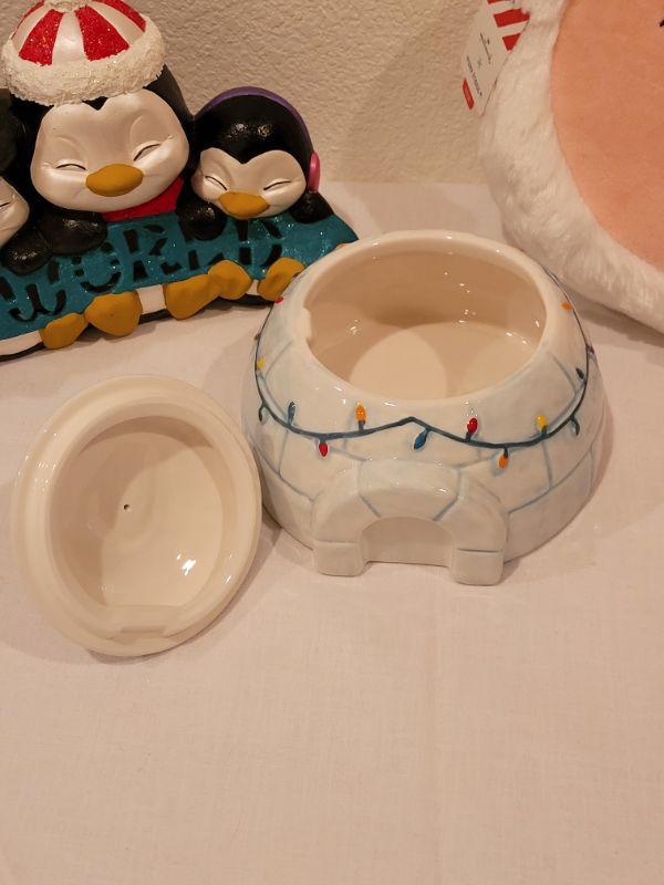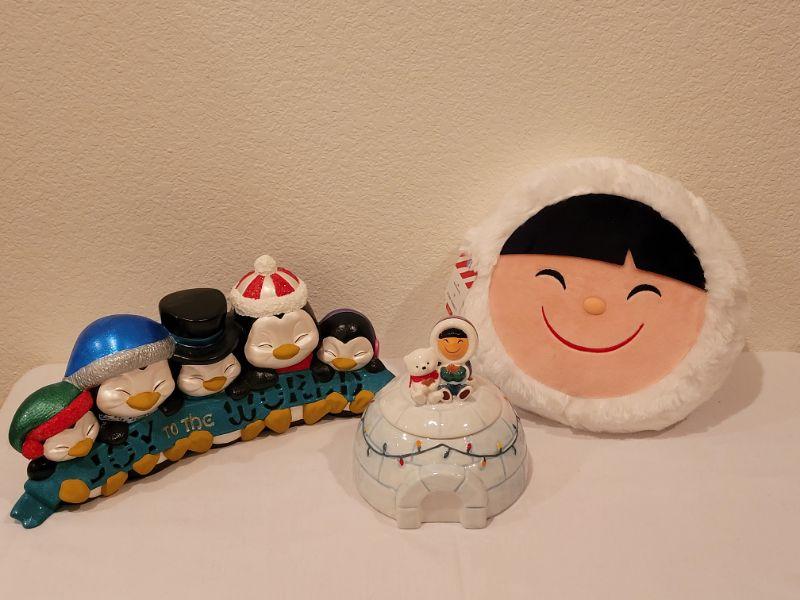Lot 112: NEW Frosty Friends Pillow, Cookie Jar and Penguin Candle Deco