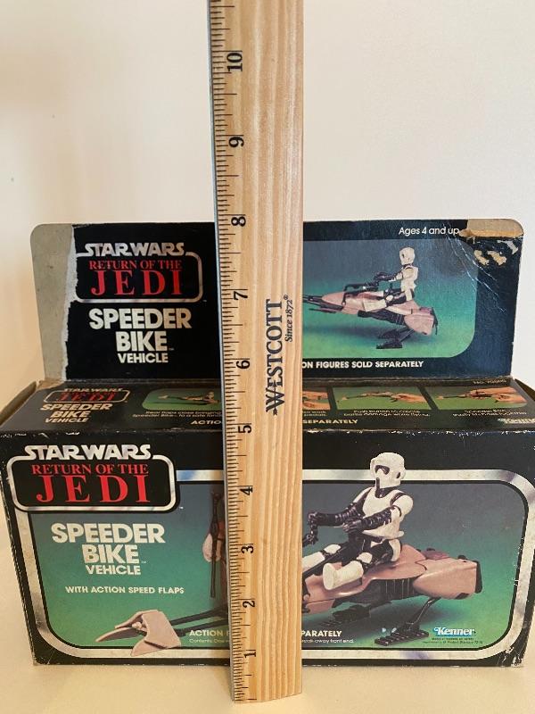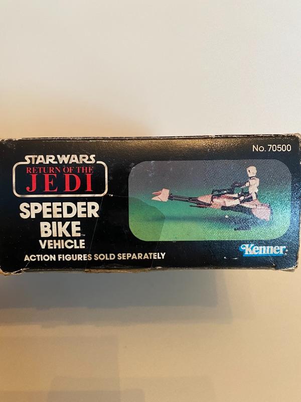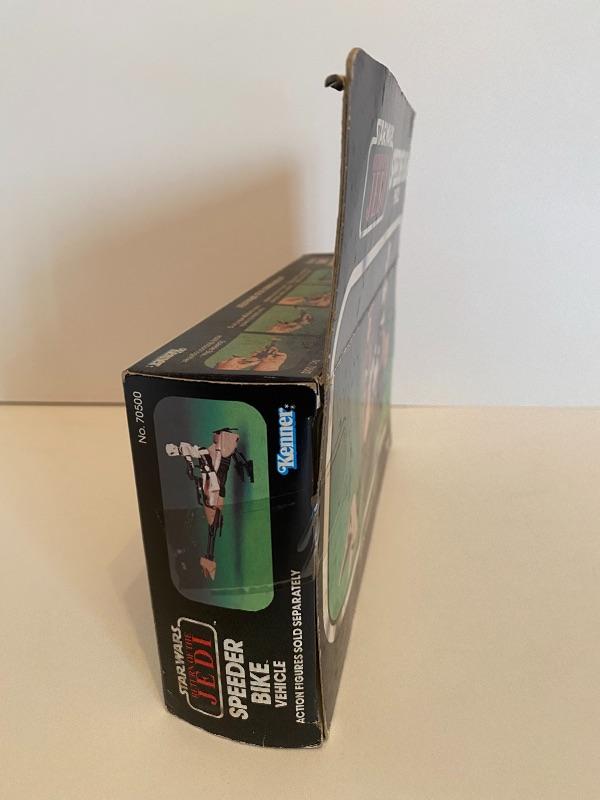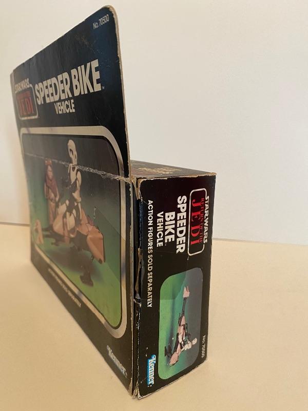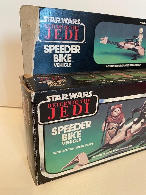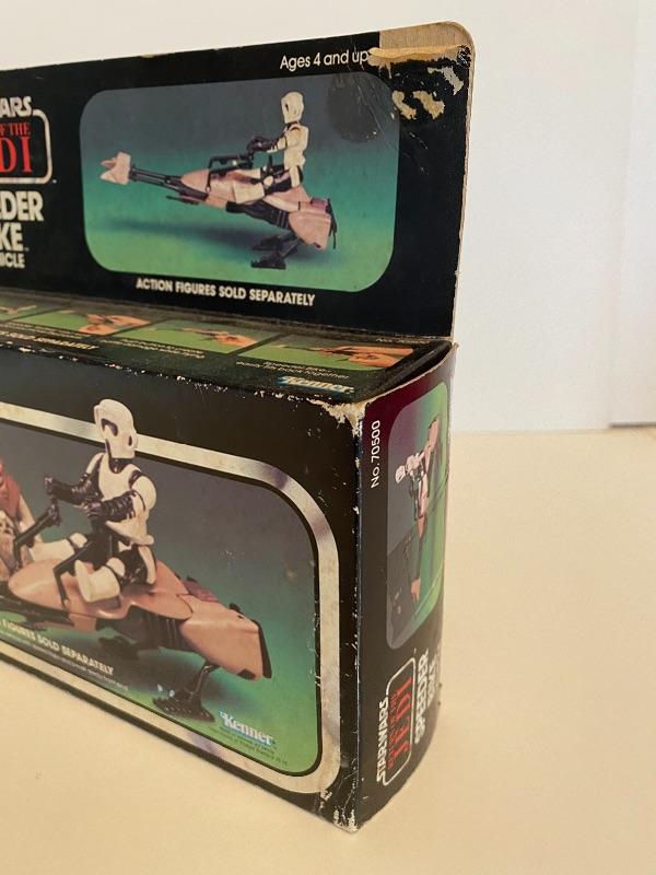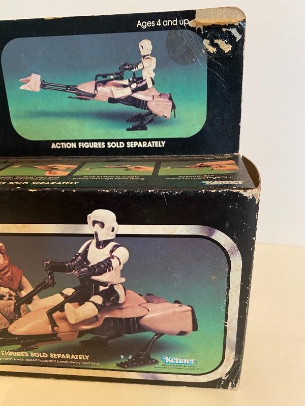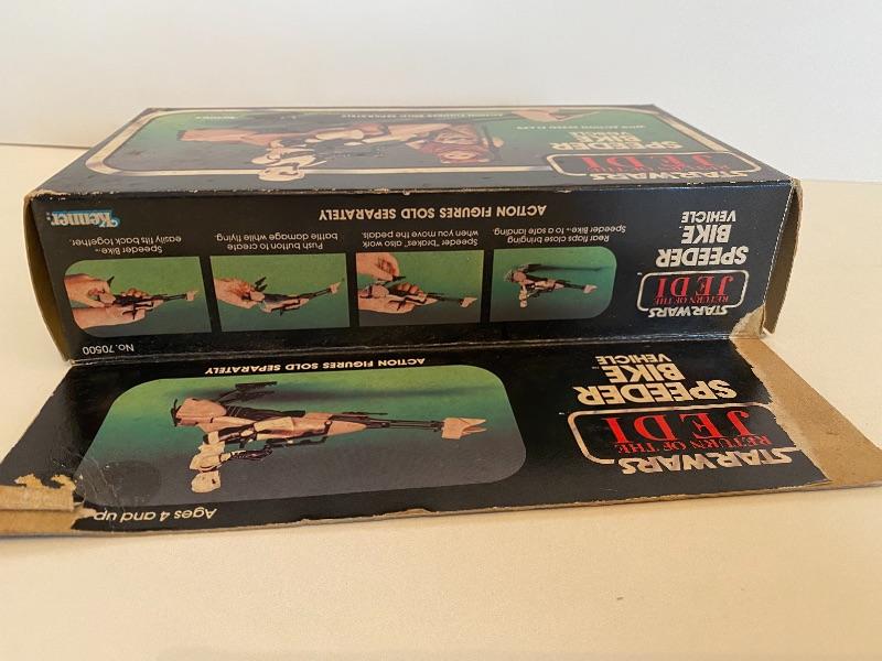 The speeder inside is new, but the box is opened and does show wear. All collectibles have been photographed from every angle as they are the best representation of the item. While items may be listed as new, they are vintage or new old stock, and have been stored for some time. Please check all pictures for the edges of the packaging, as these are vintage the glue from the seal may have come loose, and if so, a picture will show. Please see pictures for exactly what you are getting and the condition. Anything extra about the condition will be noted at the beginning of the description. Thank you for looking and have fun bidding.