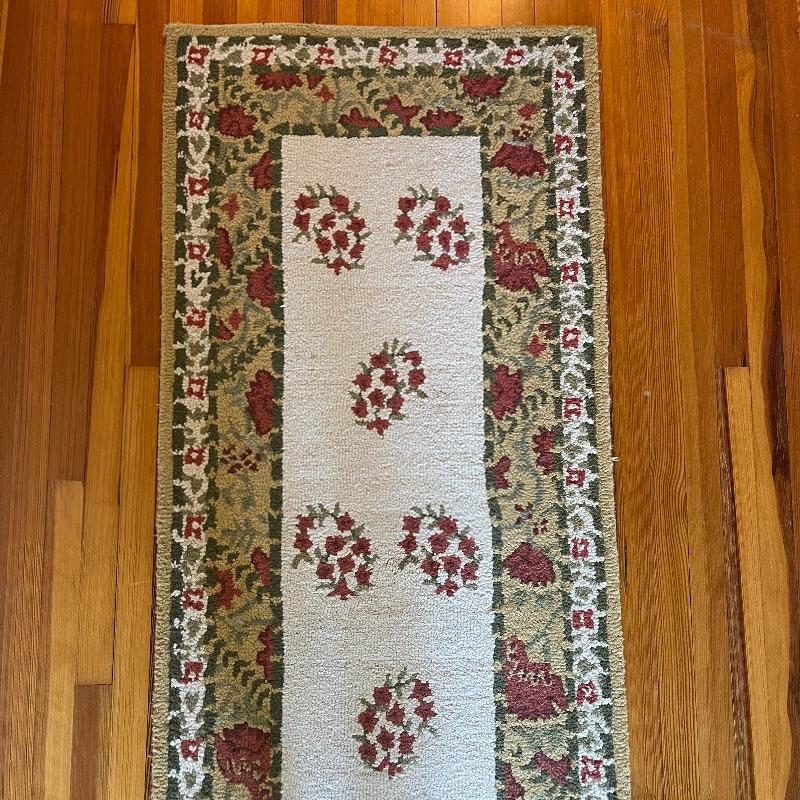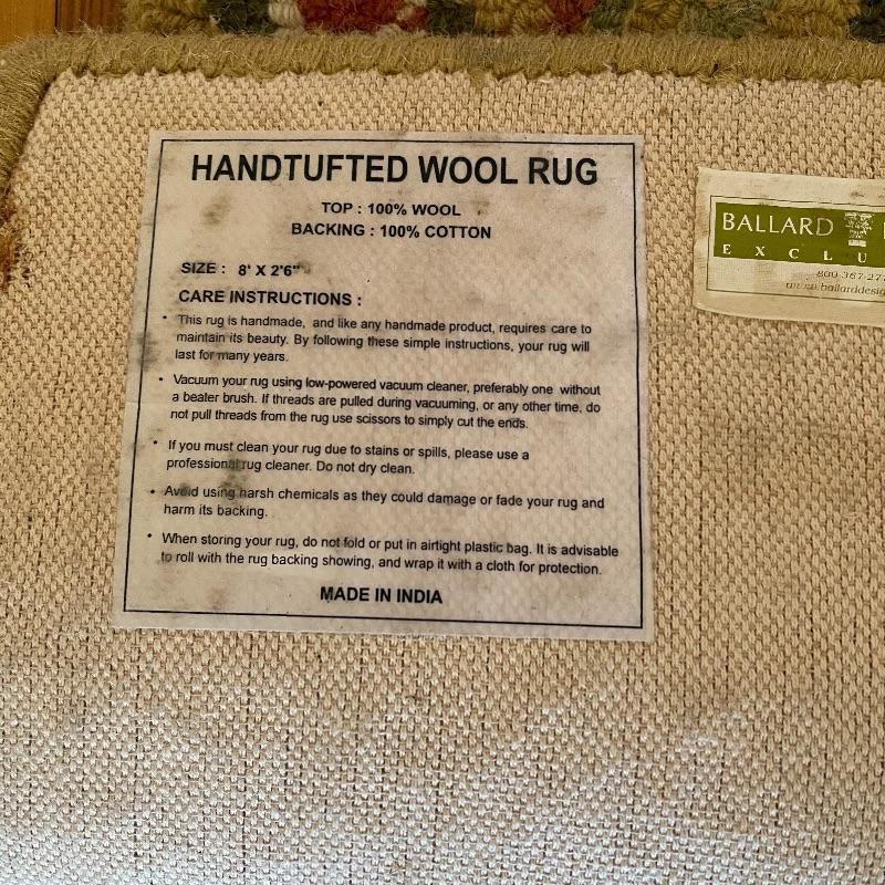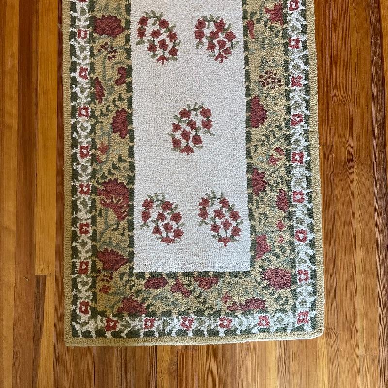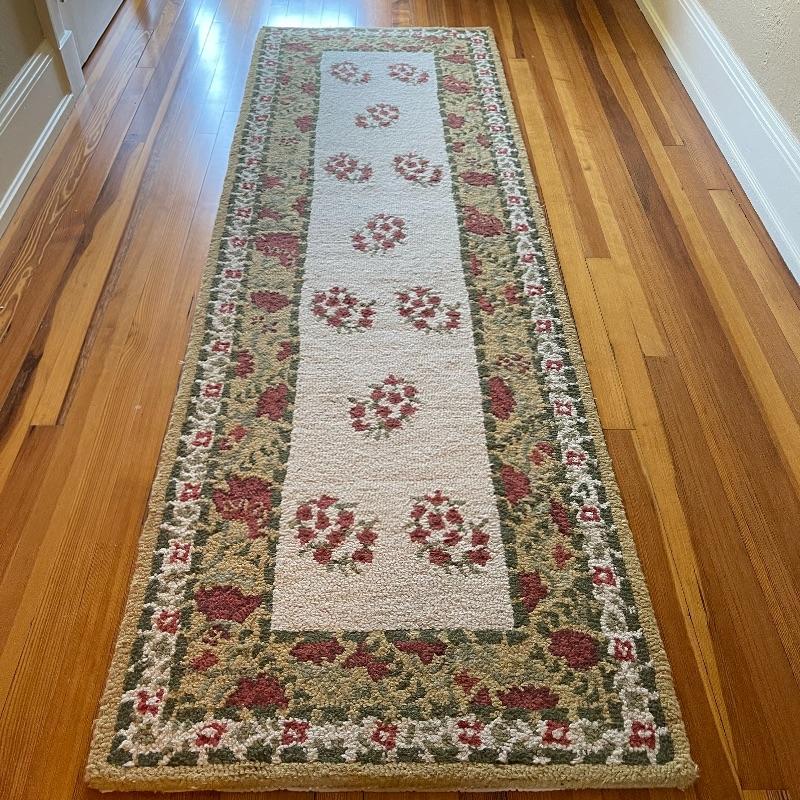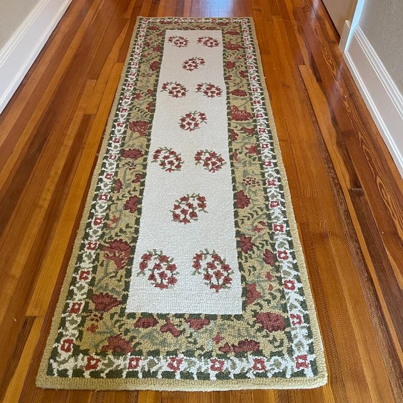 Handtufted wool rug runner. This 8ft x 2ft 6 inch wool rug is handmade and is from Ballard Designs Exclusive. The pattern is floral with red flowers, green leaves and borders, and white and mustard backgrounds.
