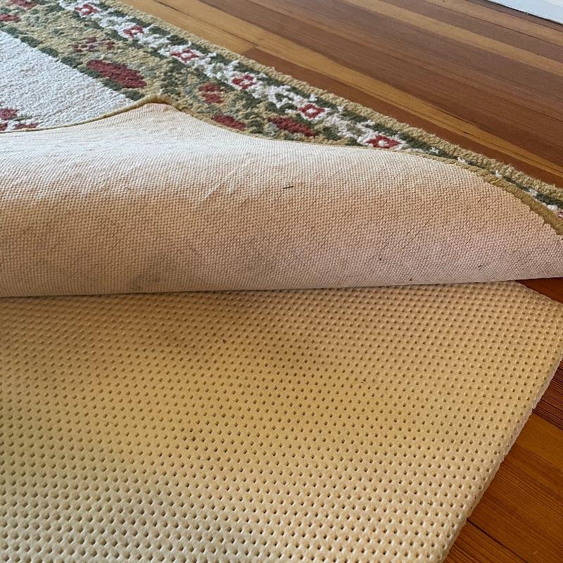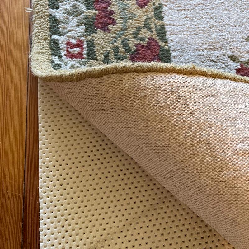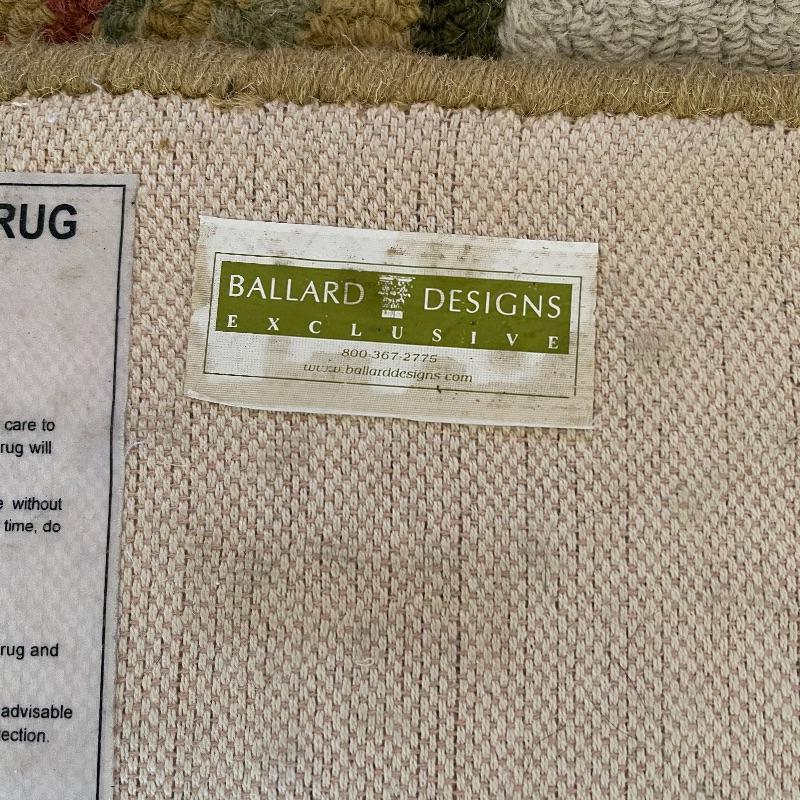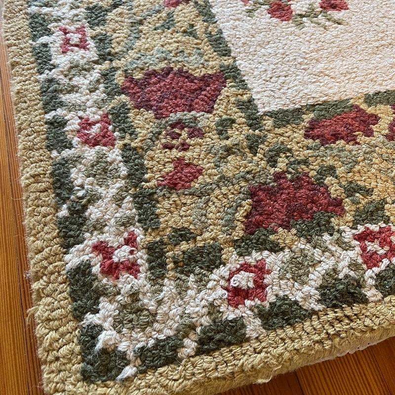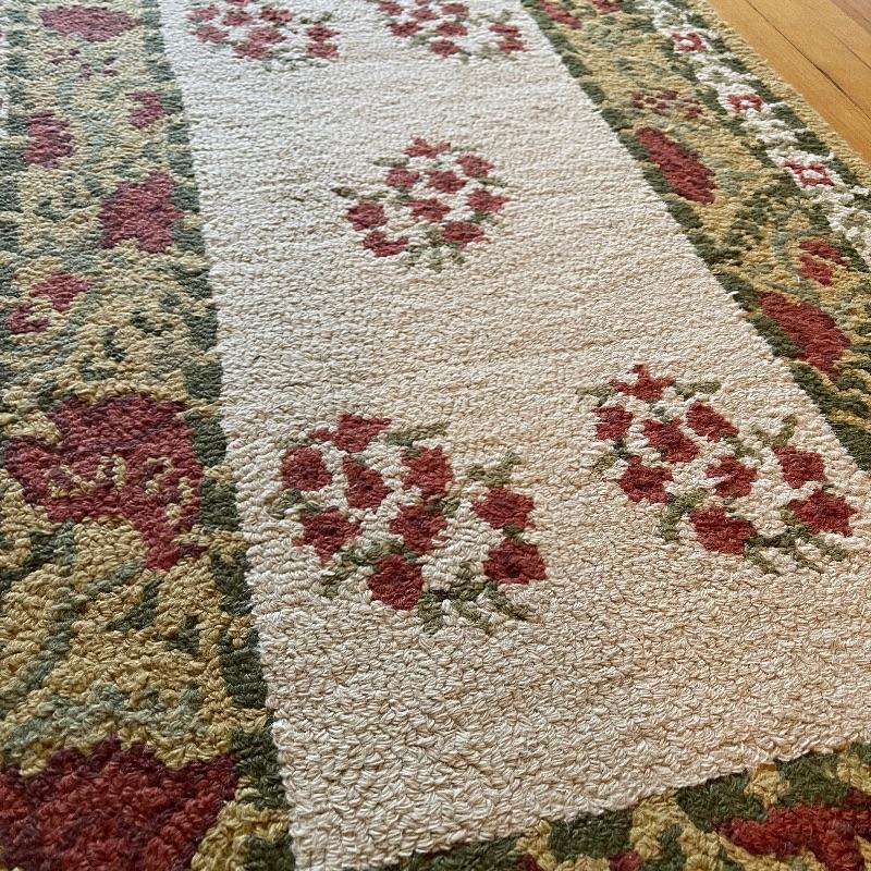 Handtufted wool rug runner. This 8ft x 2ft 6 inch wool rug is handmade and is from Ballard Designs Exclusive. The pattern is floral with red flowers, green leaves and borders, and white and mustard backgrounds.