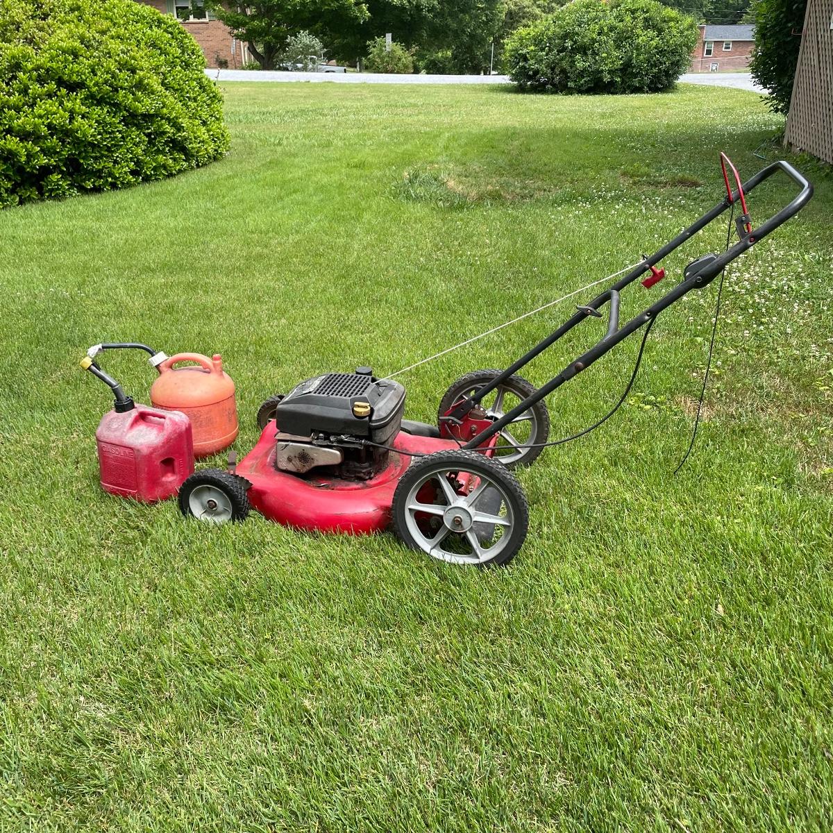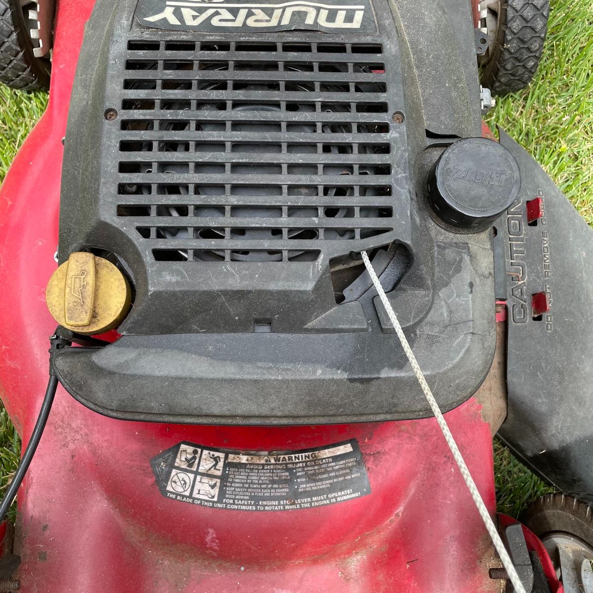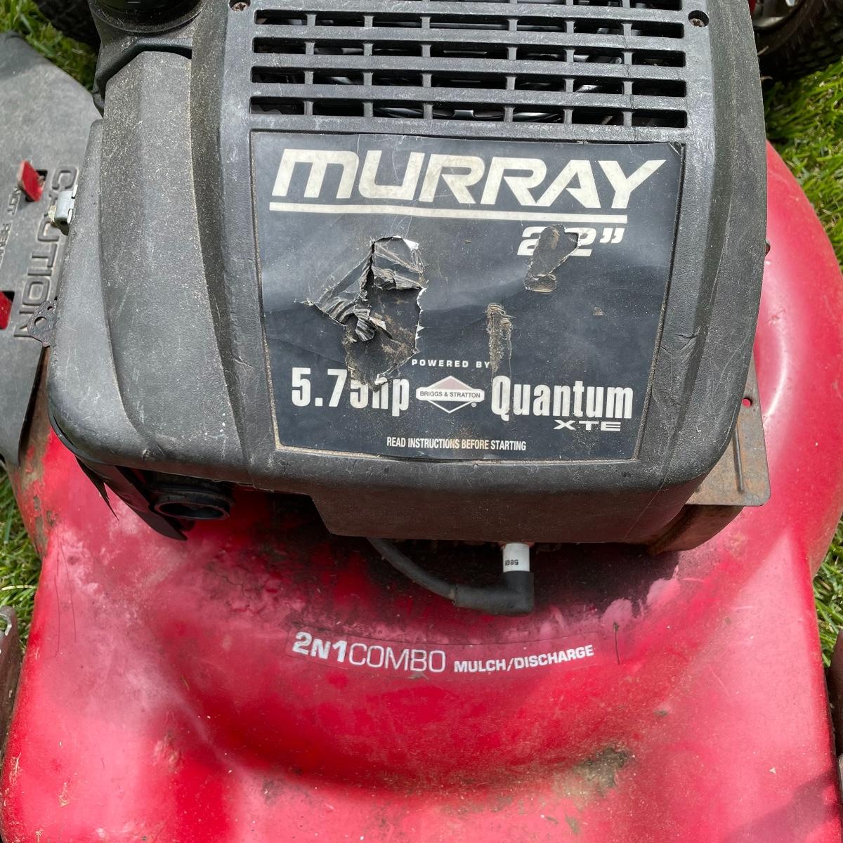 Murray 2N1 Combo Mulch/Discharge mower turned on when prompted. Mower runs on gas and has two 2-gallon gas cans included. One can has a fluid in it, but we cannot verify type or age of fluid. Mower’s hard plastic wheels appear to have a lot of life and machine rolls easily. See images. Local pick up only.