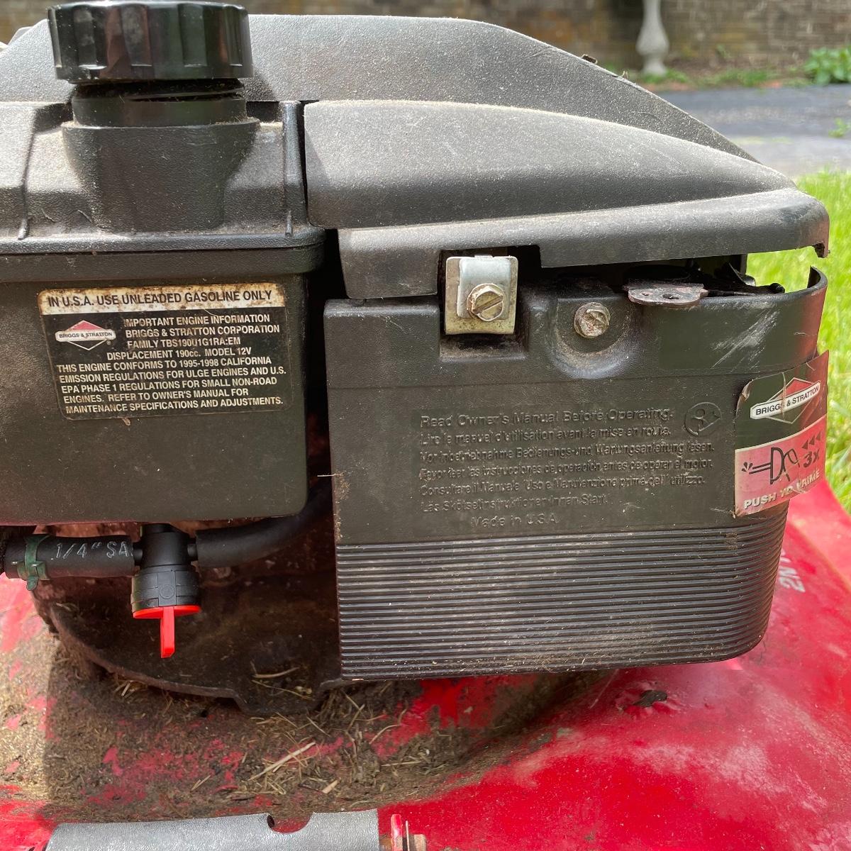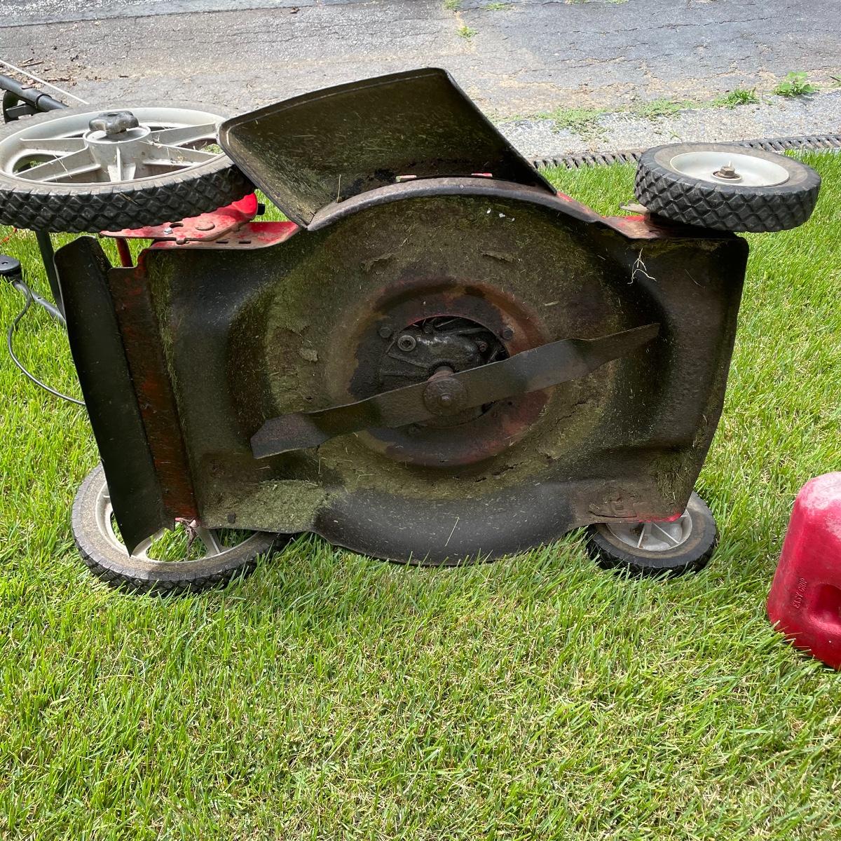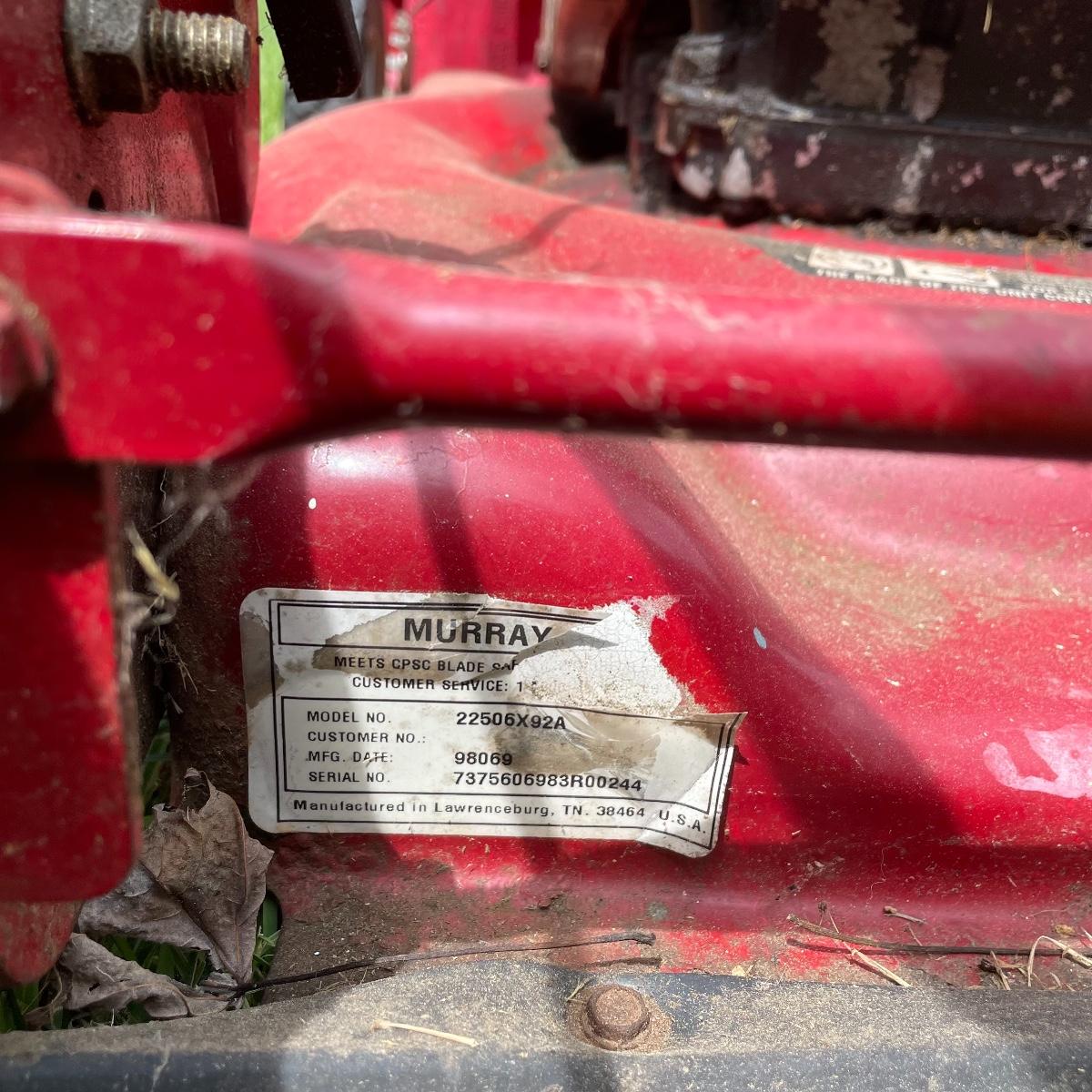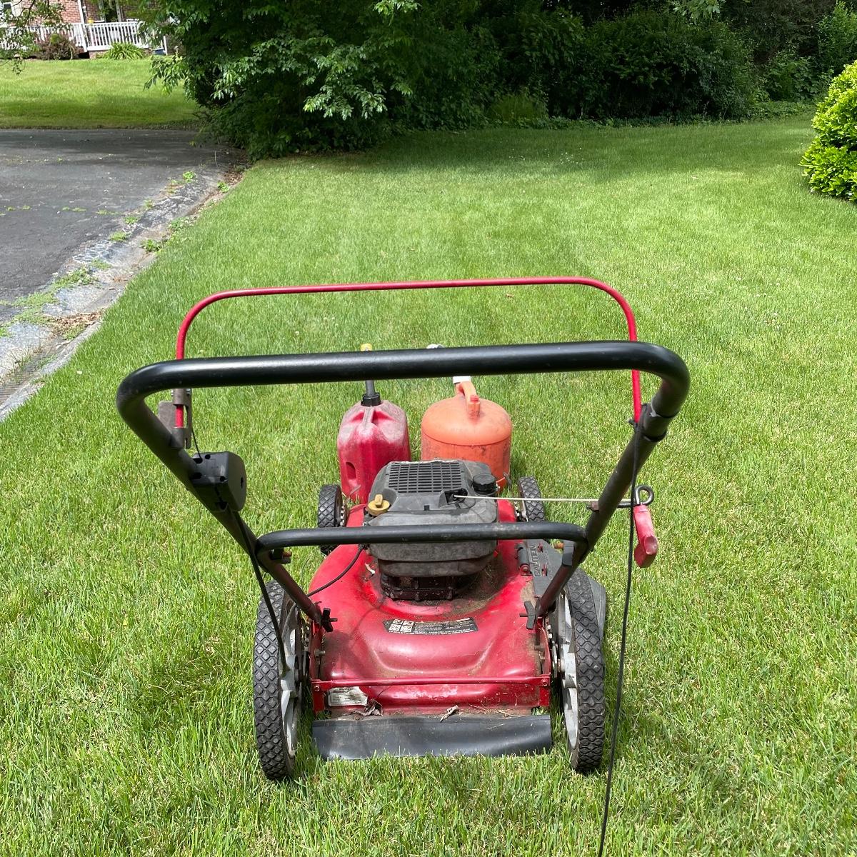 Murray 2N1 Combo Mulch/Discharge mower turned on when prompted. Mower runs on gas and has two 2-gallon gas cans included. One can has a fluid in it, but we cannot verify type or age of fluid. Mower’s hard plastic wheels appear to have a lot of life and machine rolls easily. See images. Local pick up only.