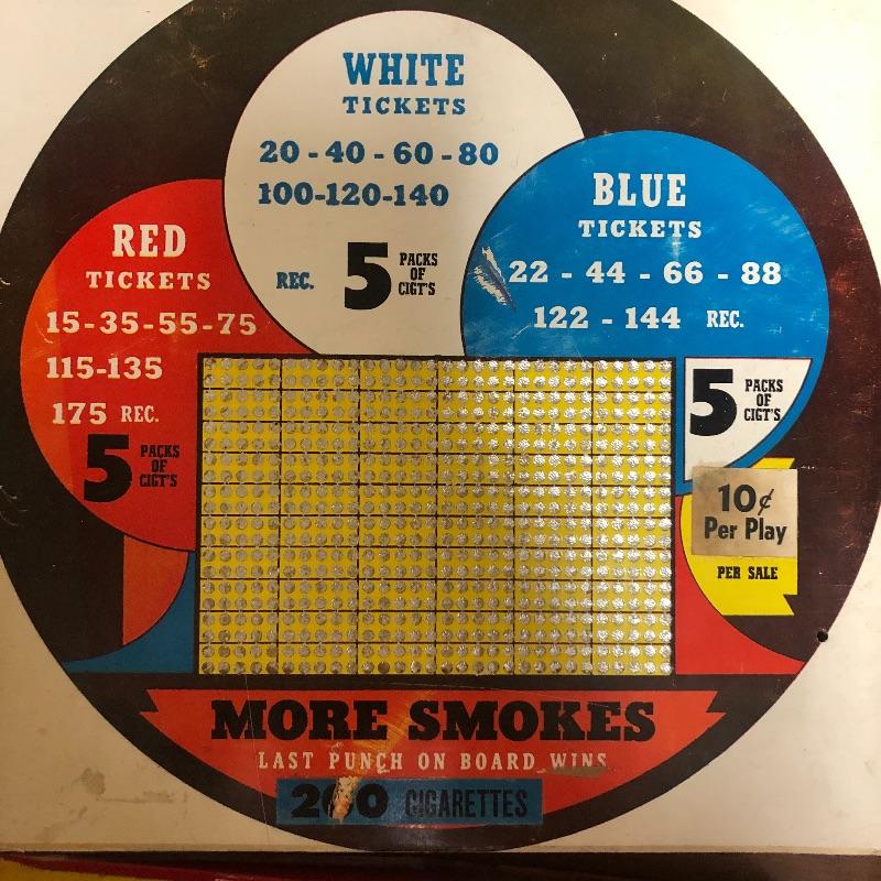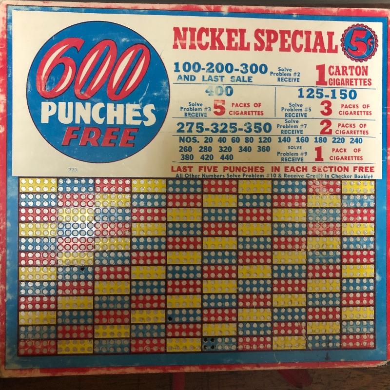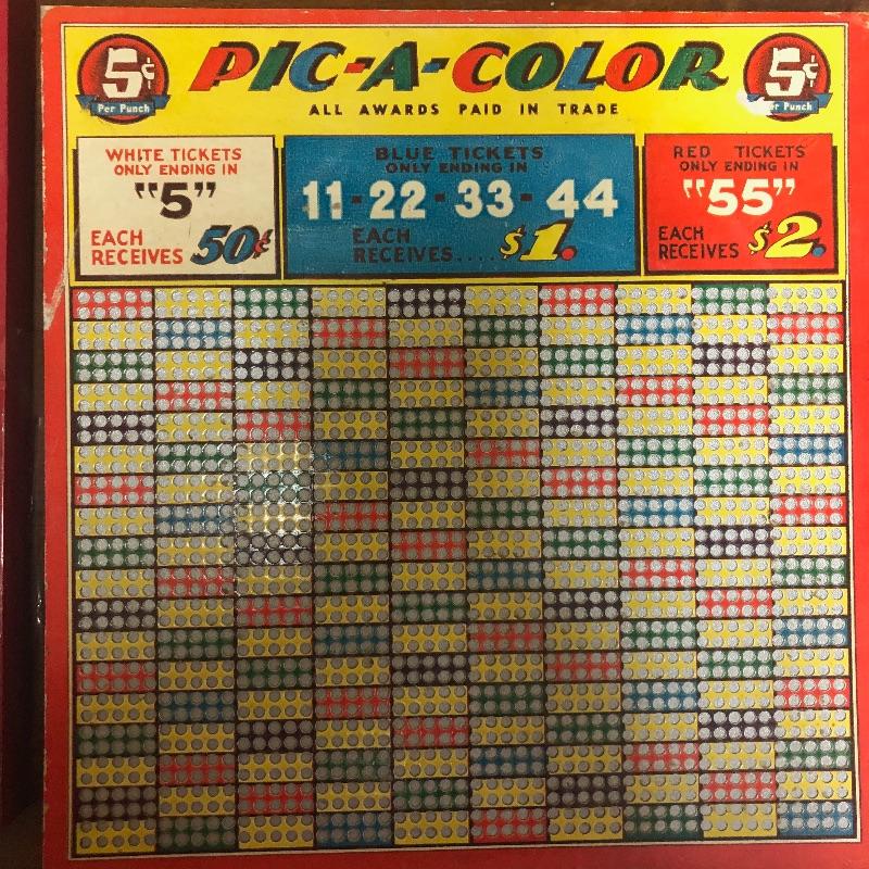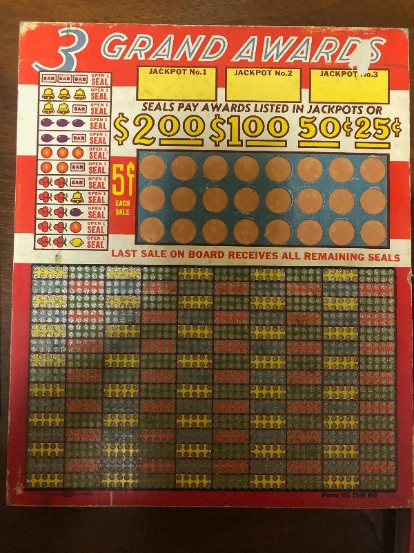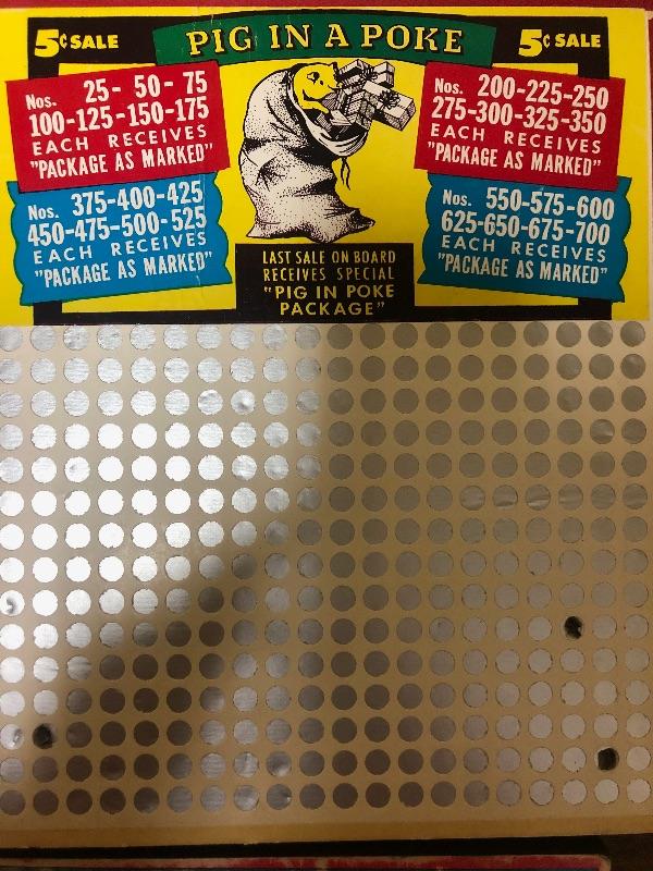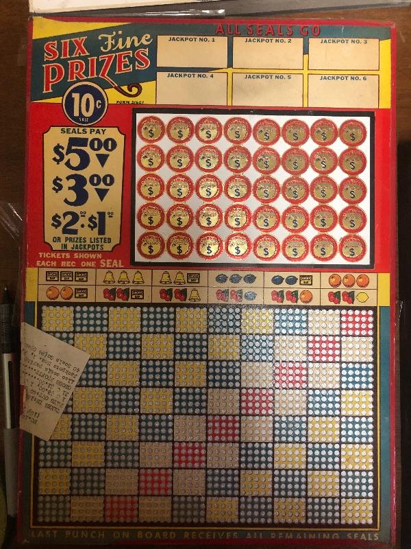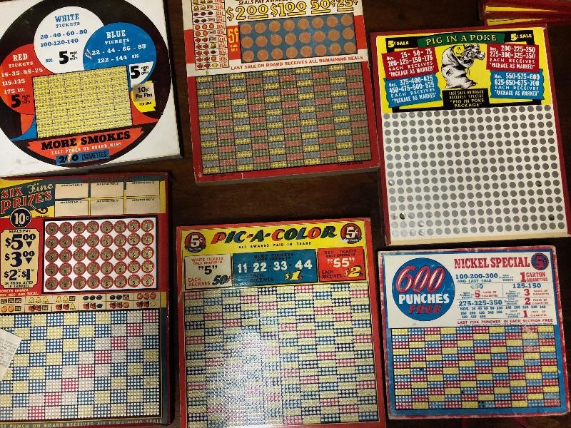 6 boards: White tickets, 3 Grand awards, pig in a poke (a couple of punches out of the board), nickel special) pic-a-color, all seals go: Vintage used condition