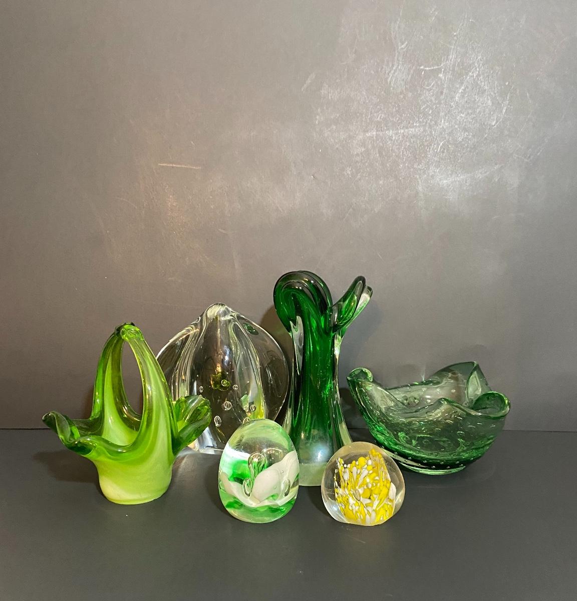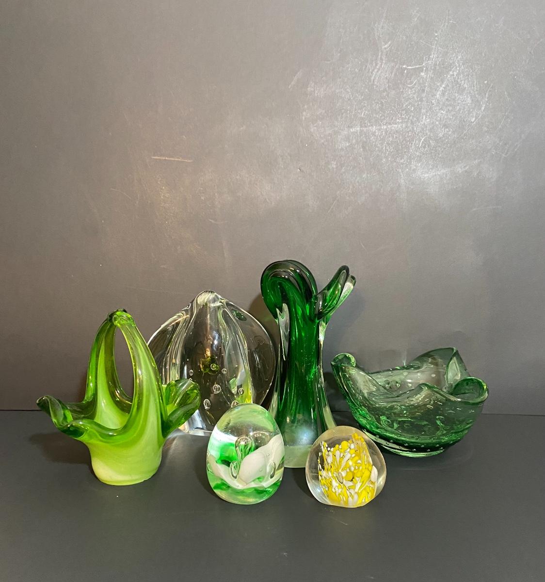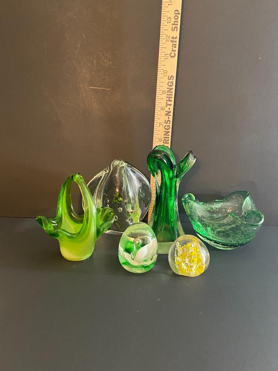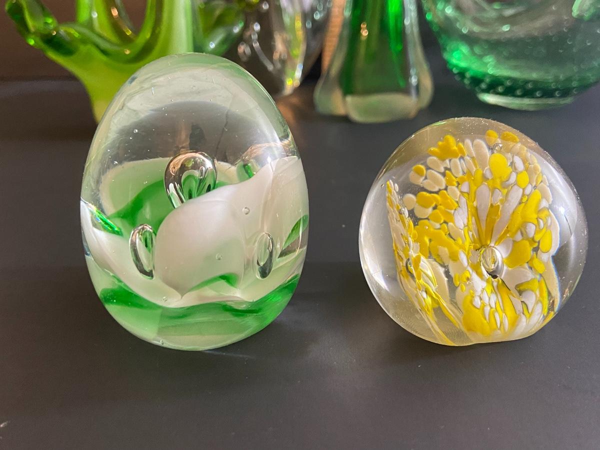 Lot 111; Beautiful lot of art glass pieces vase, basket, paperweights.
