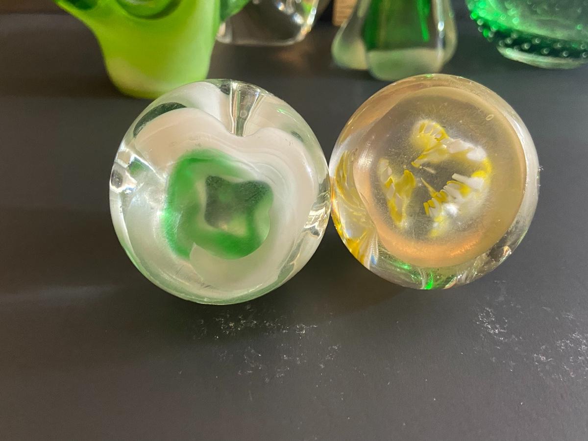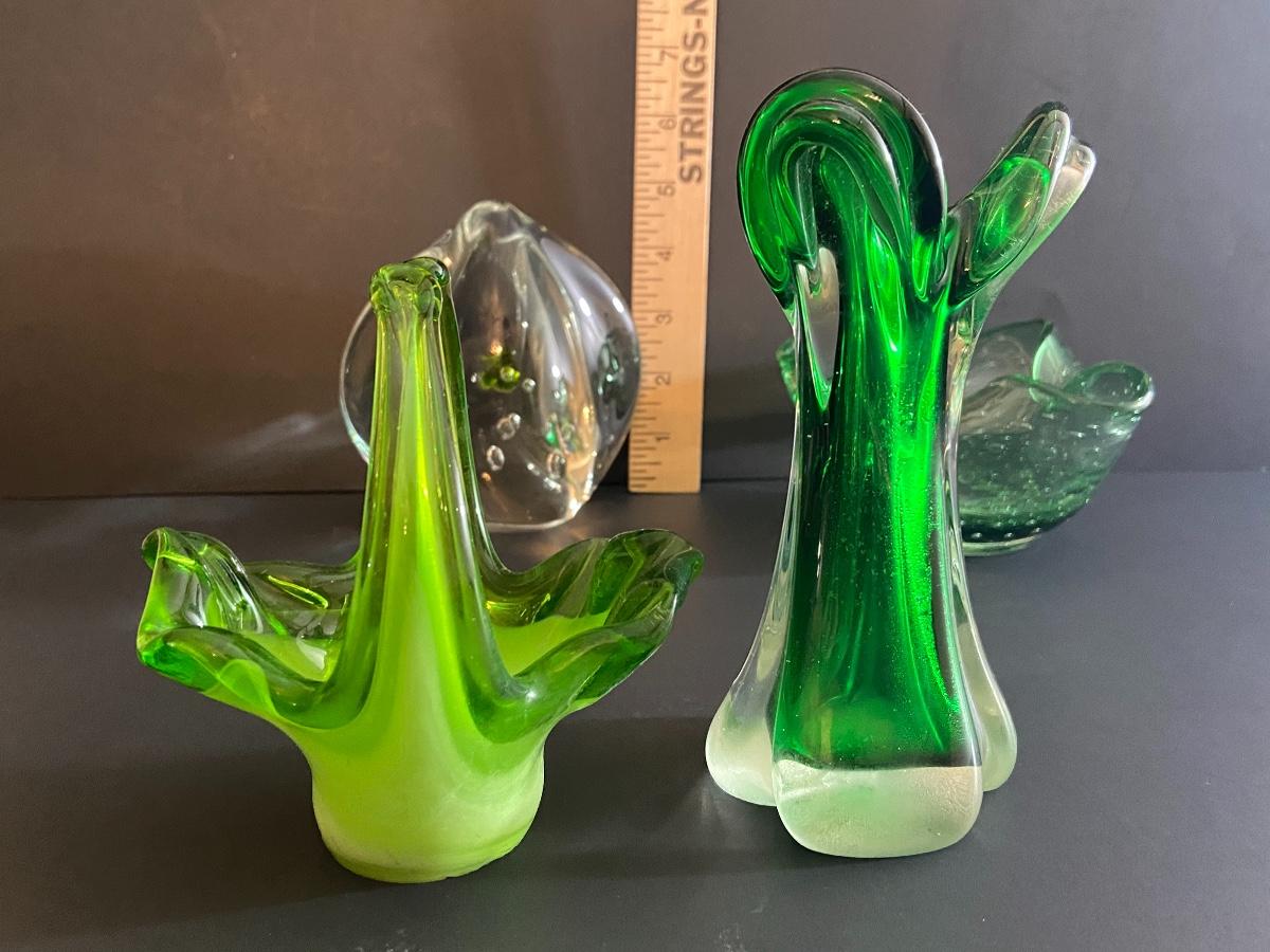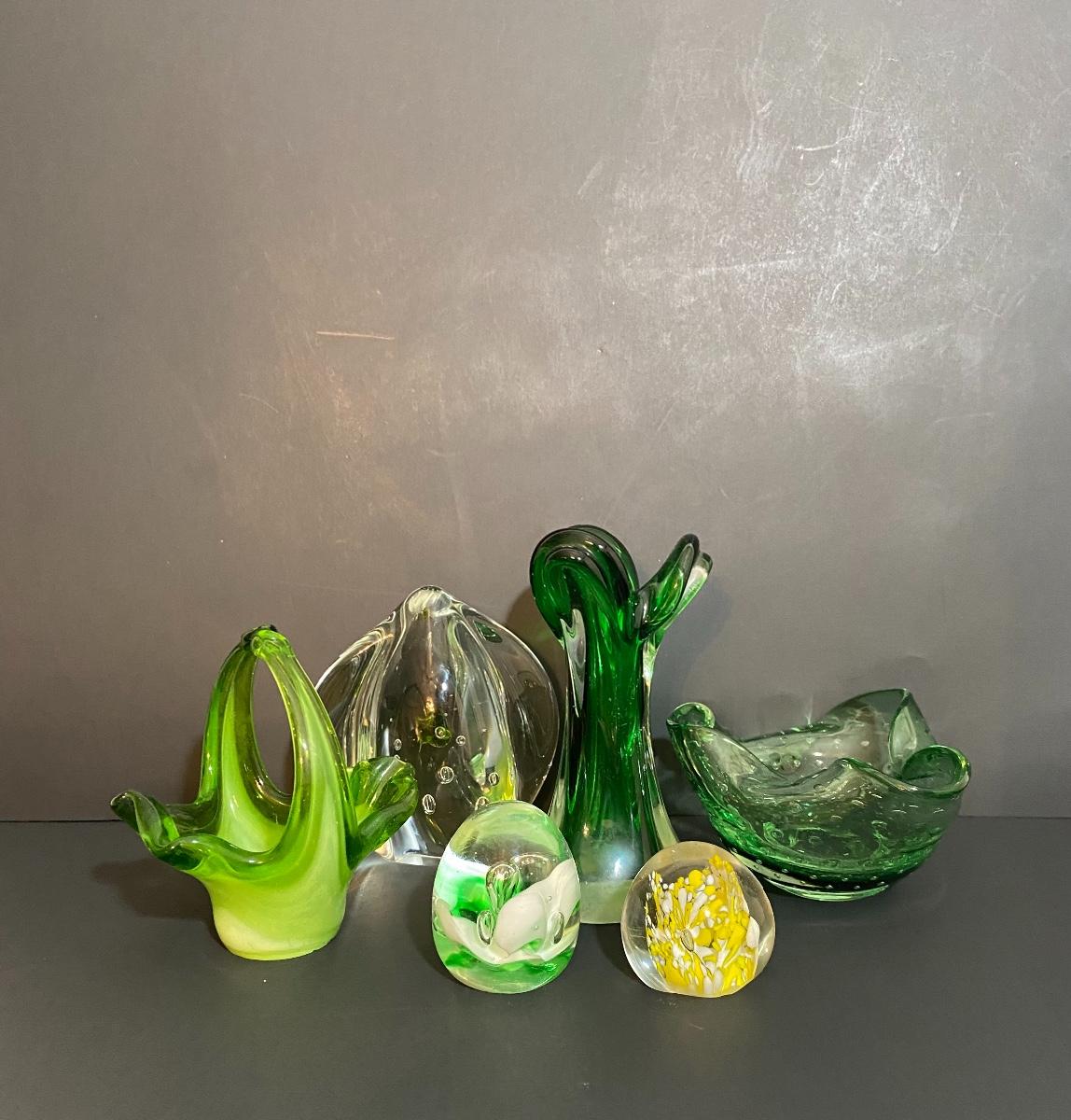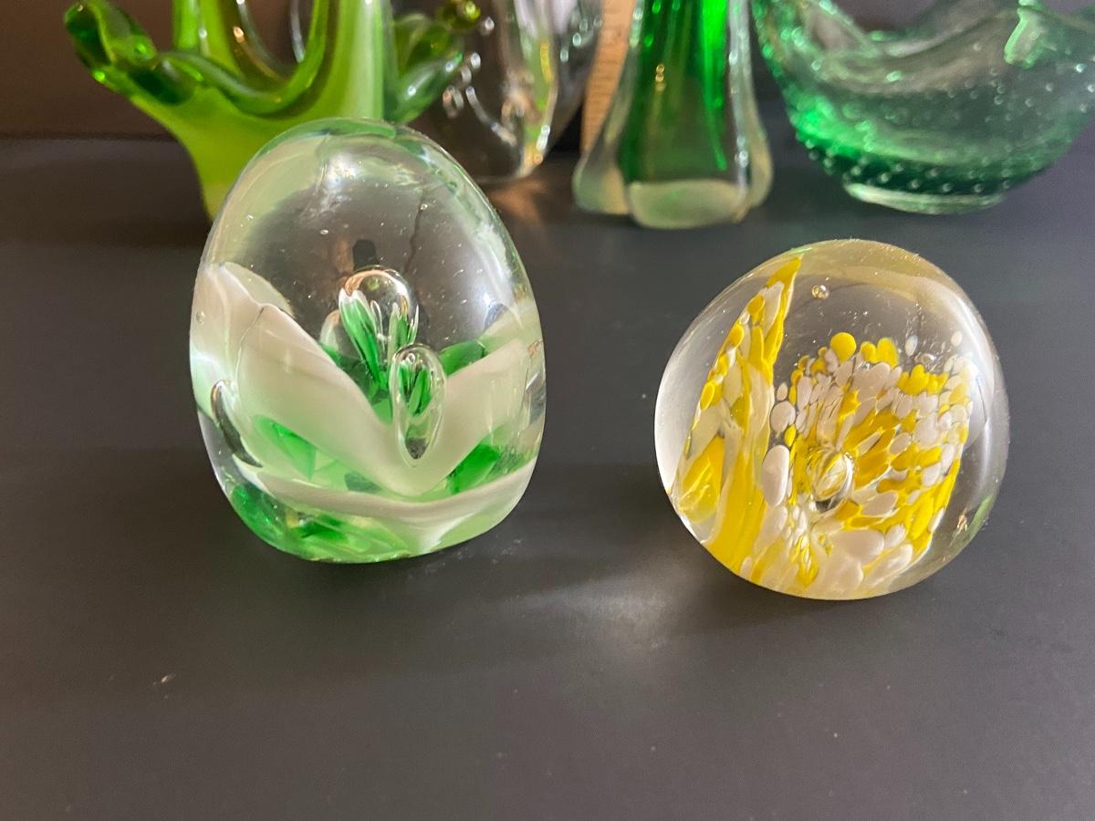 Lot 111; Beautiful lot of art glass pieces vase, basket, paperweights.
