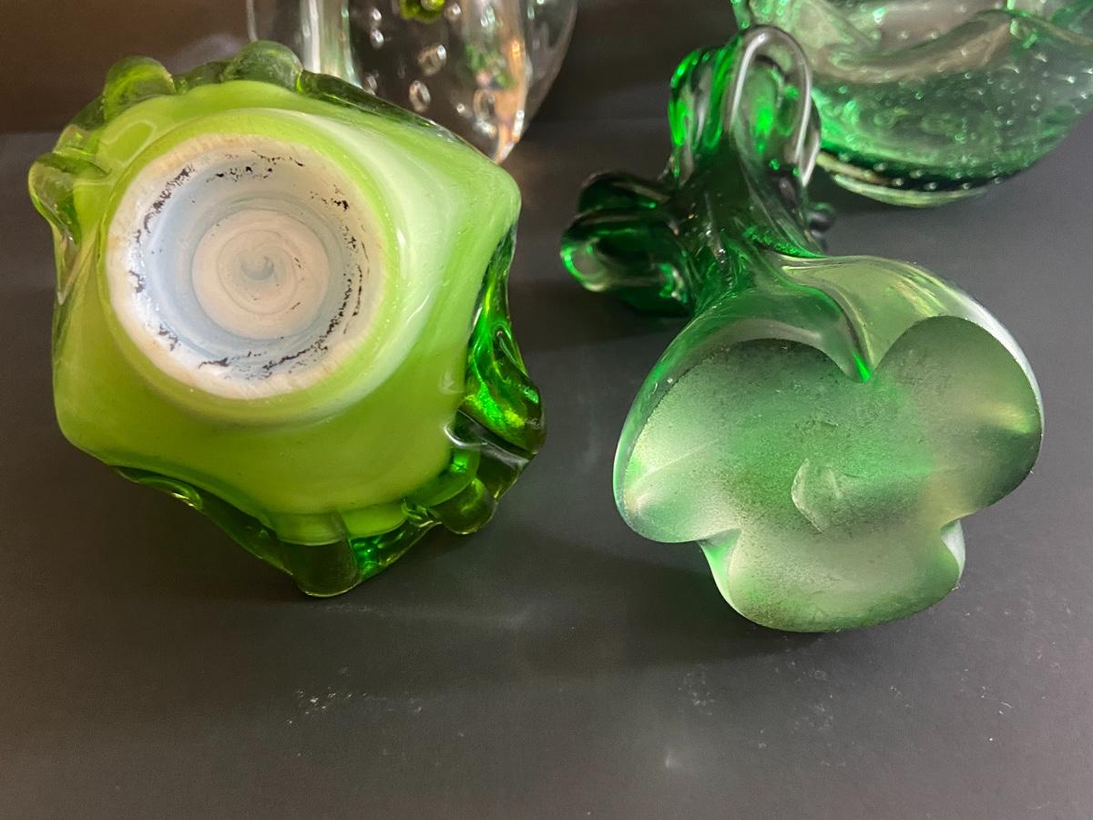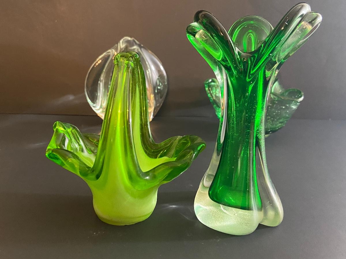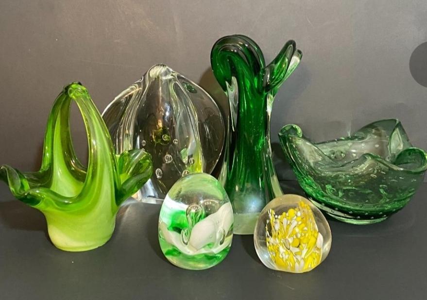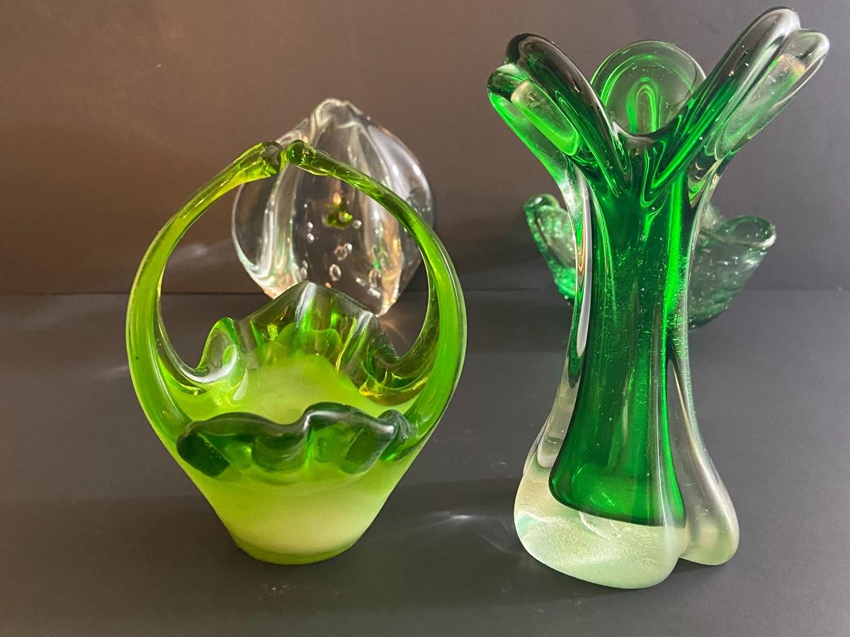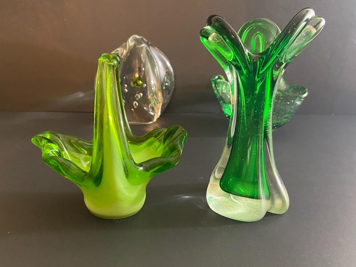 Lot 111; Beautiful lot of art glass pieces vase, basket, paperweights.