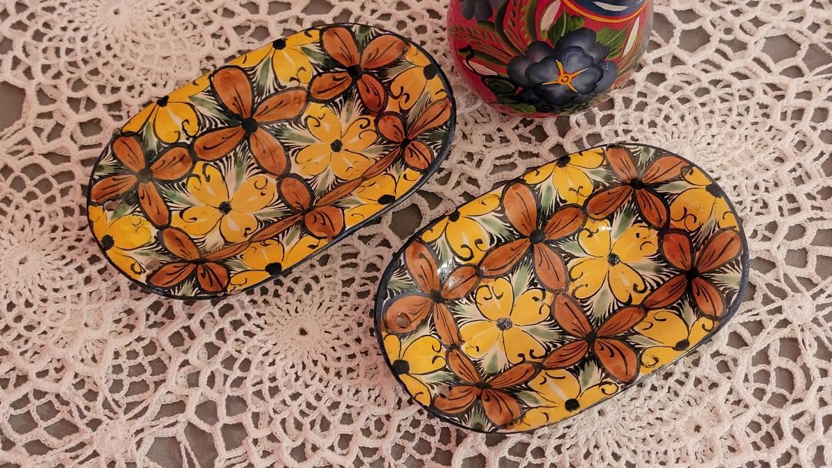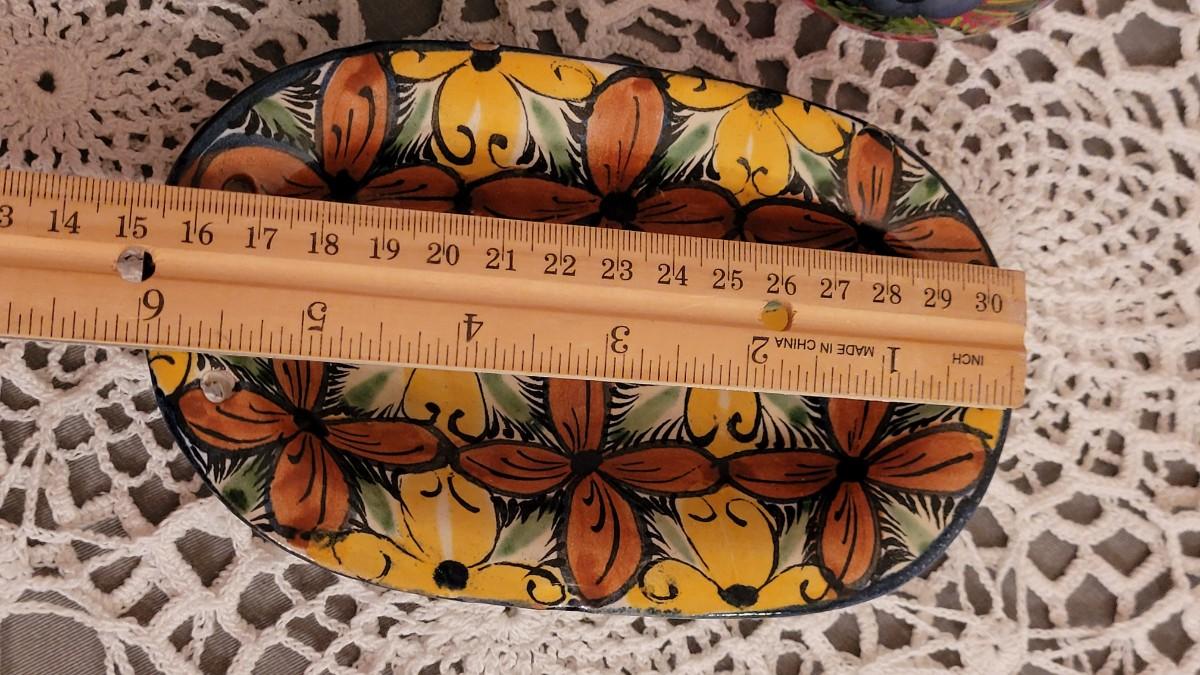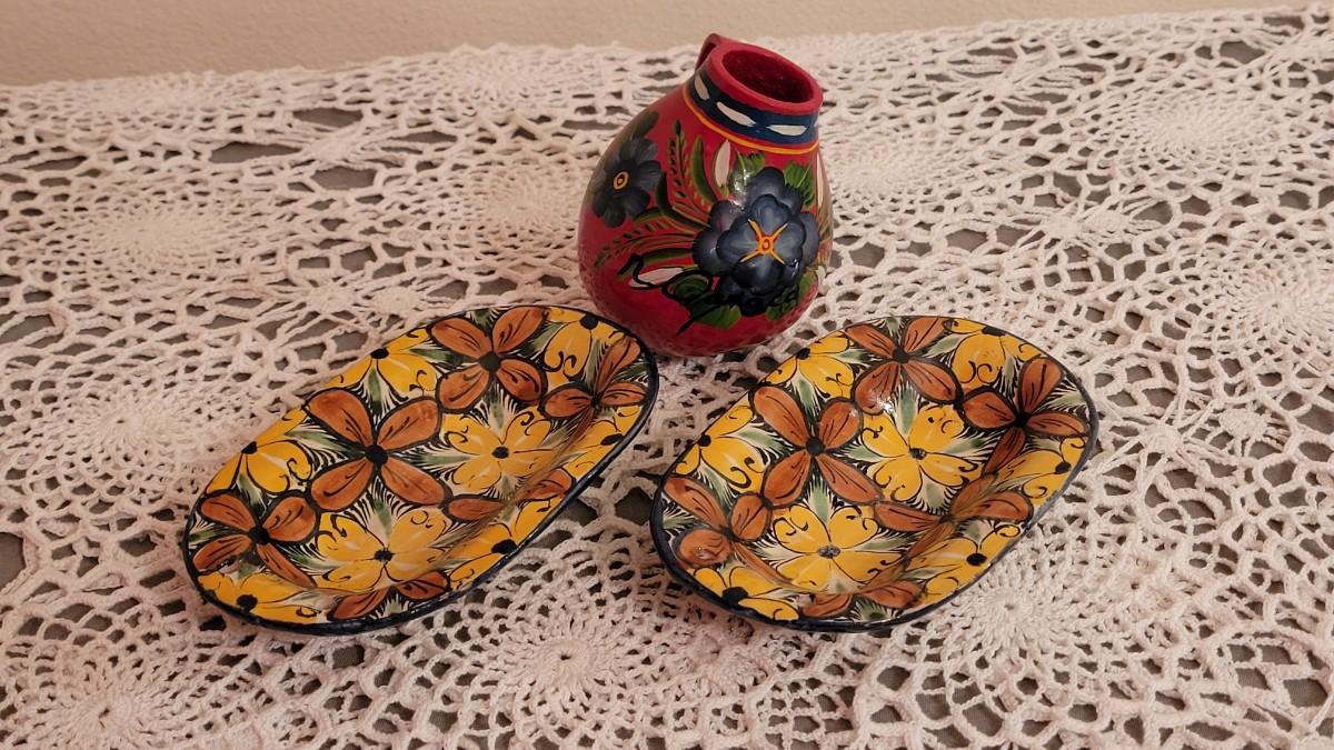 Lot 111: (2) Mexican Folk Art Talavera Pottery Small Dishes and Gourd Jug